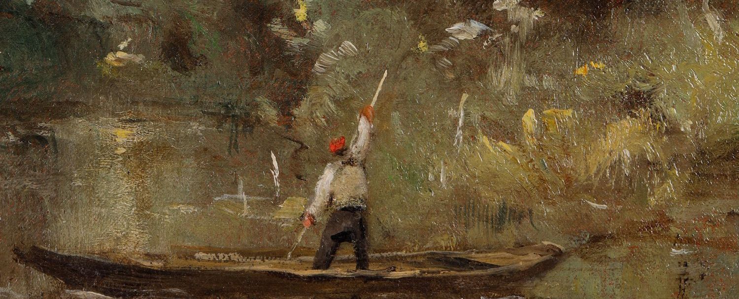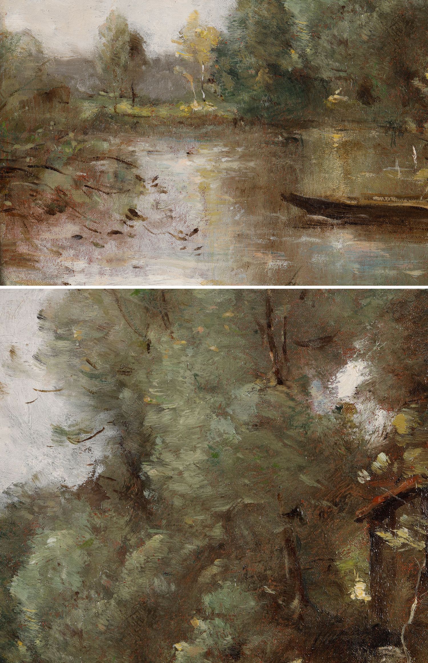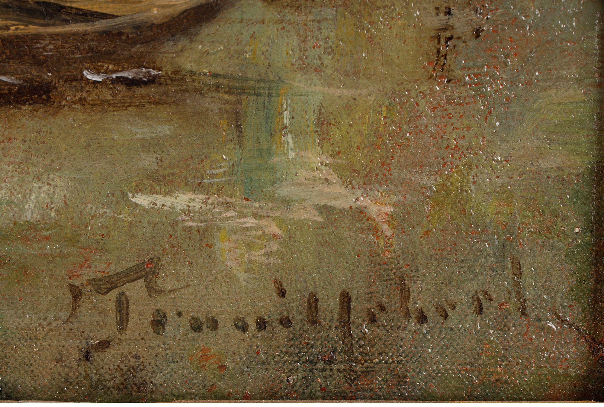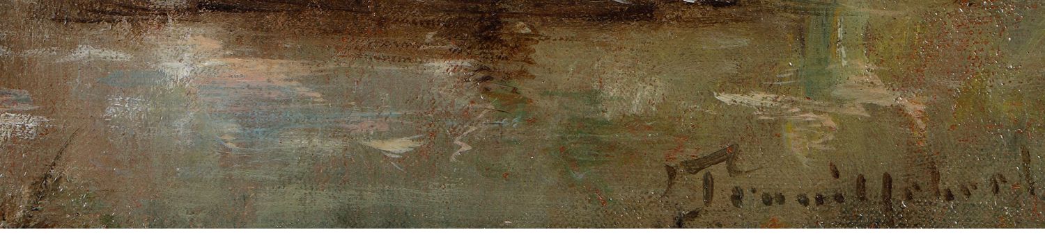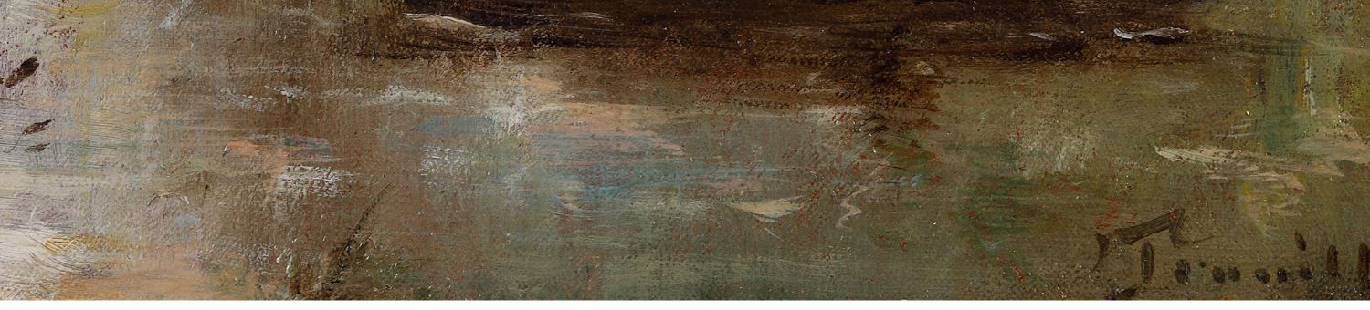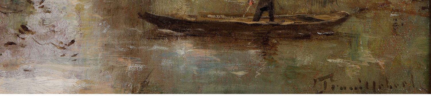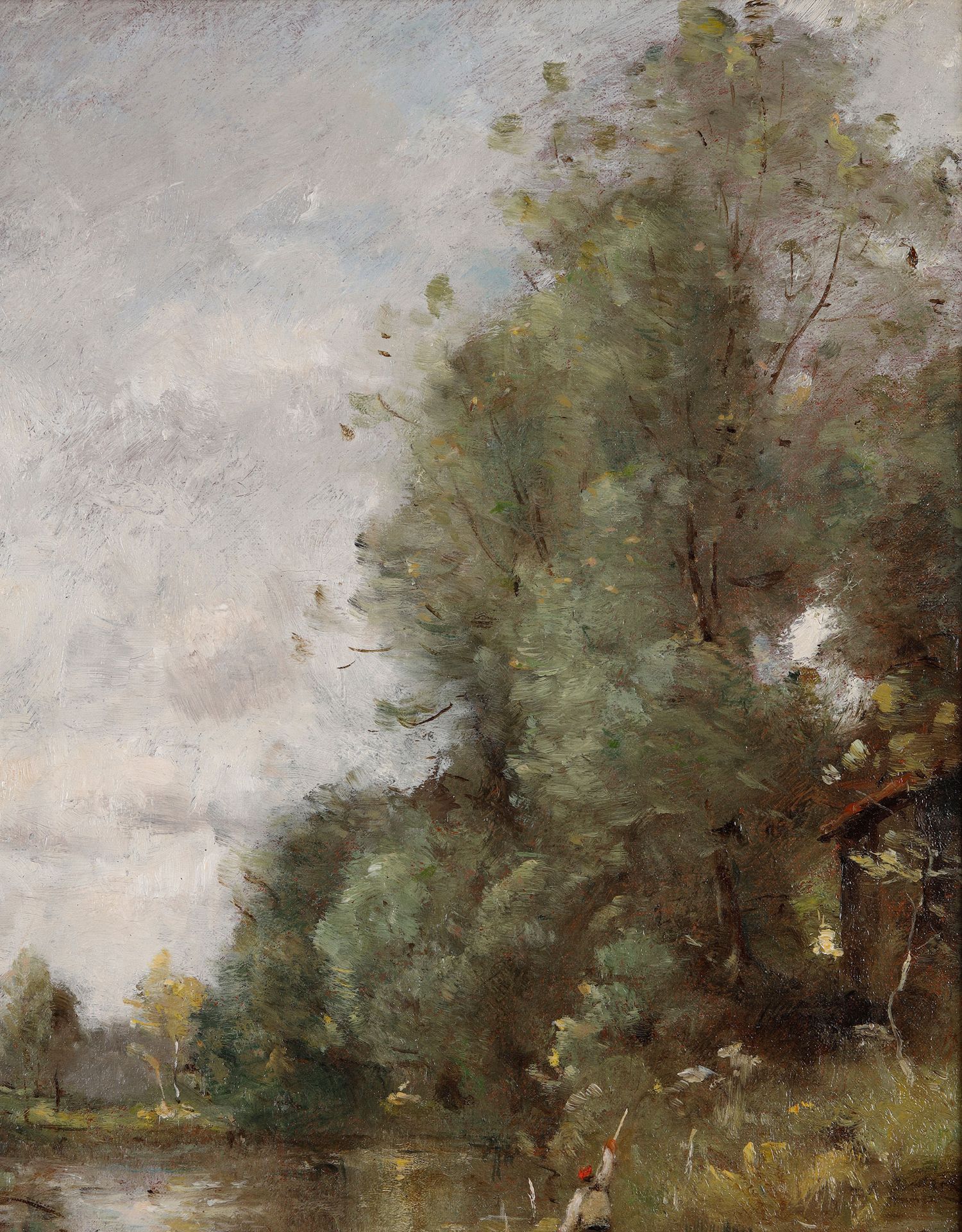 独角鹿西洋古董法国巴比松派画家风景布面油画《河上泛舟的渔民》