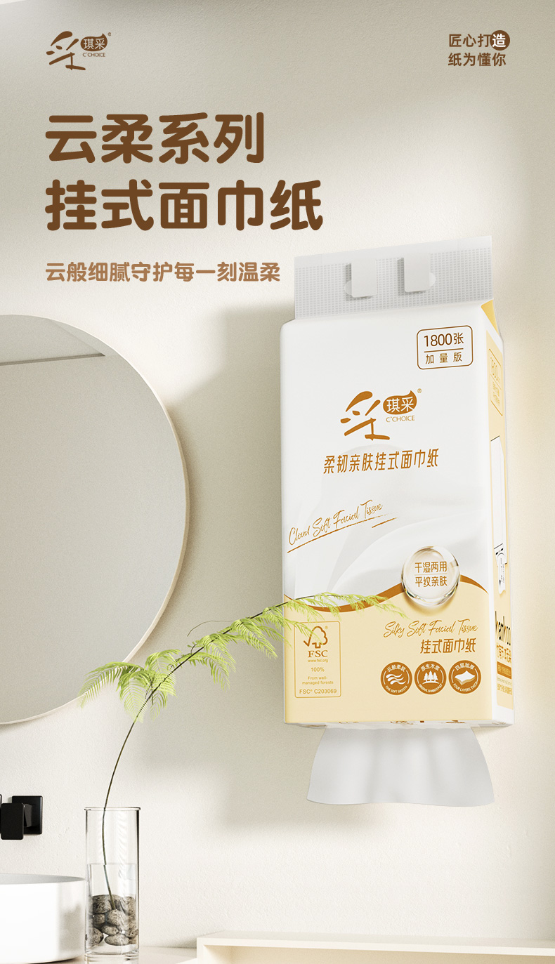 若禺采琪采系列挂式软抽纸4层加厚加大1800张/提超值家庭装原生木浆柔软舒适湿水可用1件4提RR1302