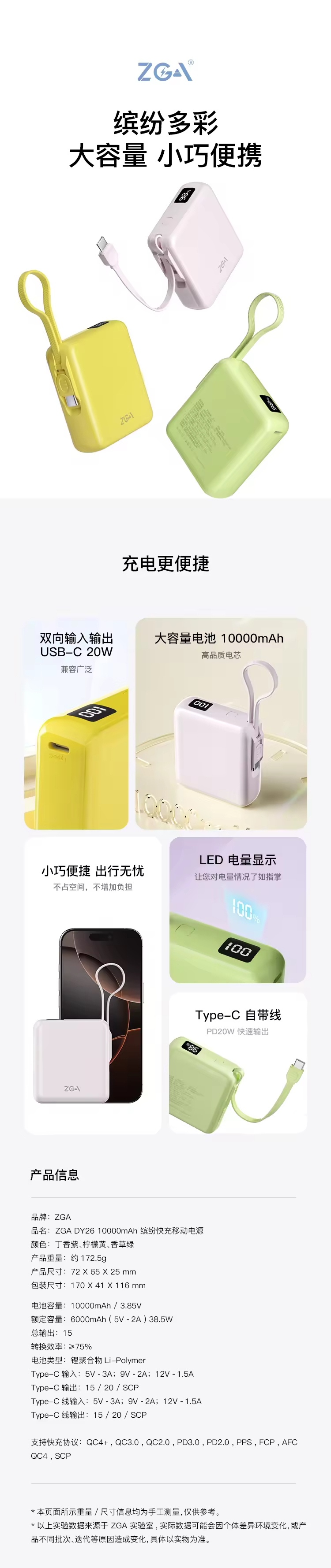 【国家3C认证】ZGA DY26 10000mAh 缤纷快充移动电源