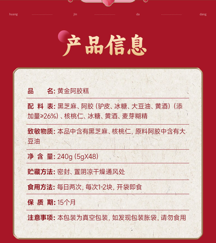 黄金搭档黄金阿胶糕礼盒 送长辈女性补品营养品阿胶固元糕 真空包装开袋即食 240g/盒