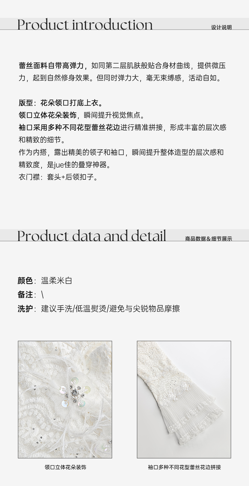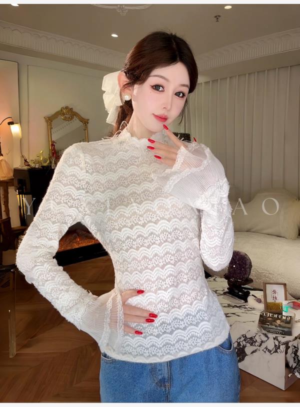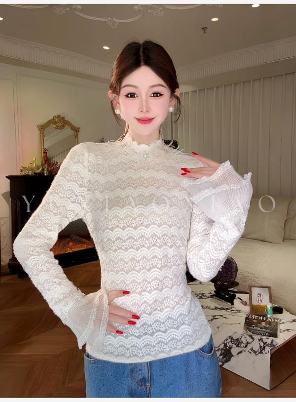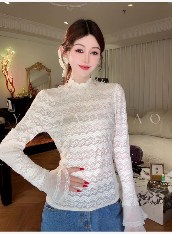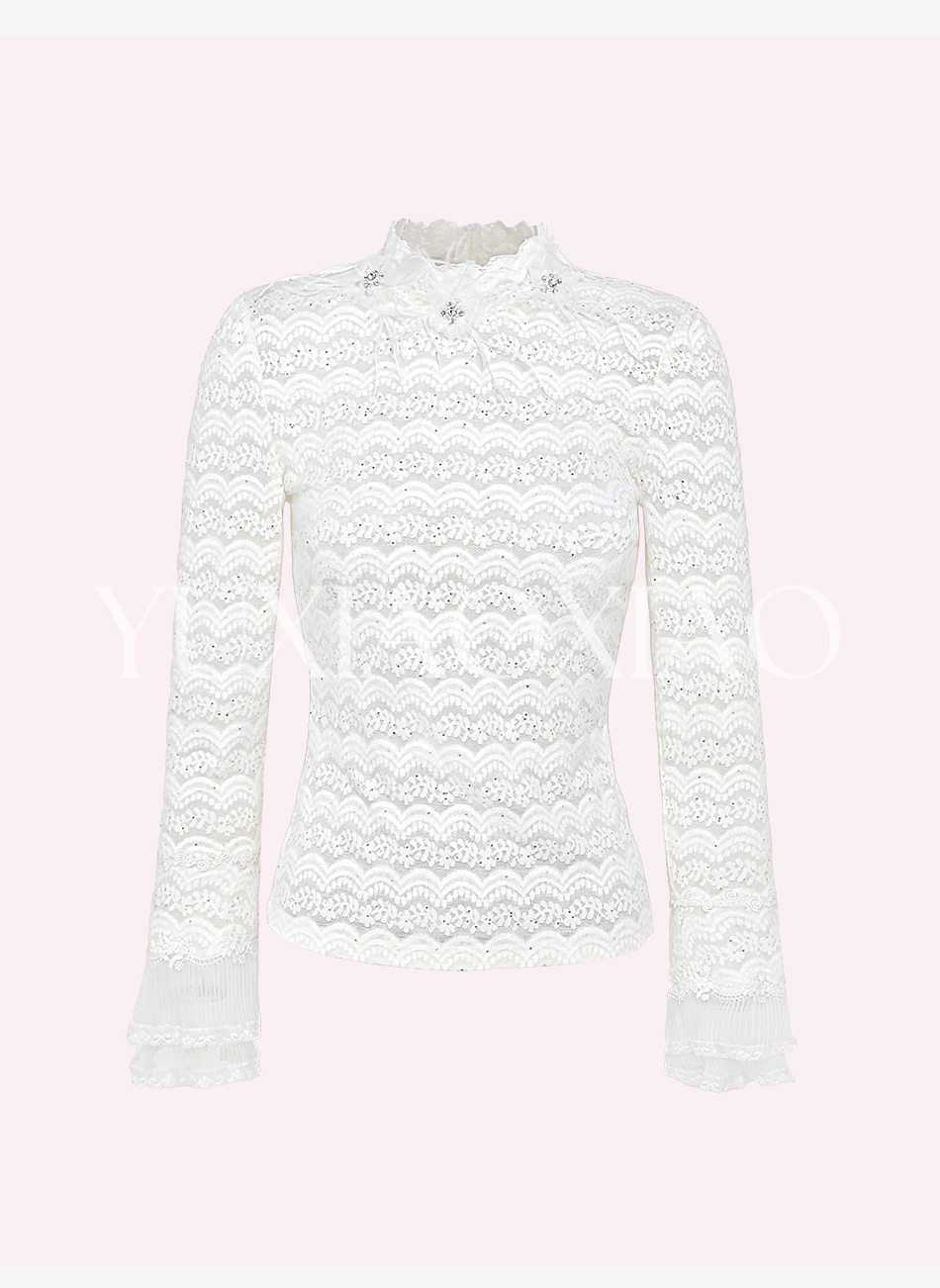 余潇潇【月神海浪】精致百搭高弹力拼接亮片立体花朵蕾丝打底上衣