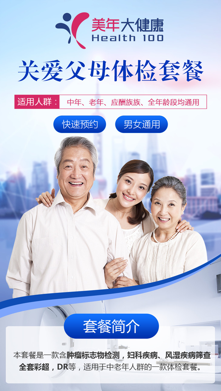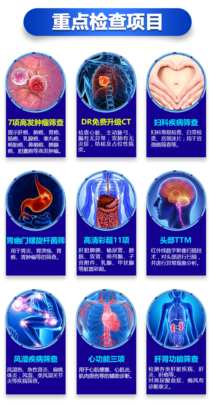 全民通享,孝敬长辈、关爱自己、健康无忧体检套餐,适用所有人群,全身11项彩超、7项高发肿瘤筛查、胸部CT、肝功能12项检测
