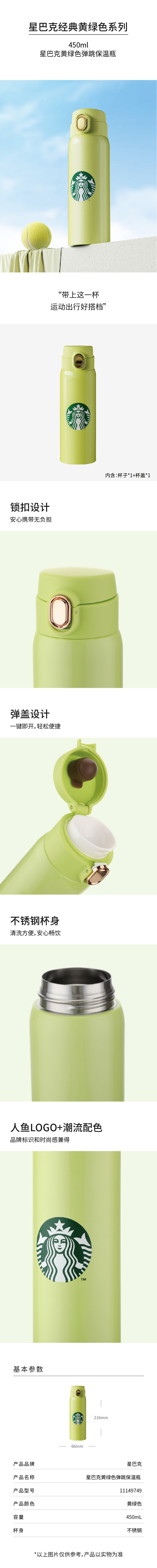 11149749 星巴克黄绿色弹跳保温瓶