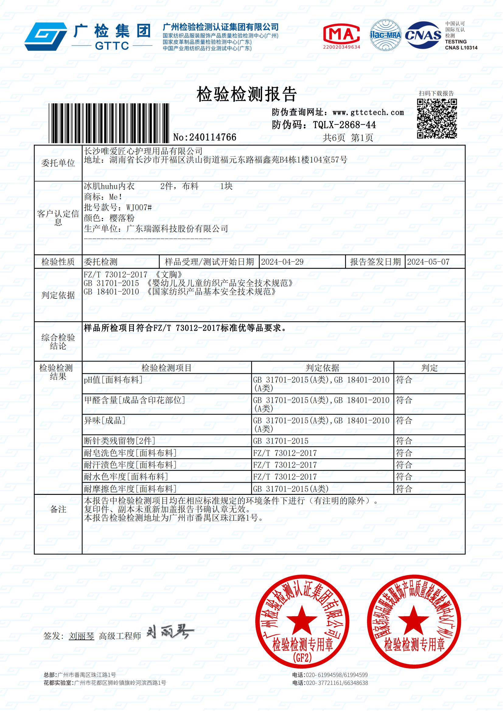 内衣通过双A类婴幼儿安全标准检测!