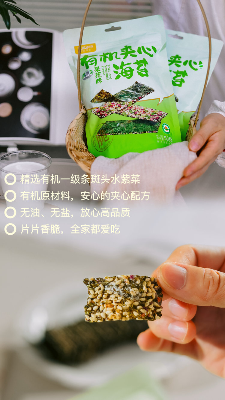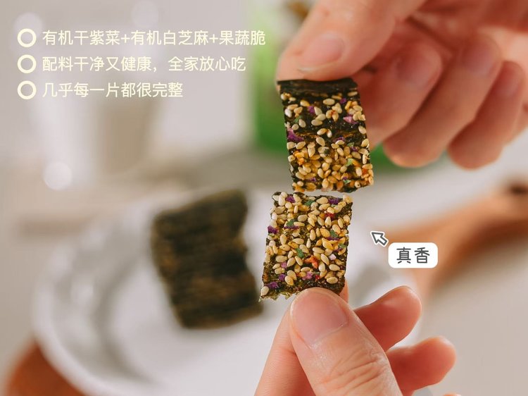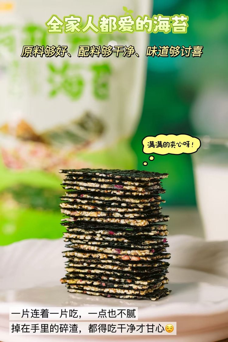 它不像普通海苔要么干硬,要么过甜,它把海苔压得超薄,中间夹着白芝麻和果蔬脆。入口先是海苔「咔嚓」的脆响炸开,紧跟着白芝麻的醇香丝丝缕缕漫上来,再裹着果蔬脆的清新劲儿,鲜得纯粹又层次分明。哪怕最后掉在手里的碎渣,都得捻起来吃干净才甘心~