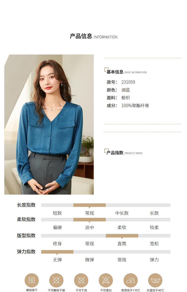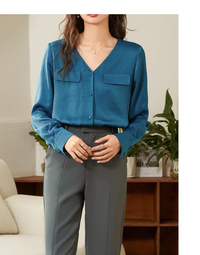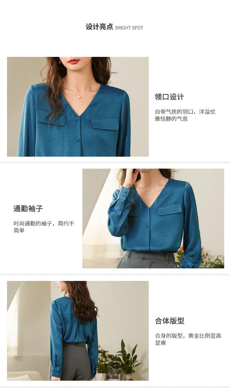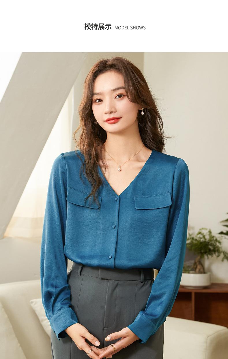 百姿 V领假口袋长袖衬衫女2023春季新款韩版纯色缎面宽松显瘦衬衣