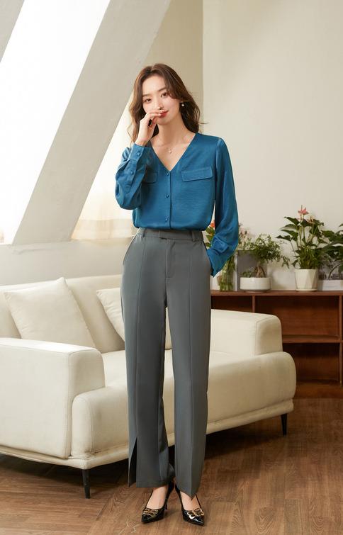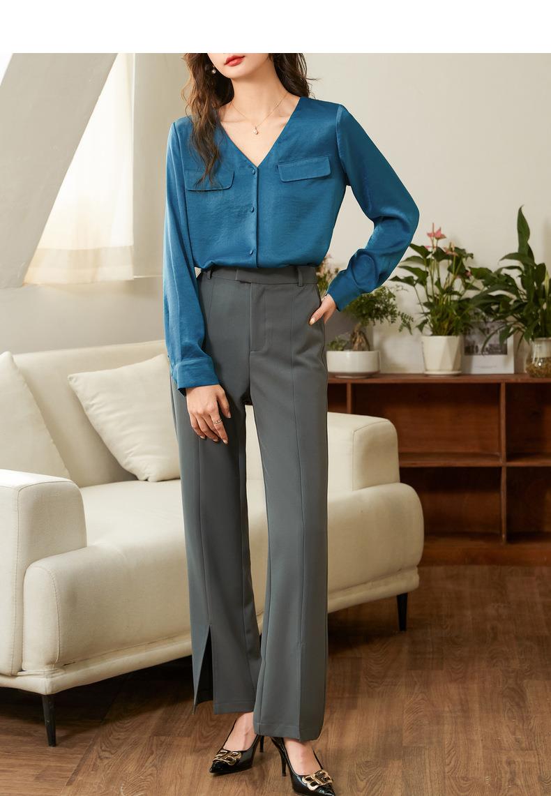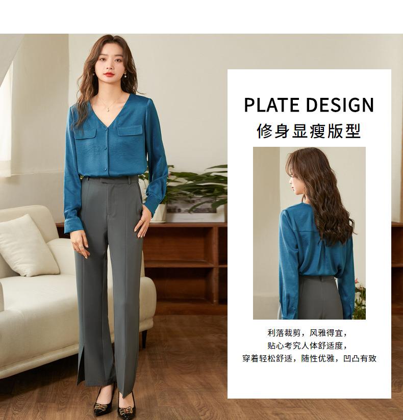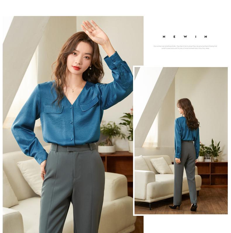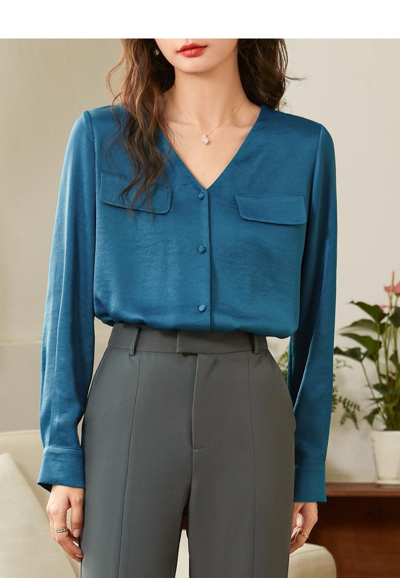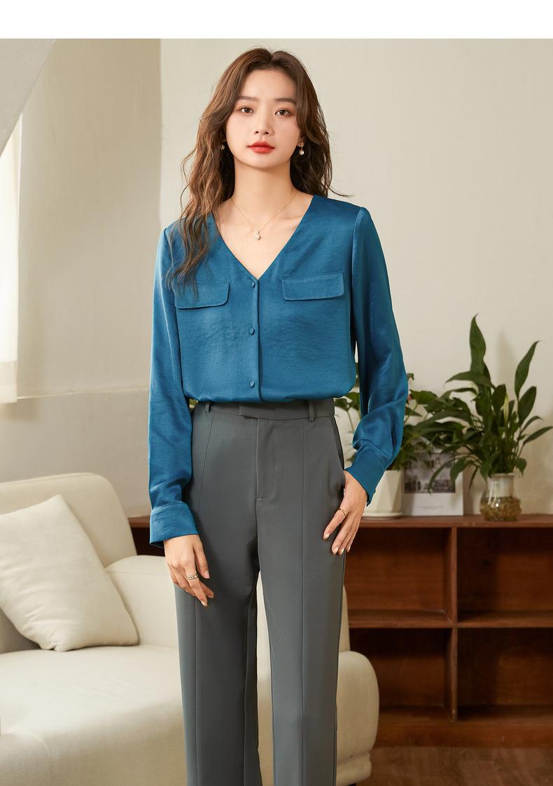 百姿 V领假口袋长袖衬衫女2023春季新款韩版纯色缎面宽松显瘦衬衣
