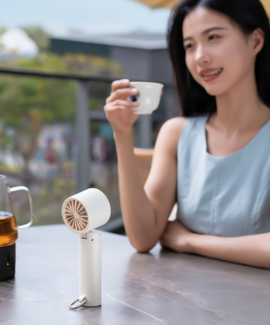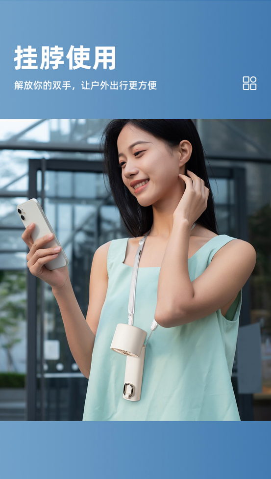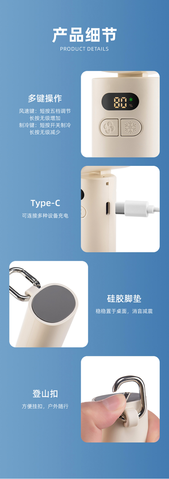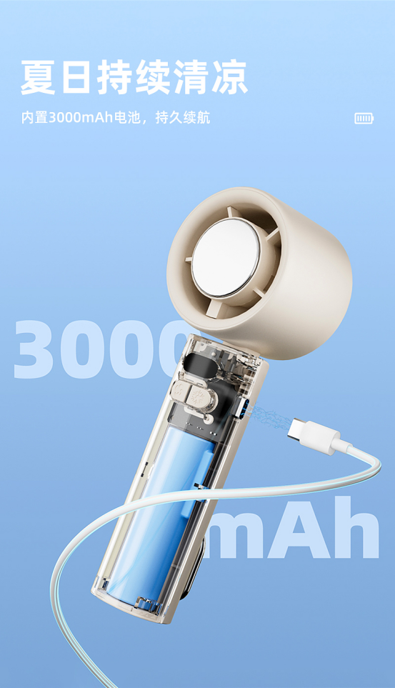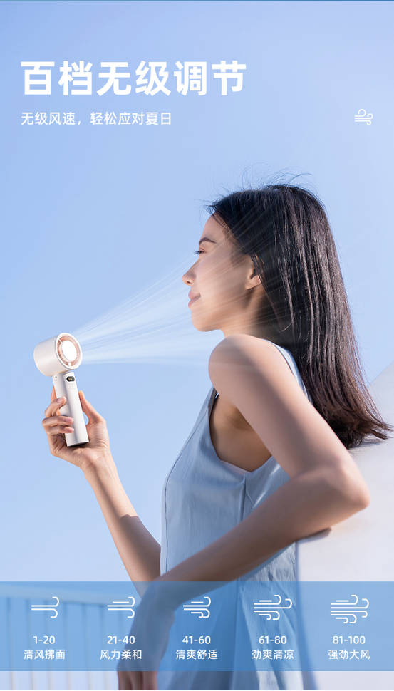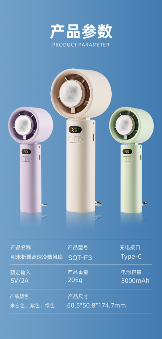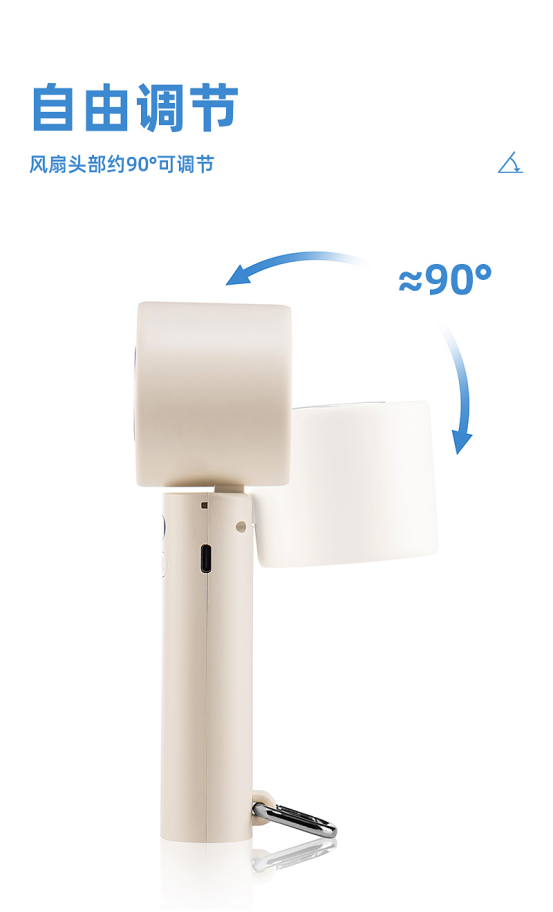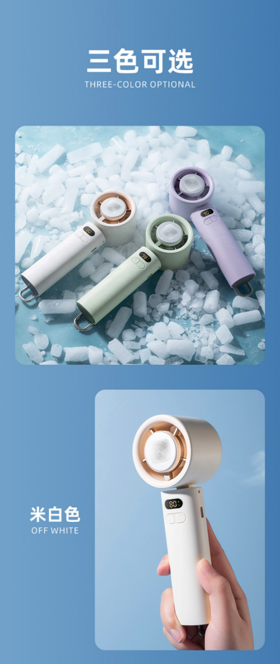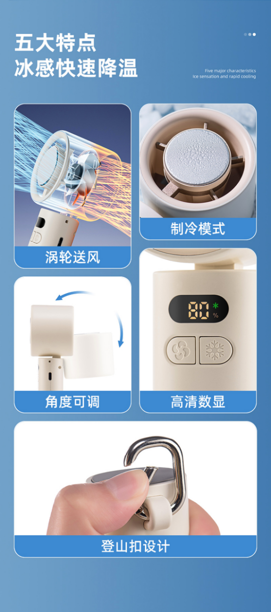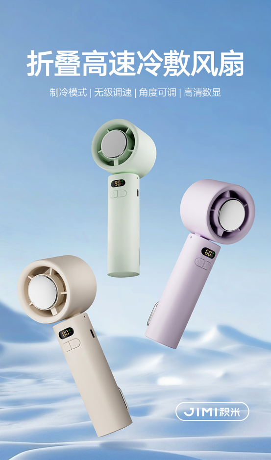 ● 积米手持高速冷敷折叠小风扇(核心卖点) 开启夏日降温新体验,大风+冷敷,夏日双重降温更凉快 ❶、高清数显,LED实时显示,调节风速时,实时显示当前档位,电量 ❷、折叠设计,头部90度调节,可当桌面风扇使用 ❸、挂绳设计,贴心设计挂绳,携带非常方便,随时随地带在身边,非常实用 ❹、挂钩设计,登山挂扣,释放双手,携带方便 ❺、内置3000mAh电池,持久续航,充电一次,最长可用10小时以上 ❻、百档风力,100档风力任意调节,满足夏日不同清凉需求 ❼、迷你小巧,轻量化设计,小巧迷你的机身,适合夏日出行随身携带 ❽、冰敷制冷,内置半导体制冷片,一键制冷,快速冰敷降温