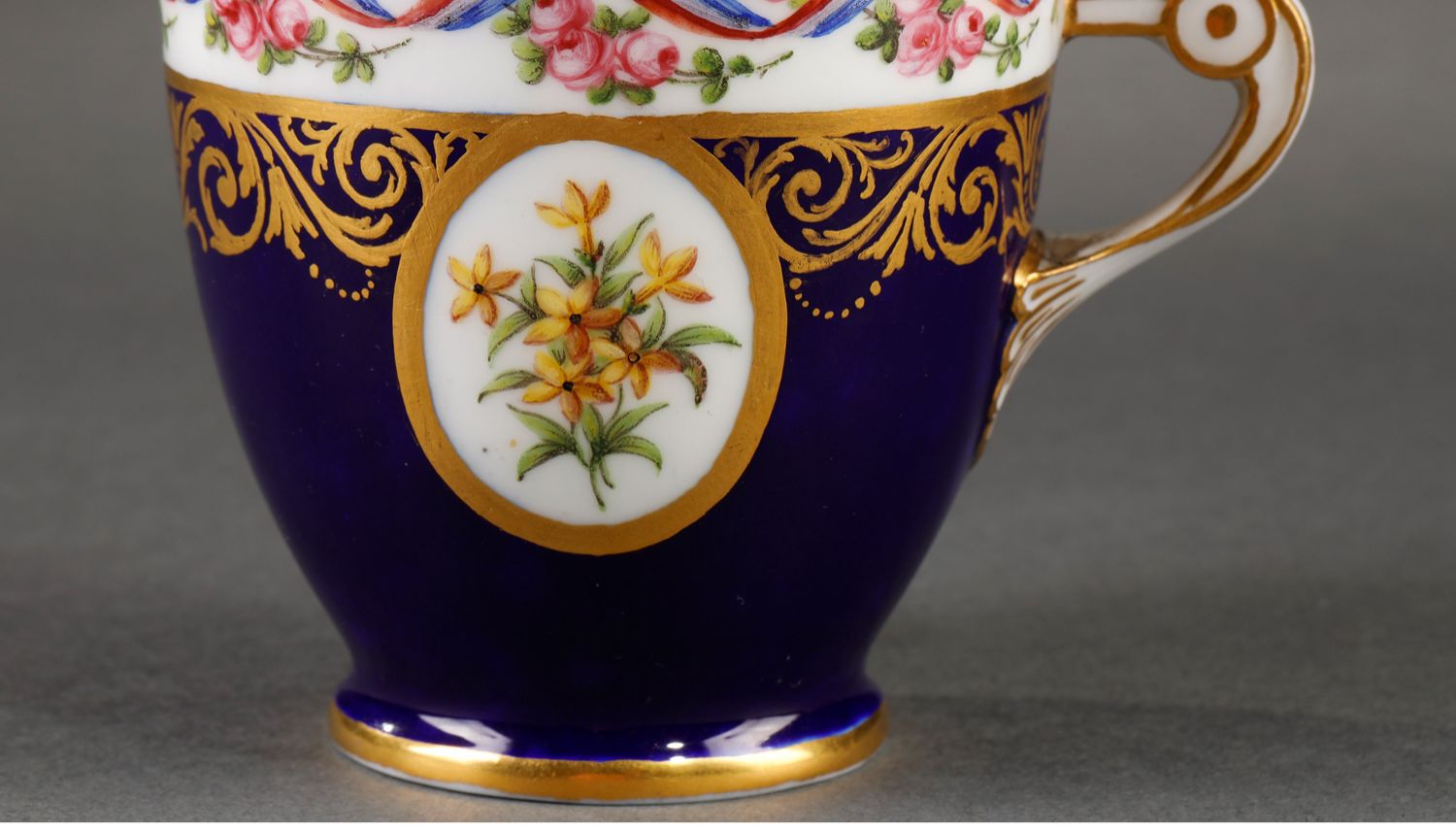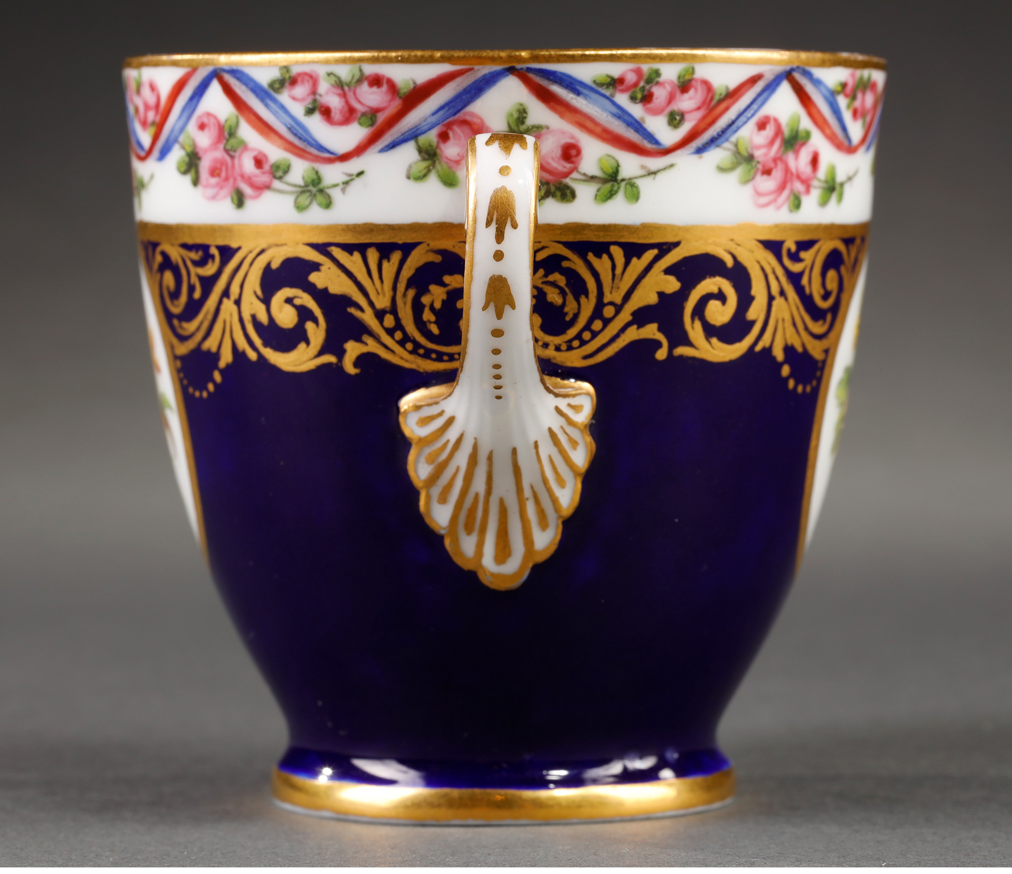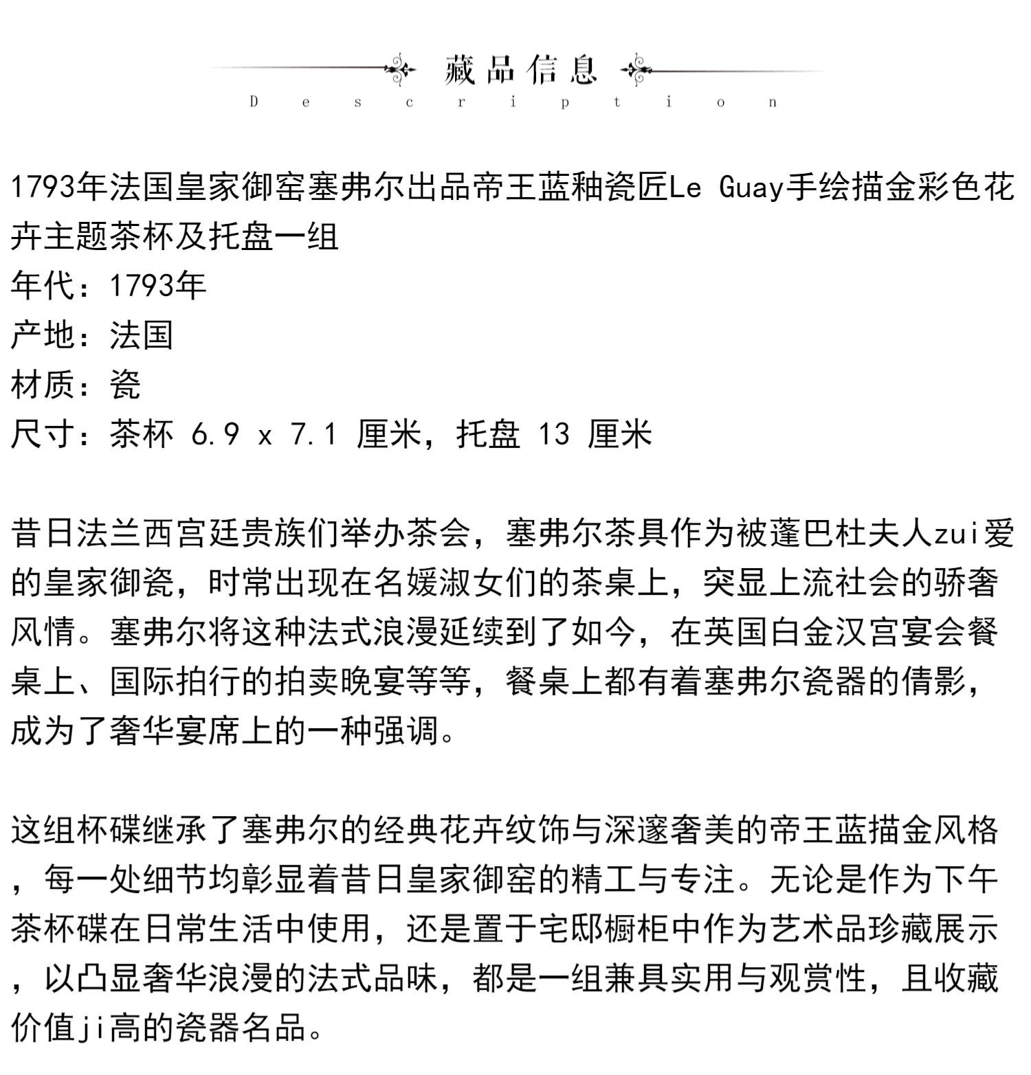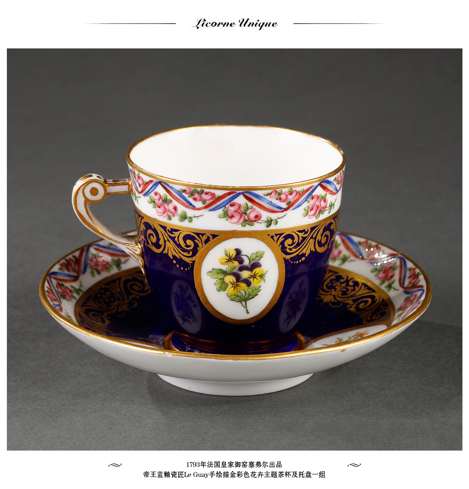 独角鹿西洋古董塞弗尔瓷器帝王蓝釉手绘描金彩色花卉茶杯托盘杯碟
