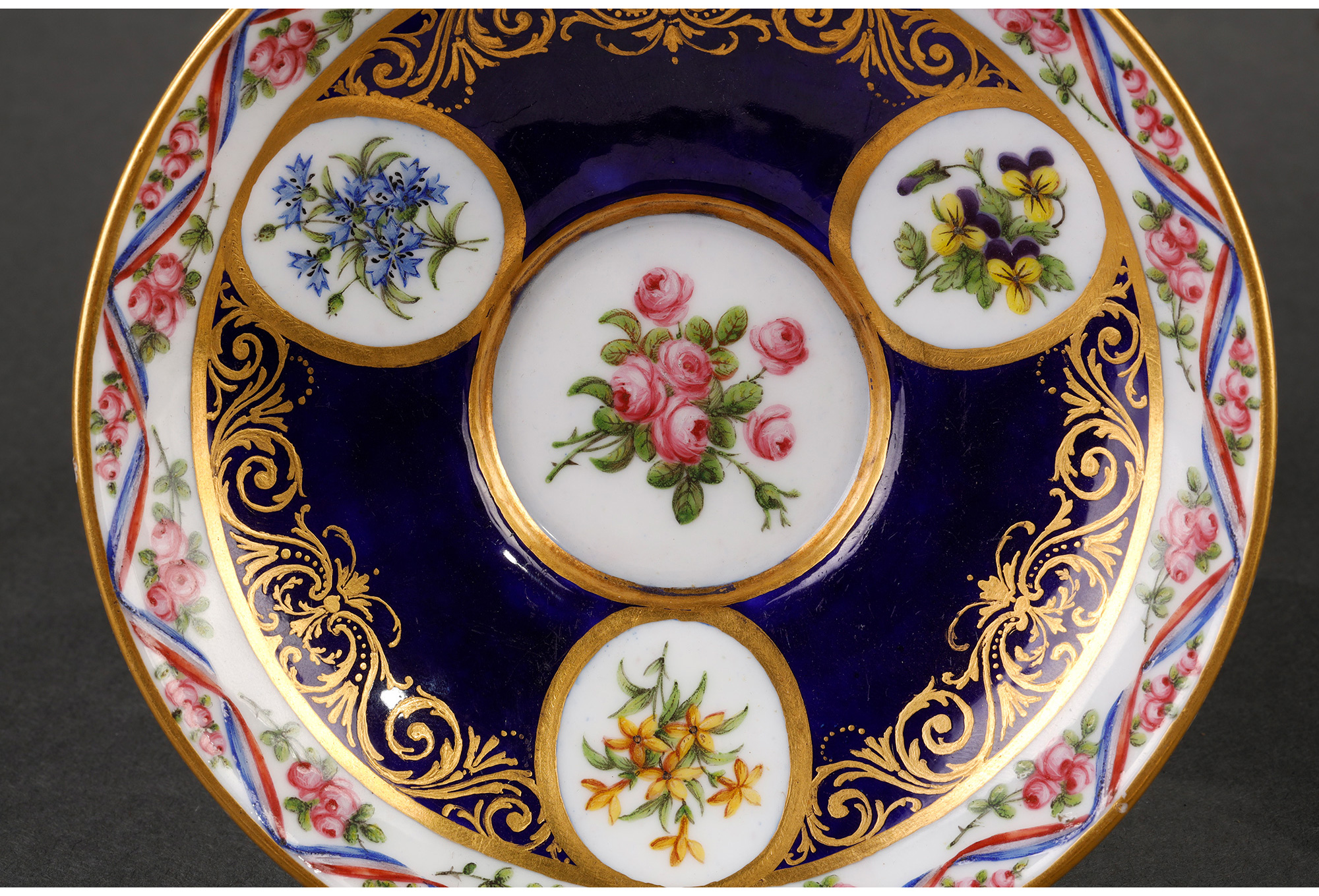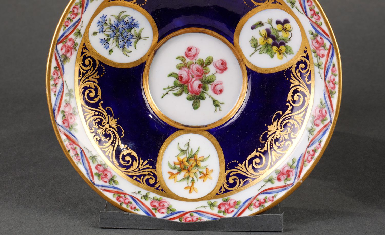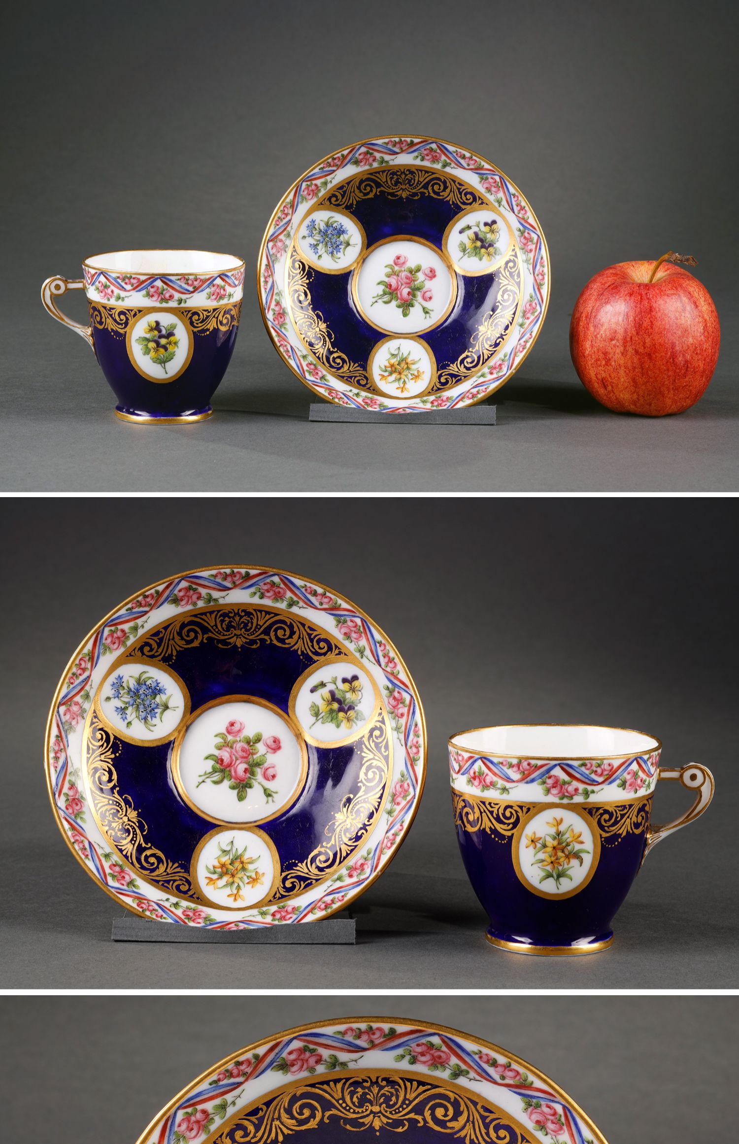独角鹿西洋古董塞弗尔瓷器帝王蓝釉手绘描金彩色花卉茶杯托盘杯碟