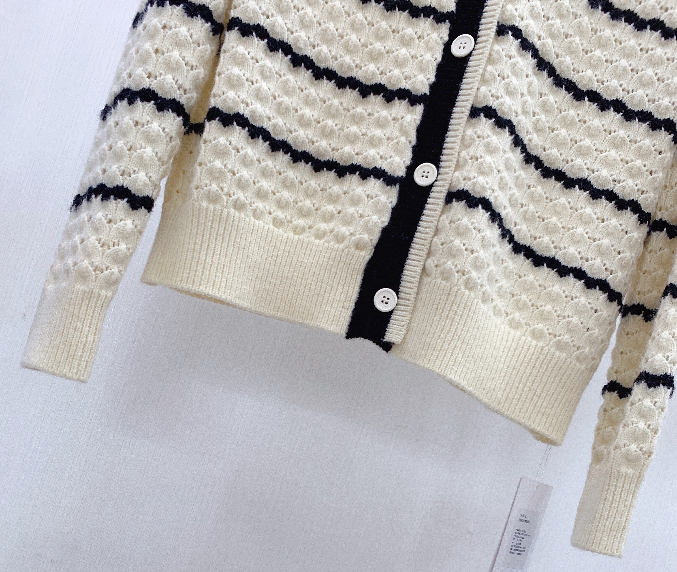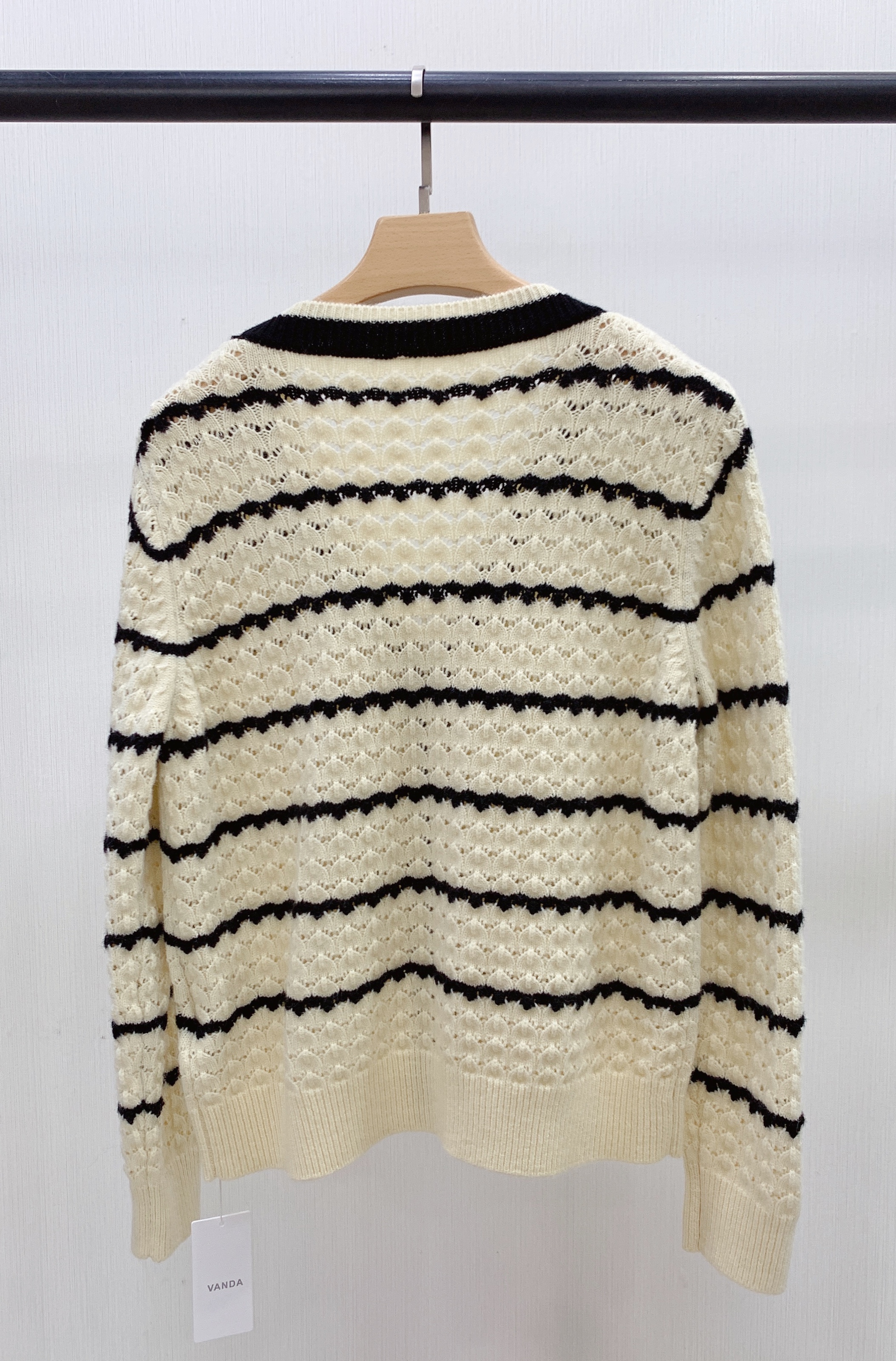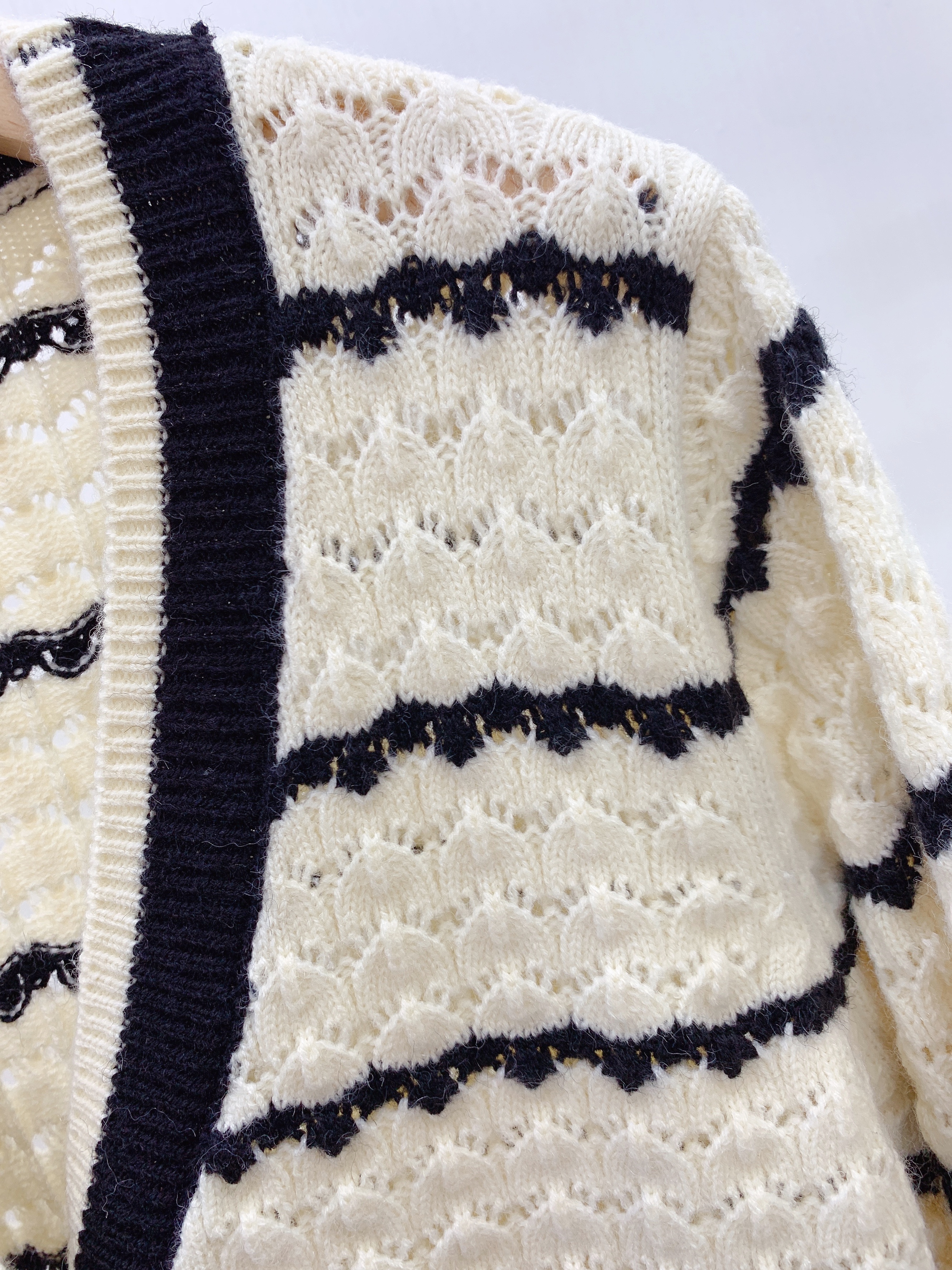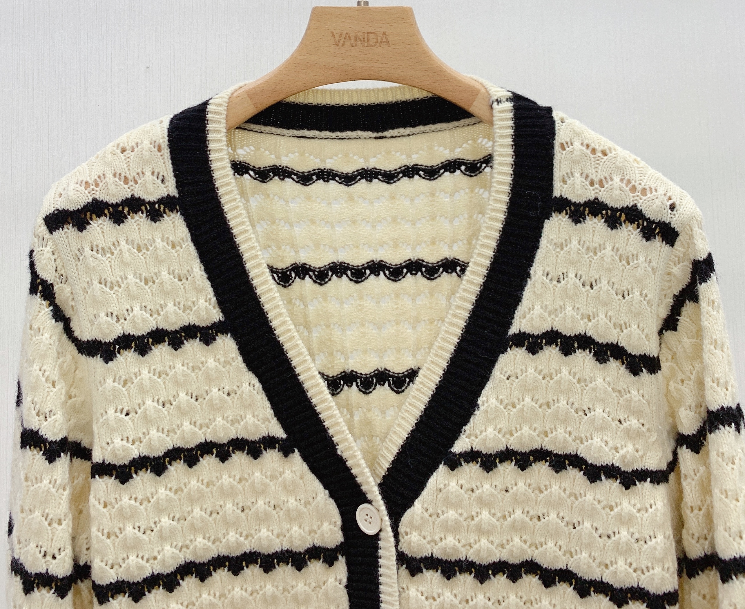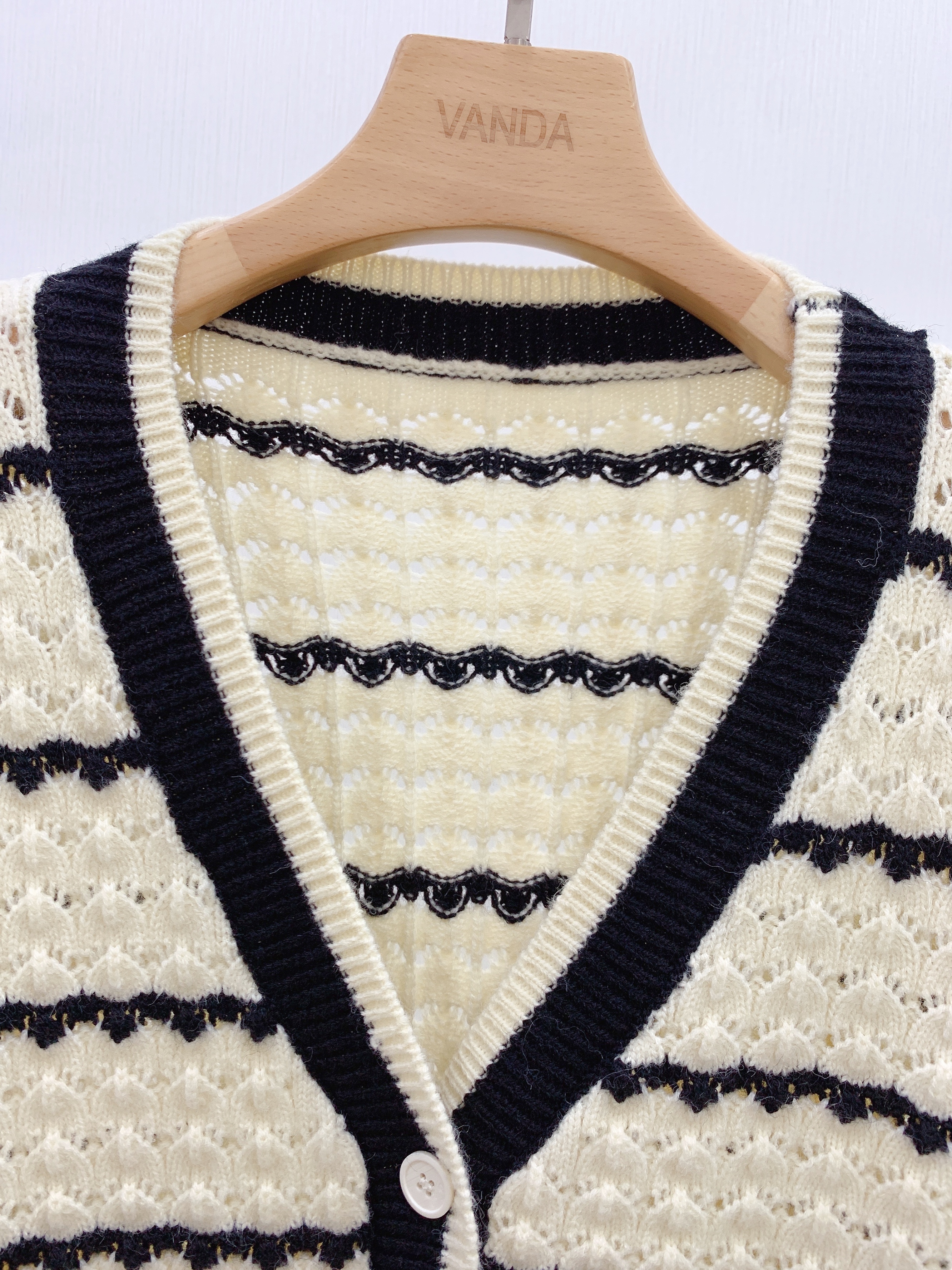 条纹镂空V领开衫