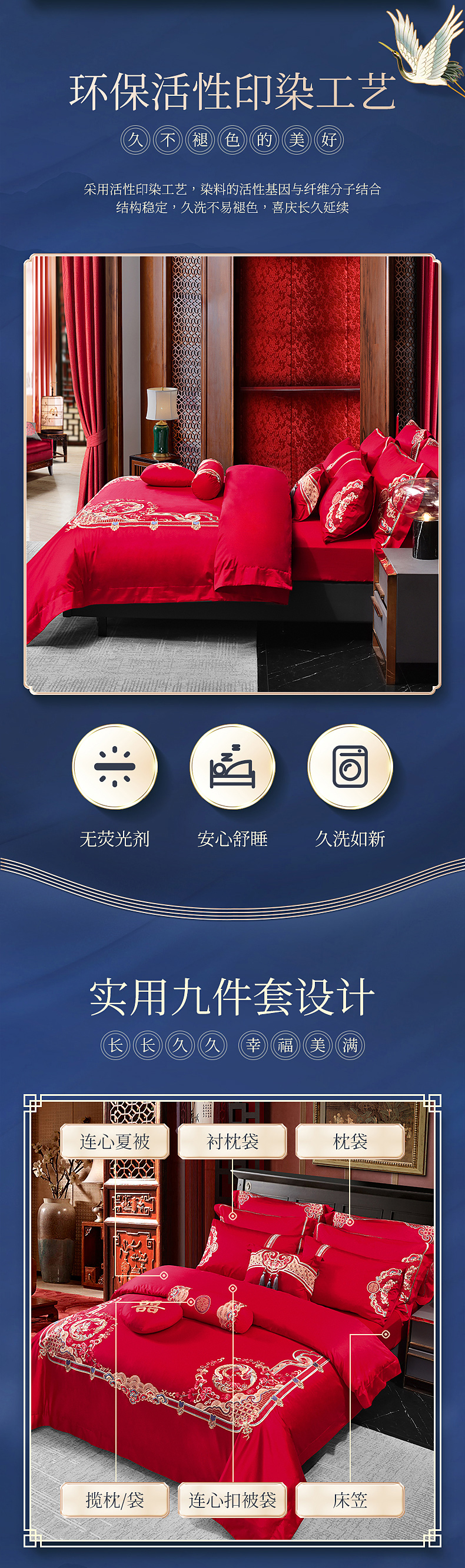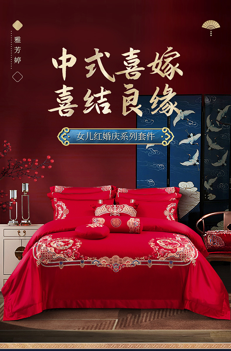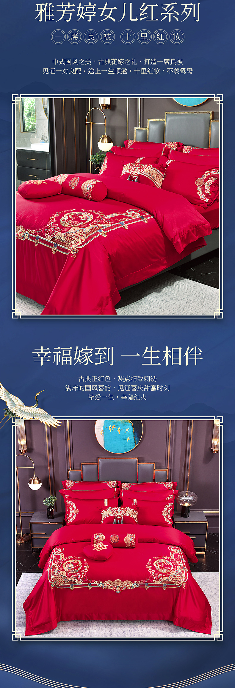 雅芳婷婚庆系列结婚九件套全棉被单床单双人红色刺绣连芯扣套件