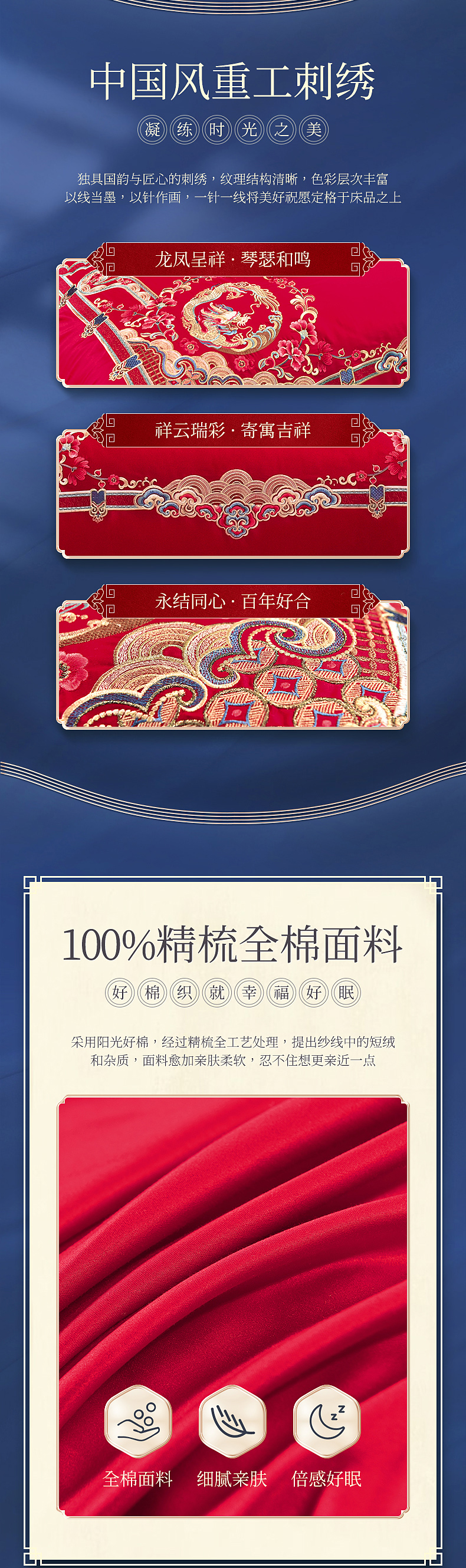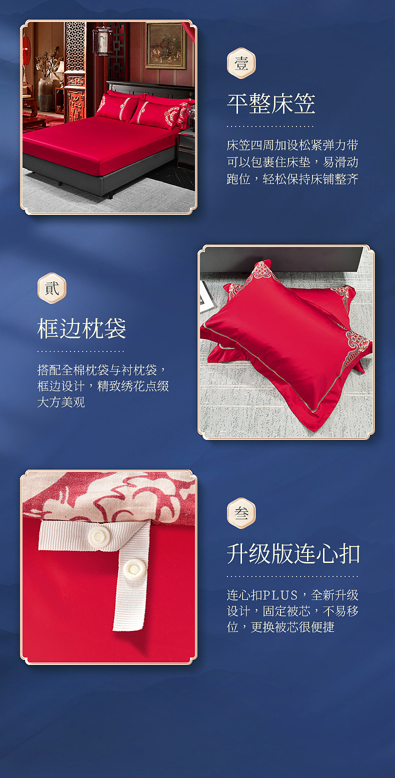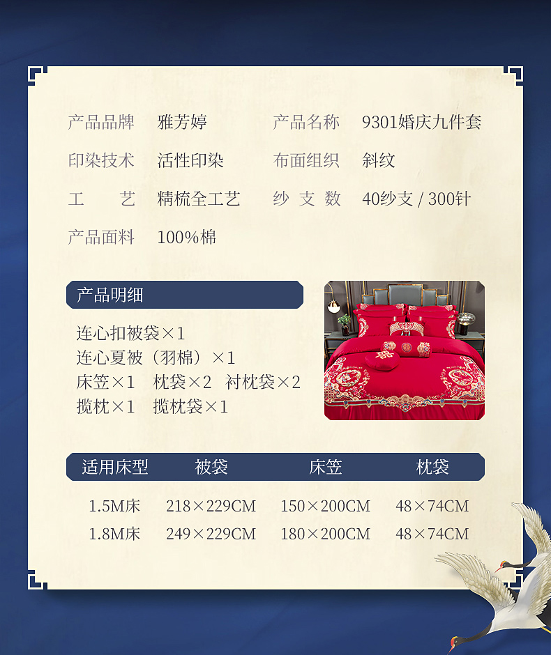 雅芳婷婚庆系列结婚九件套全棉被单床单双人红色刺绣连芯扣套件