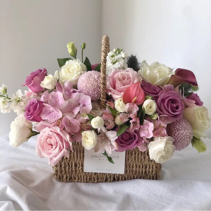 11支紫玫瑰,6支粉粉佳人玫瑰,5支桔梗,紫罗兰,绣球间插,精致花篮