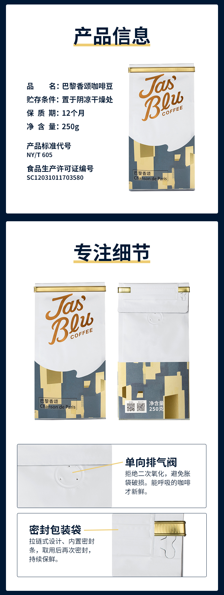 B3 【咖啡熟豆】jasbleucoffee巴黎香颂中浅烘焙现磨黑咖啡粉意式浓缩拼配咖啡豆
