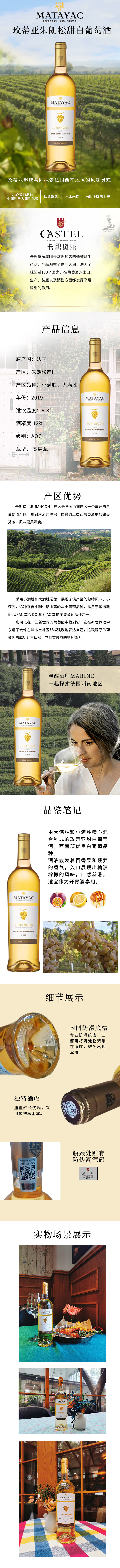这款来自法国朱朗松产区的玫蒂亚甜白葡萄酒,采用小满胜与大满胜葡萄混酿,酒液散发百香果和菠萝香气,口感丝滑,甜而不腻,适合在6-8℃下作为开胃酒享用。