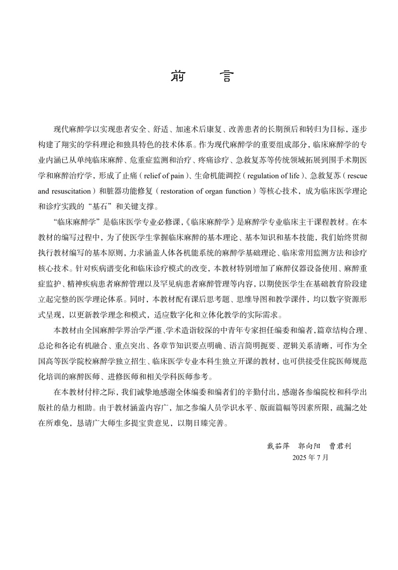 《临床麻醉学》是科学出版社"十四五"普通高等教育本科规划教材,由中国麻醉学界具有丰富临床和教学经验的中青年专家历时近两年精心打造。全书系统构建麻醉学基础与临床应用知识体系,分为总论、专科麻醉和特殊患者麻醉三篇,共48章。与同类教材相比,本书创新性地融入麻醉设备应用、麻醉重症监护、精神疾病患者麻醉管理及罕见病患者麻醉管理等内容,有效填补了麻醉学教育的空白。本教材的数字资源包括课后思考题、思维导图和教学课件,显著提升了学习的互动性和实用性。