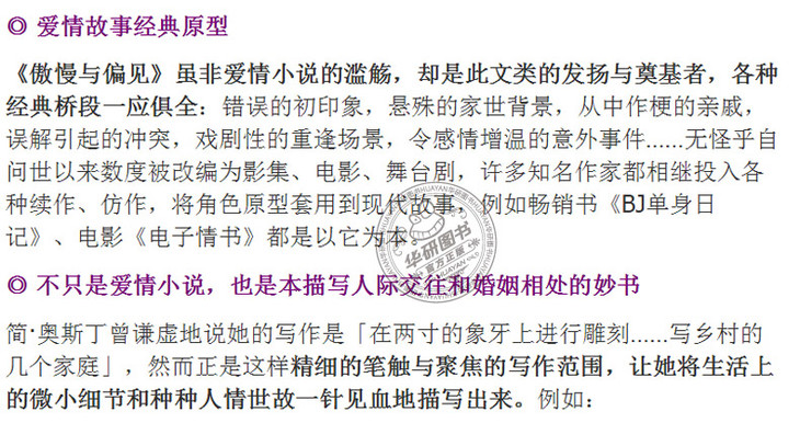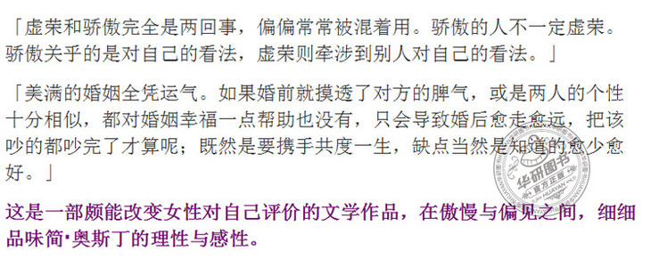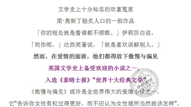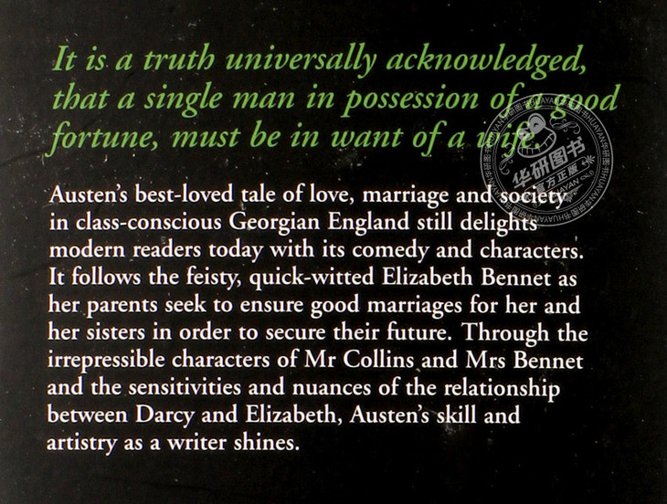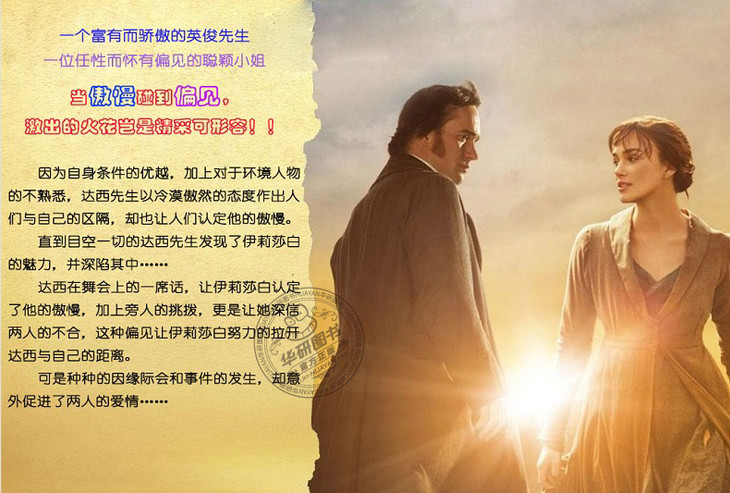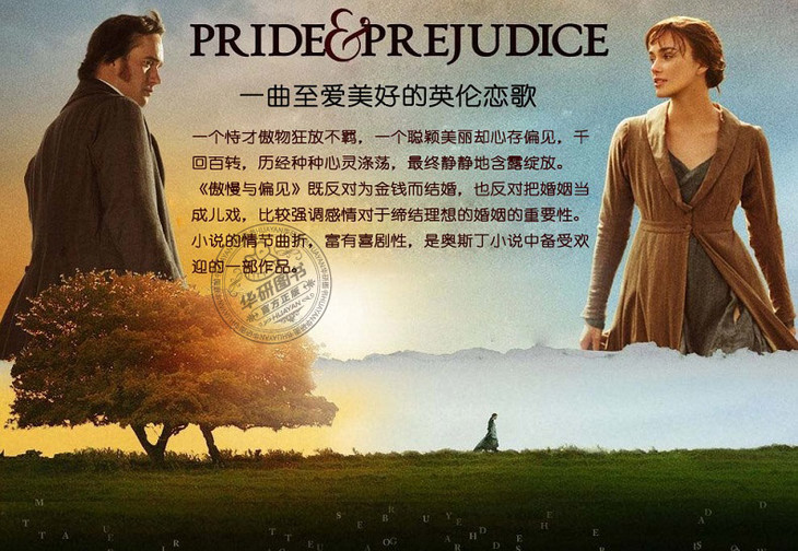 Pride and Prejudice《傲慢与偏见》是简·奥斯汀的代表作,奥斯汀曾自称:《傲慢与偏见》是她“宠爱的孩子”。本书描写傲慢的单身青年达西与带有偏见的二小姐伊丽莎白、富裕的单身贵族宾利与贤淑的大小姐简之间的感情纠葛,充分表达了作者本人的婚姻观,强调经济利益对恋爱和婚姻的影响。小说情节富有喜剧性,语言机智幽默,是奥斯丁小说中广受欢迎的一部,并被多次改编成电影和电视剧。