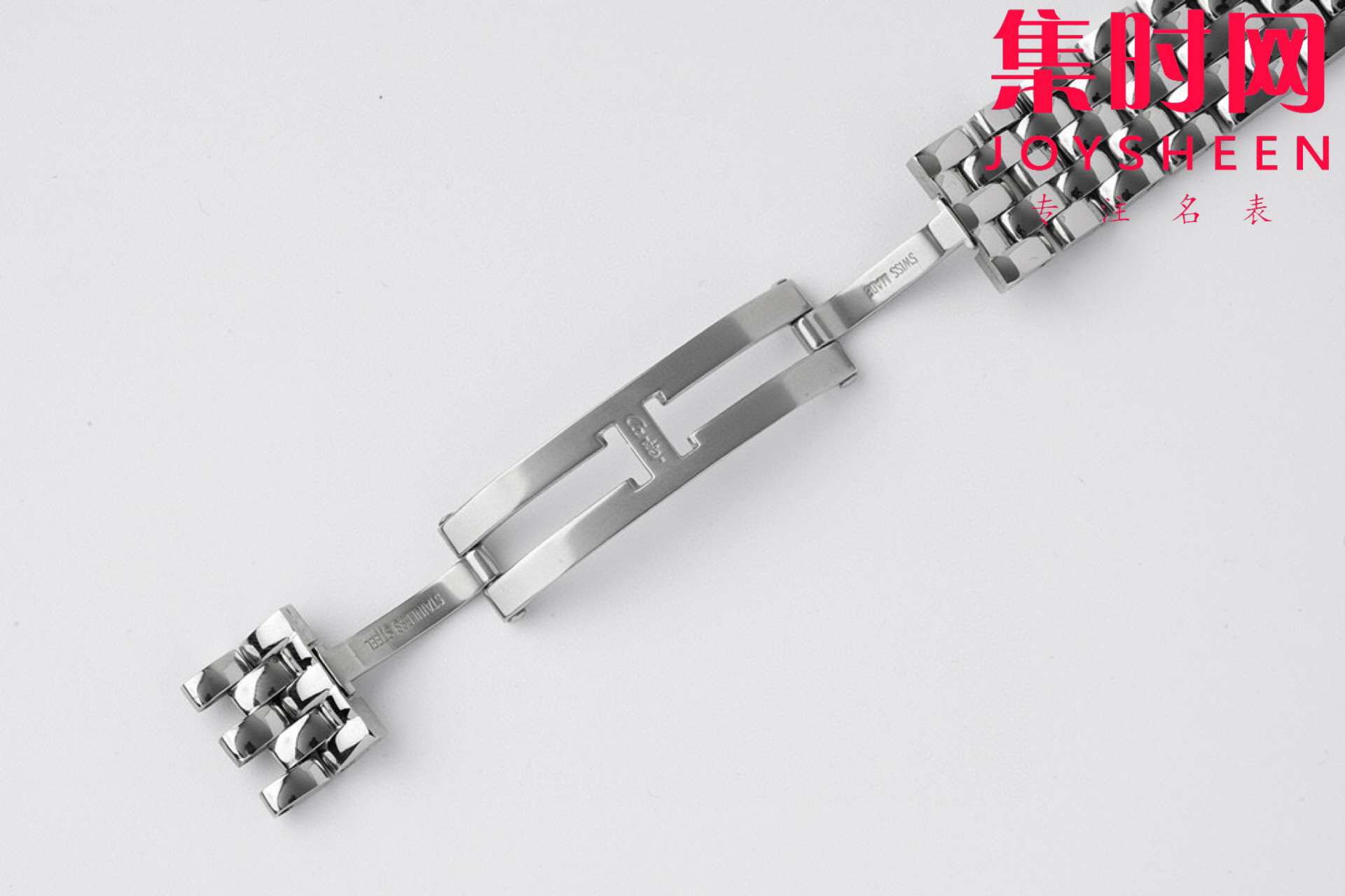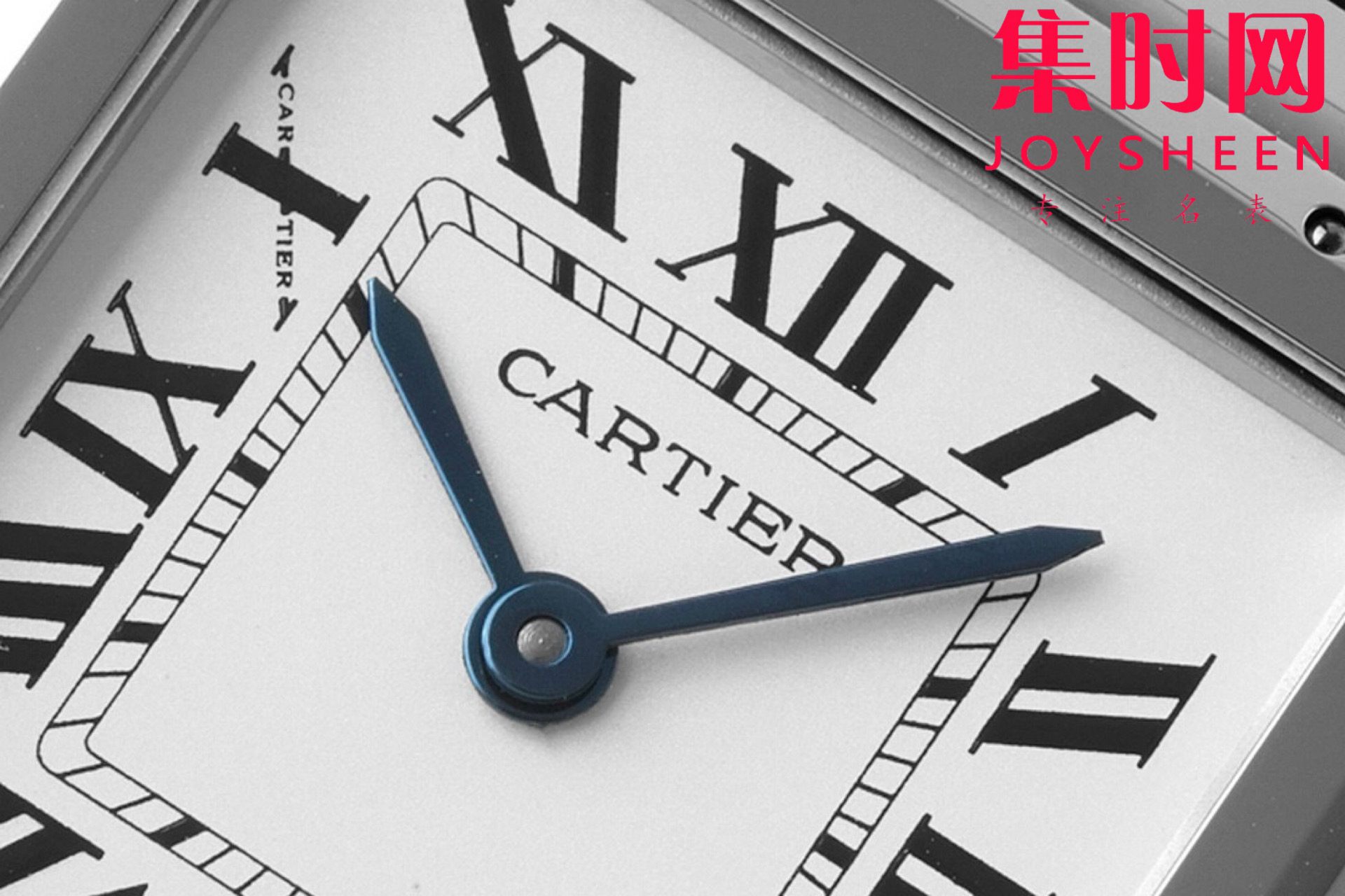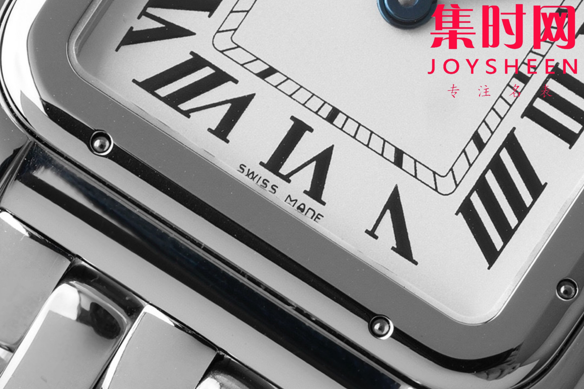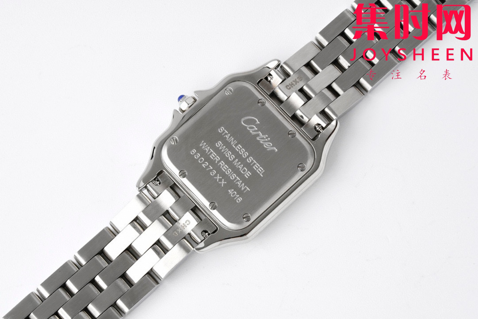 卡地亚Panthère de Cartier猎豹系列腕表 中号27X37mm 女士腕表 使用方形双层表壳看起来更加立体大方,更加突显出腕表的优雅与经典。白色表盘上,卡地亚式时标设计更为腕表注入一份品牌的 魅力。蓝色中央时分针宛若在两只随时间而舞动的精灵,为整款腕表再填华彩。 与传统卡地亚腕表一样,表冠上镶嵌有一颗具有品牌代表性的蓝宝石,向观表者展现高级钟表珠宝品牌卡地亚的独有魅力。表冠采用防滑纹理设计,方便对腕表的调试。两边的表冠护桥也为腕表增添了一份安全防护。 相比背透设计,密底工艺可以保障腕表机芯安全性。灵活自如的链节表链是腕表另一大亮点,处处都散发着曜目而饱满的光芒,从上到下都充满着独特的优雅奢华气质。