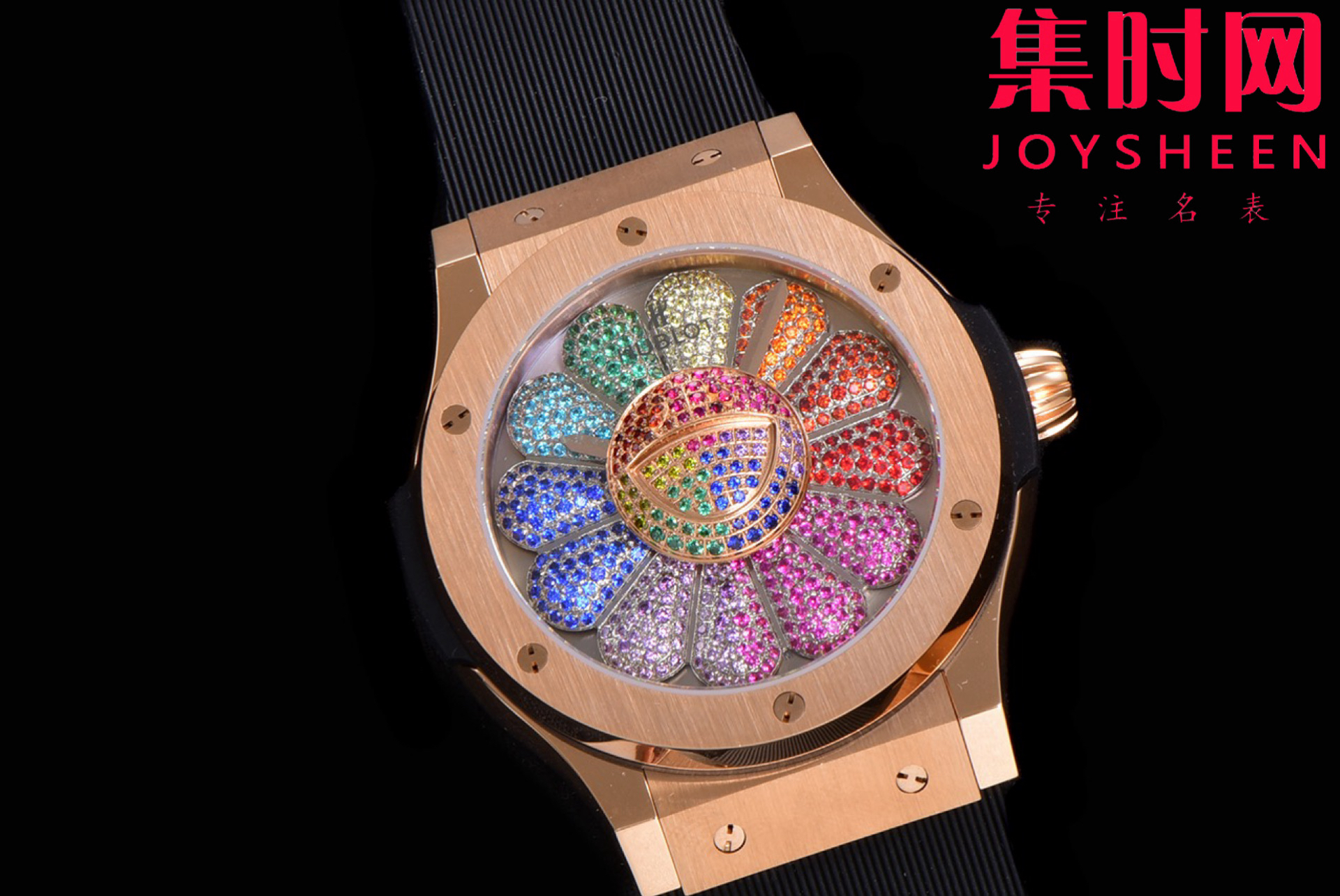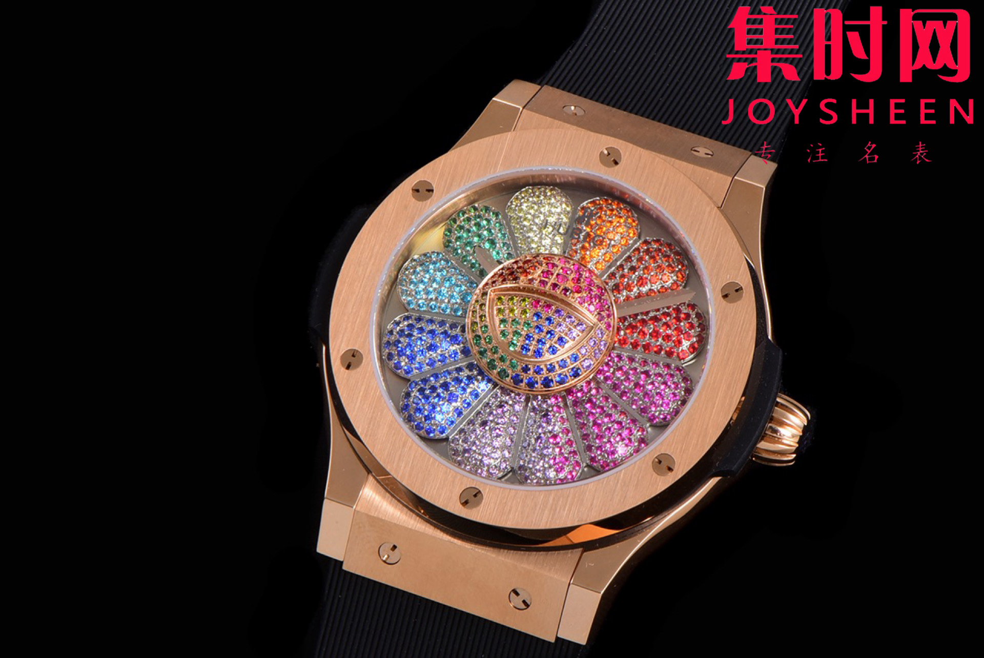 表盘:黑色漆面表盘 旋转装饰 12片镀黑花瓣 镶嵌456颗黑色钻石