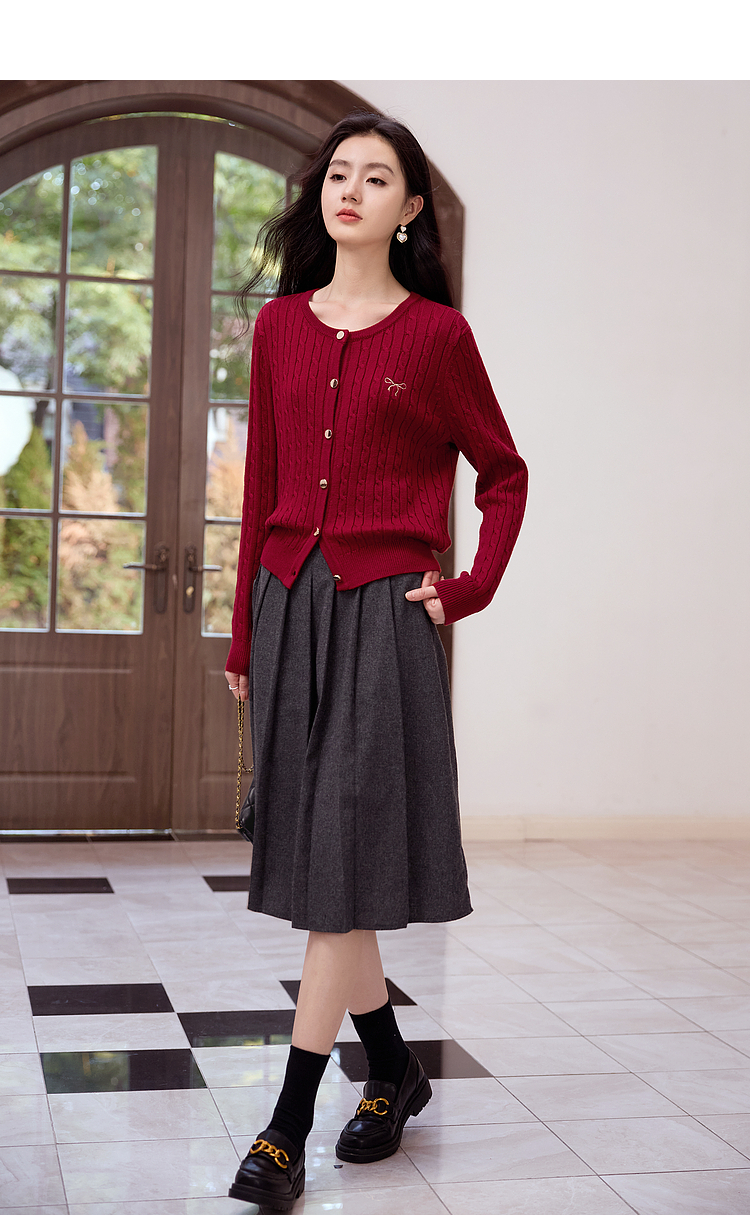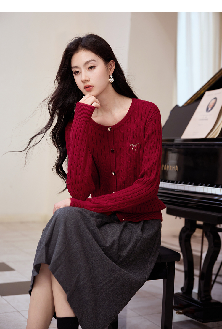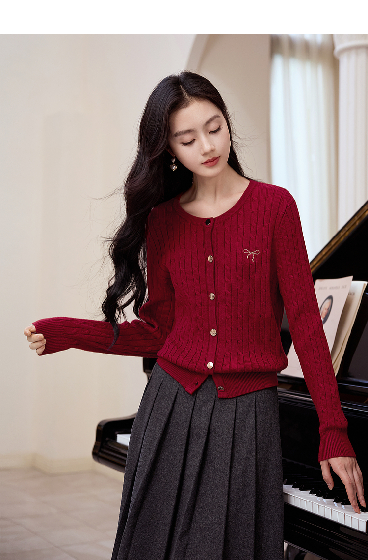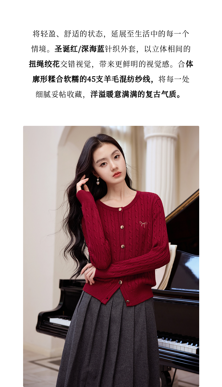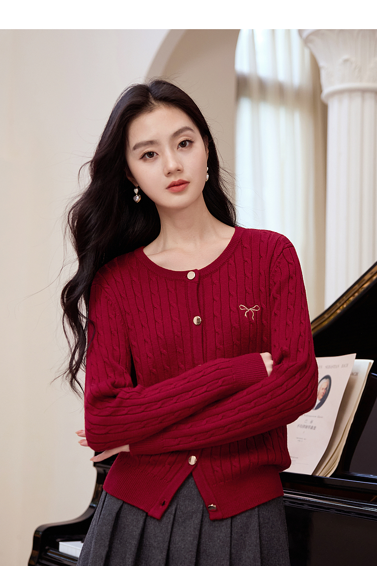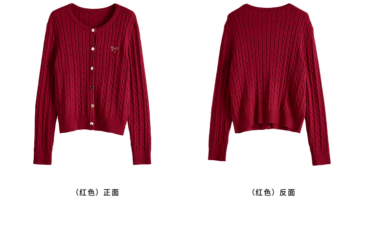 【年终特卖】熙世界学院风复古红色针织外套短款圆领麻花毛衣开衫2025秋新款