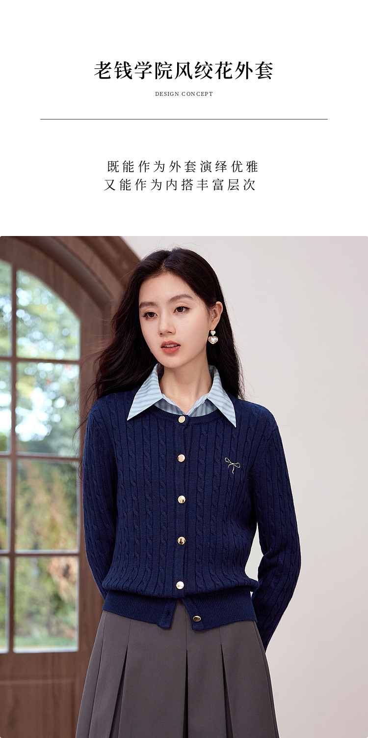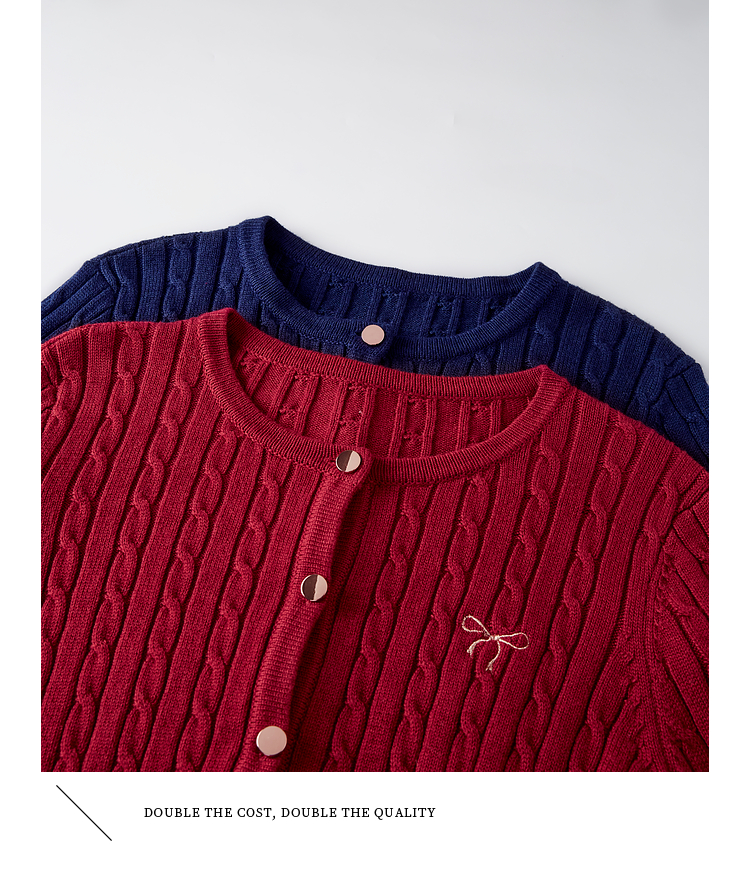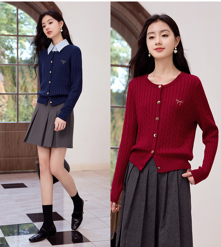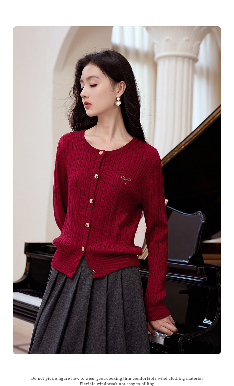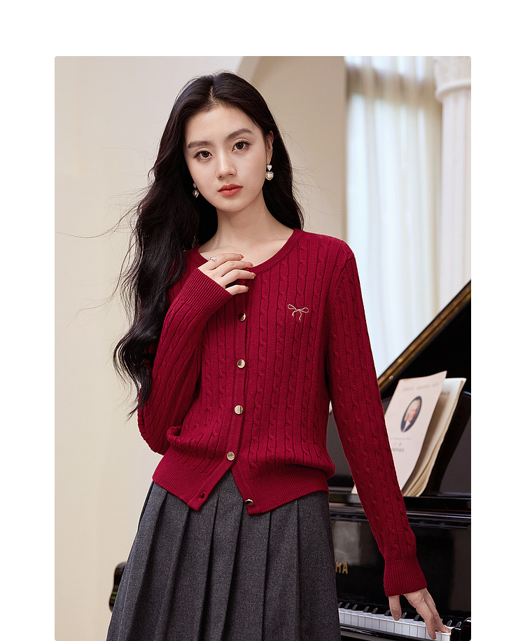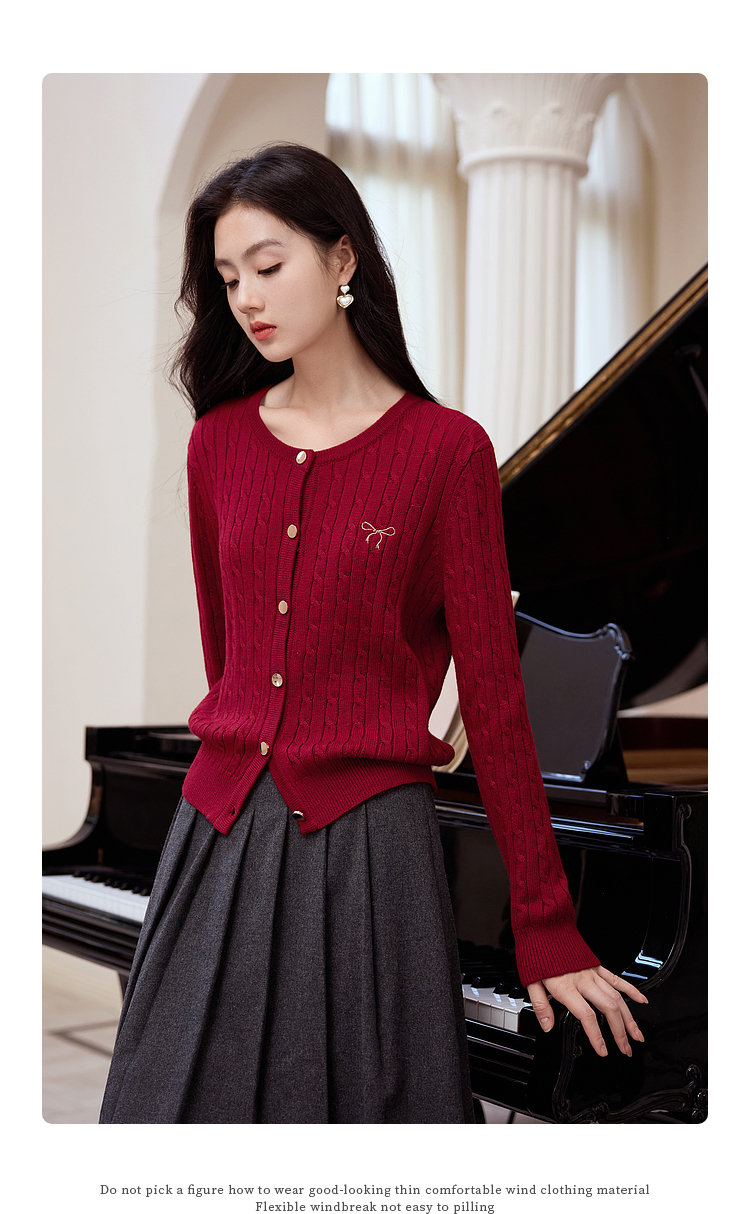 【年终特卖】熙世界学院风复古红色针织外套短款圆领麻花毛衣开衫2025秋新款