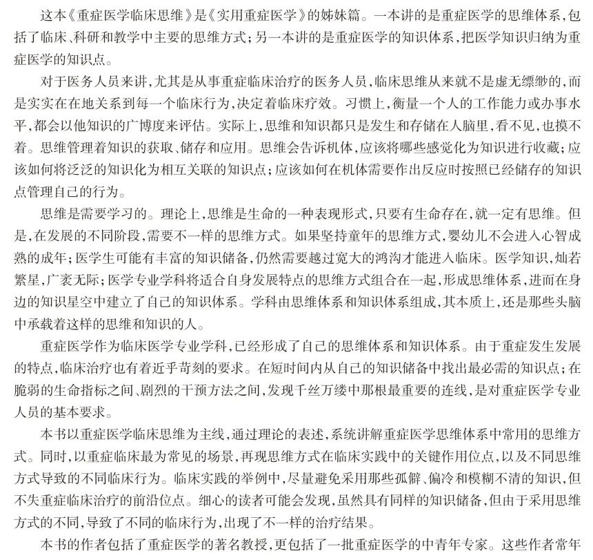 1 以重症医学临床思维为主线,通过理论的表述,系统讲解重症医学思维体系中常用的思维方式。