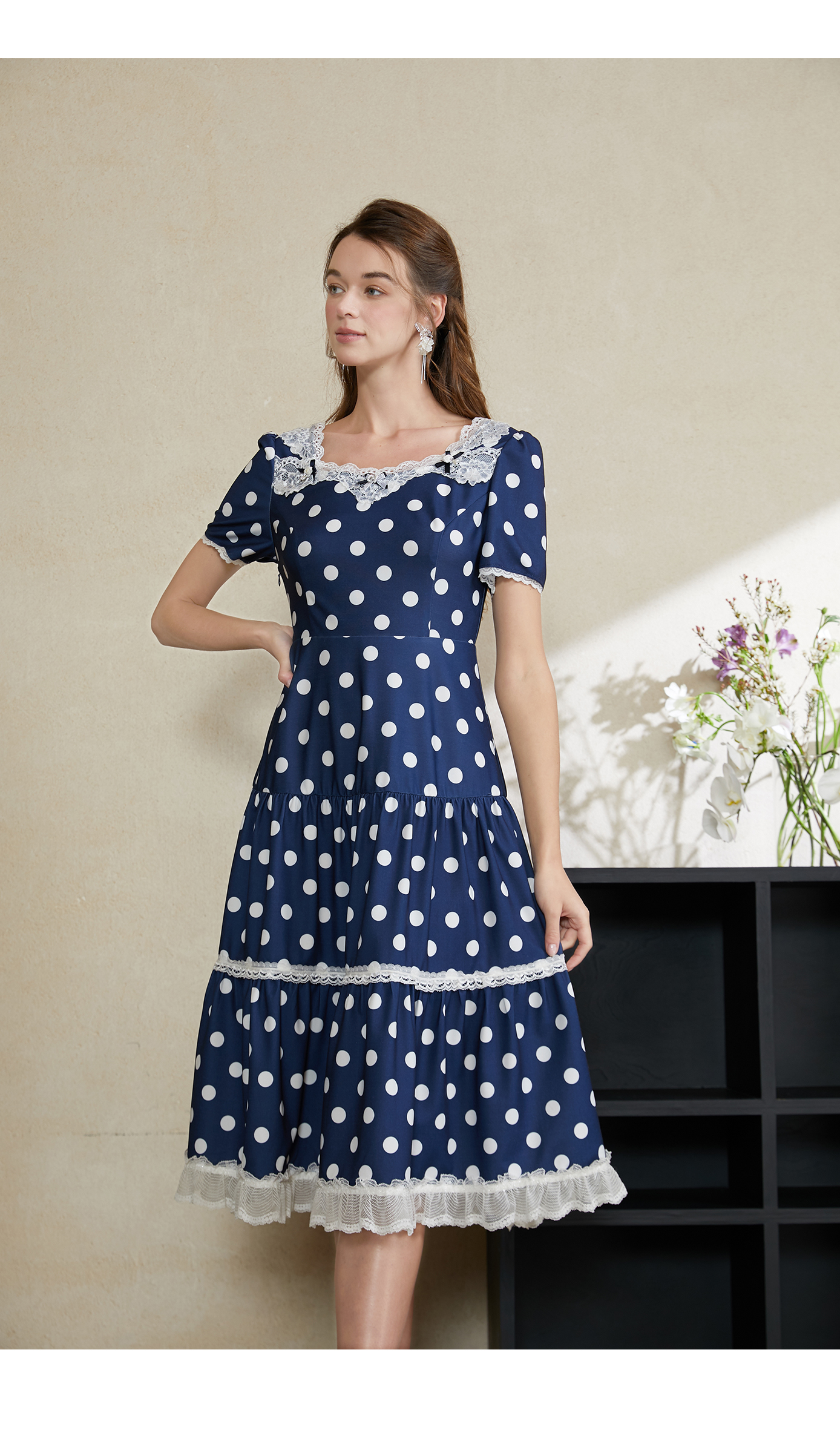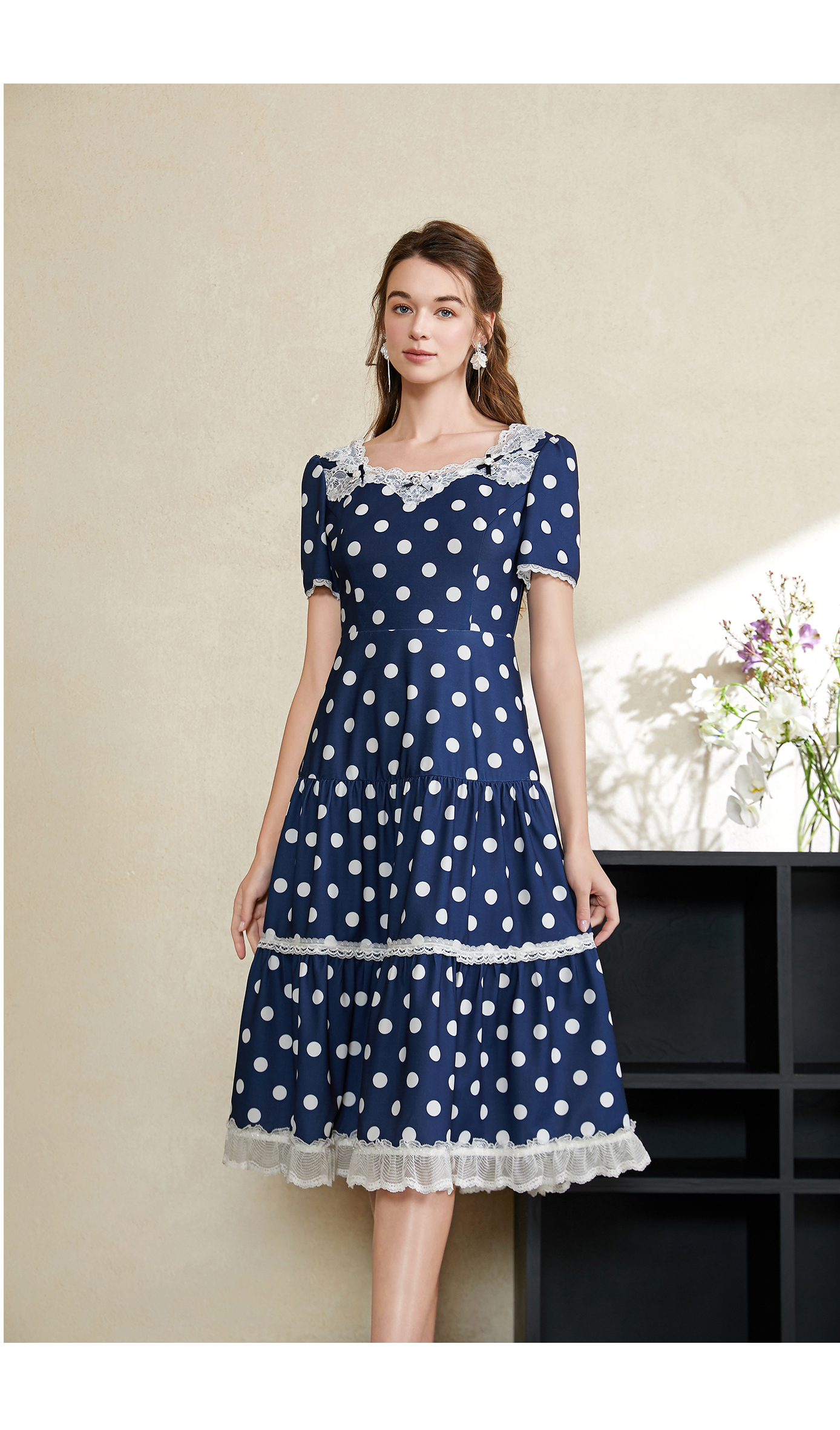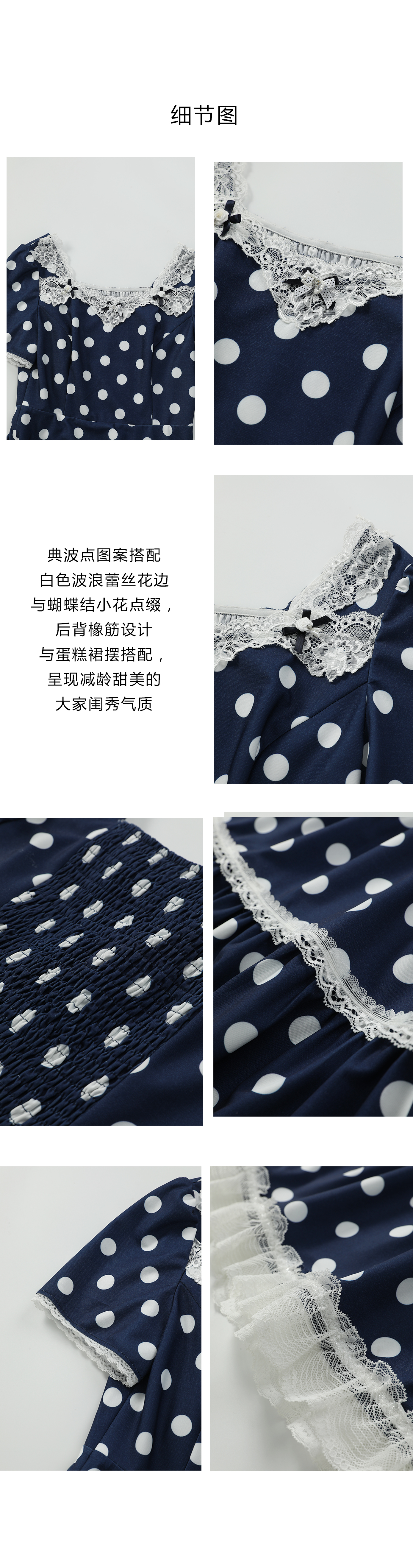 司歌波点蕾丝连衣裙短袖优雅修身A911070X