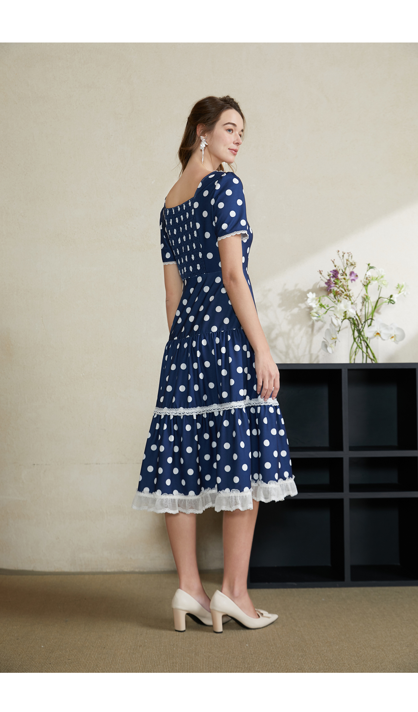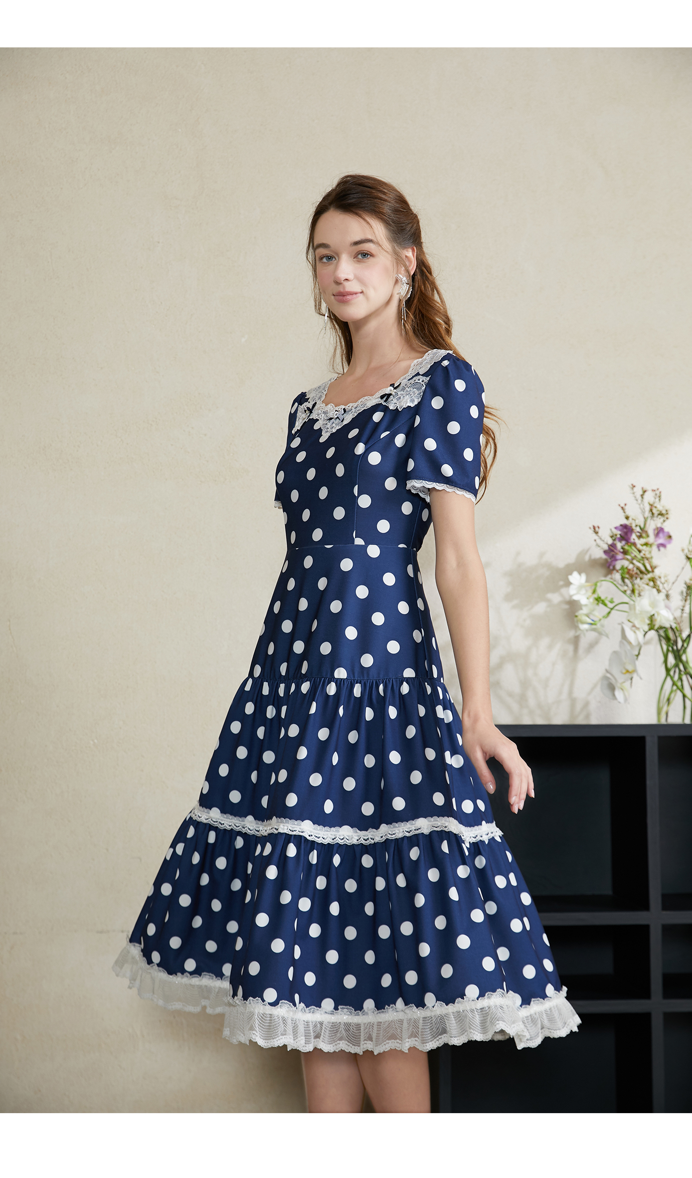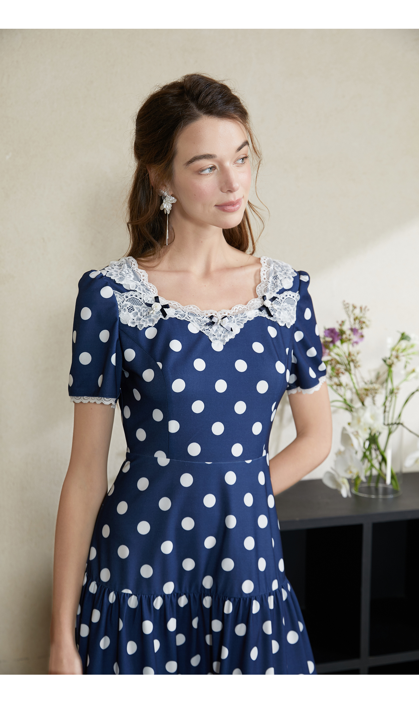 司歌波点蕾丝连衣裙短袖优雅修身A911070X