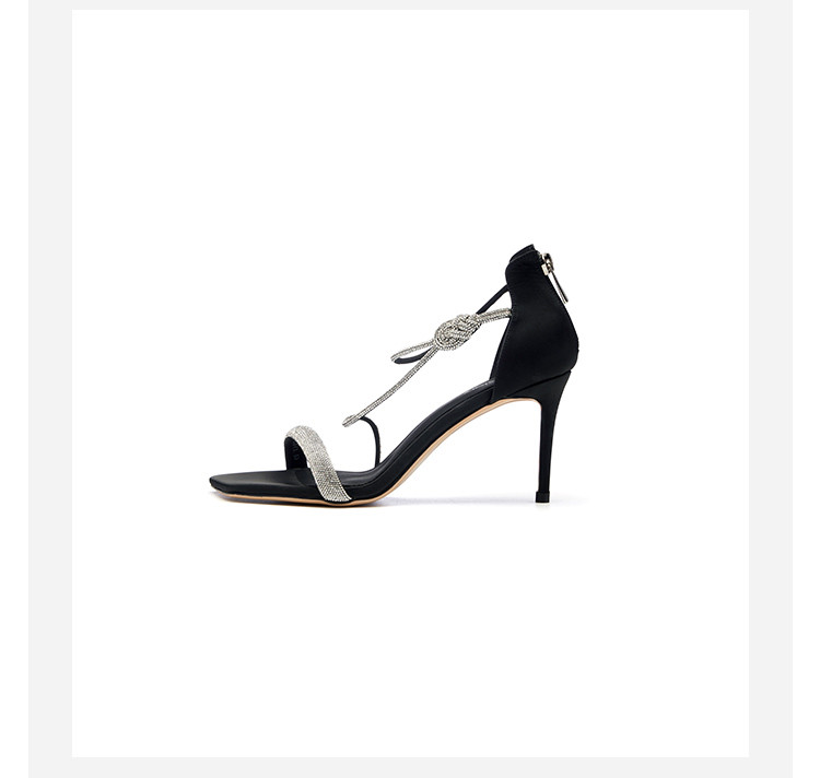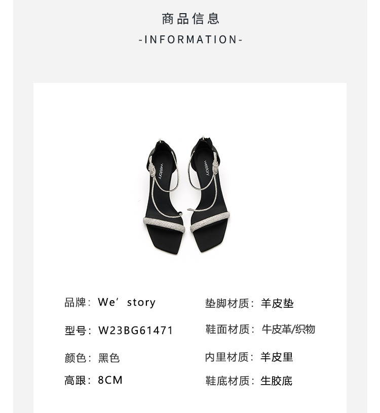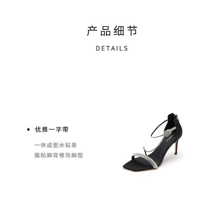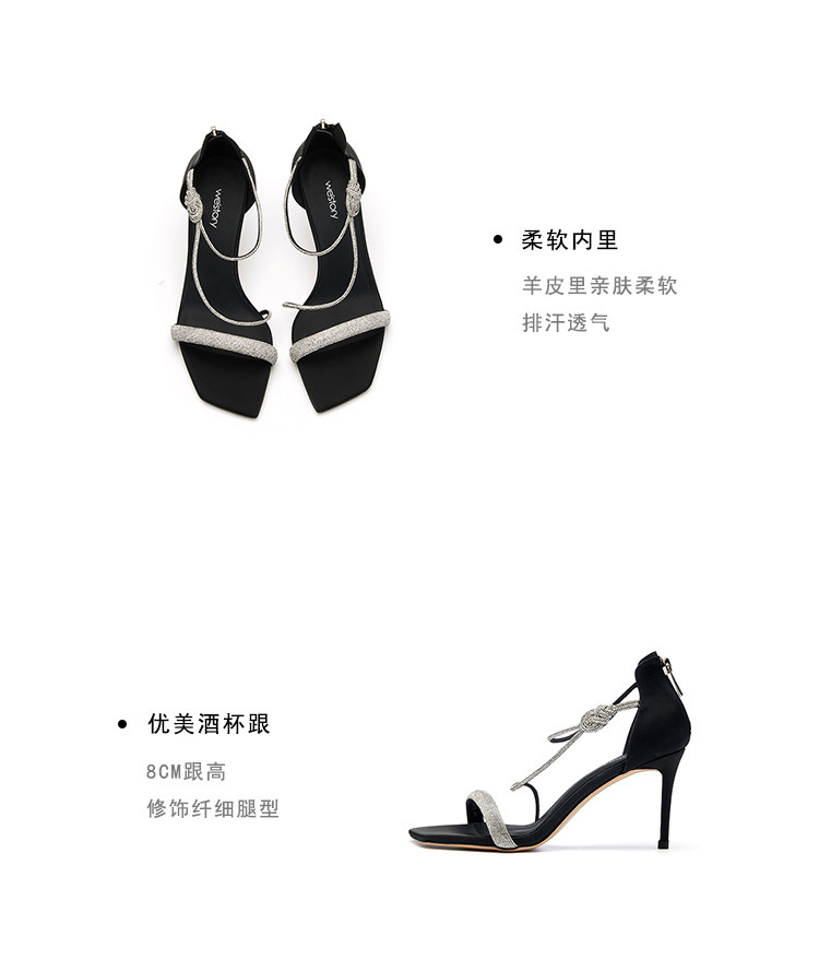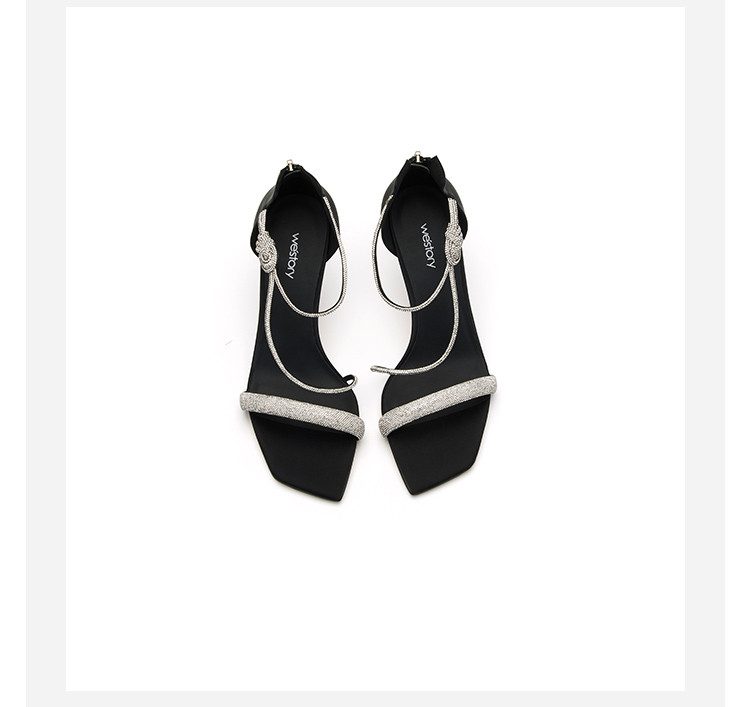 westory女鞋夏季新款尖头黑色高跟细跟银色饰扣一字带凉鞋W23BG6147101