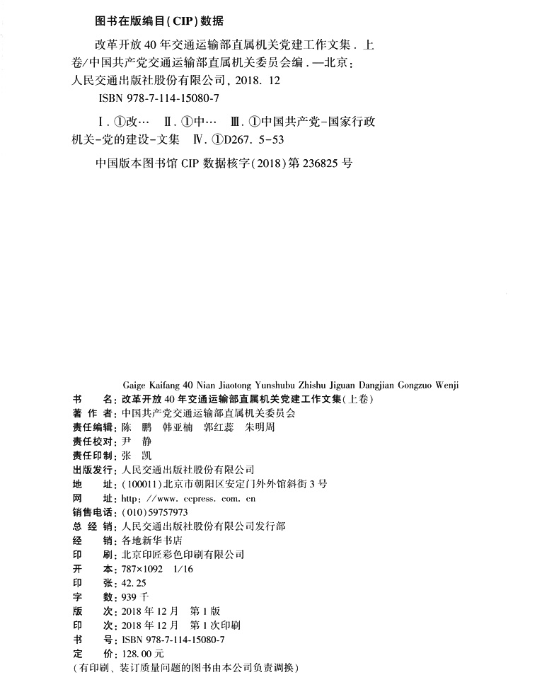 书名:改革开放40年交通运输部直属机关党建工作文集(上卷)