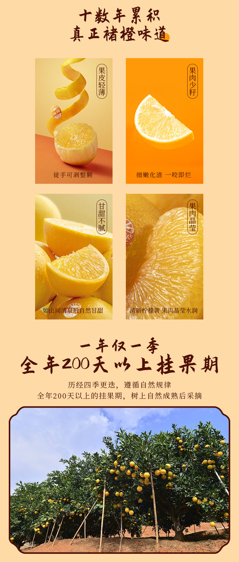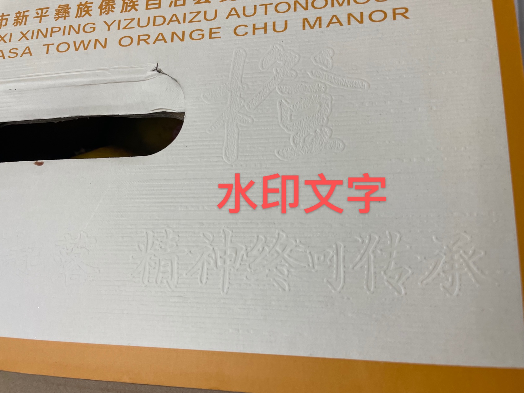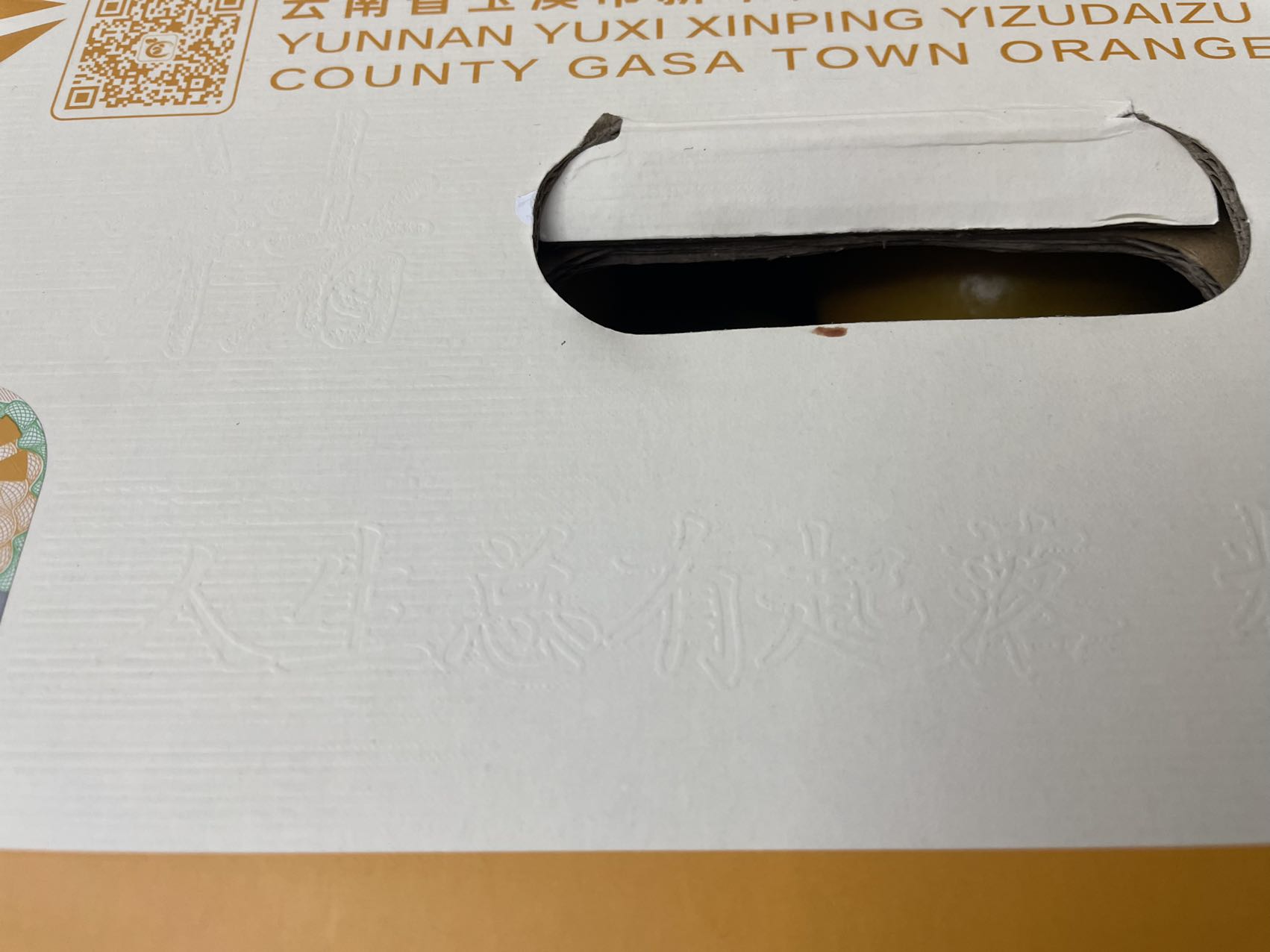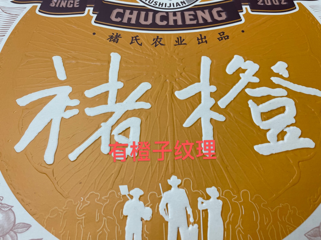 1、看正面橙子部分,今年箱子添加了橙子纹路,摸上去凹凸感强