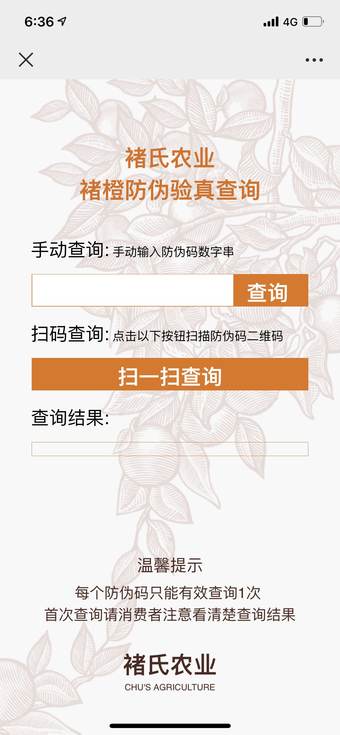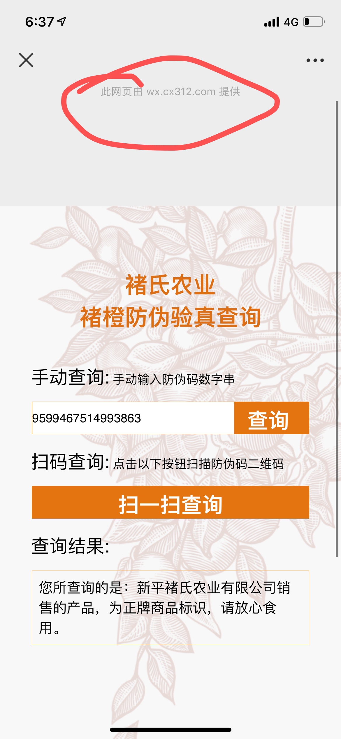 4、有防伪码,扫了以后进入褚氏农业公众号,输入验证码,一定要下拉看是否由这个网站提供,很多假货也有扫码,但是进去网址不一样