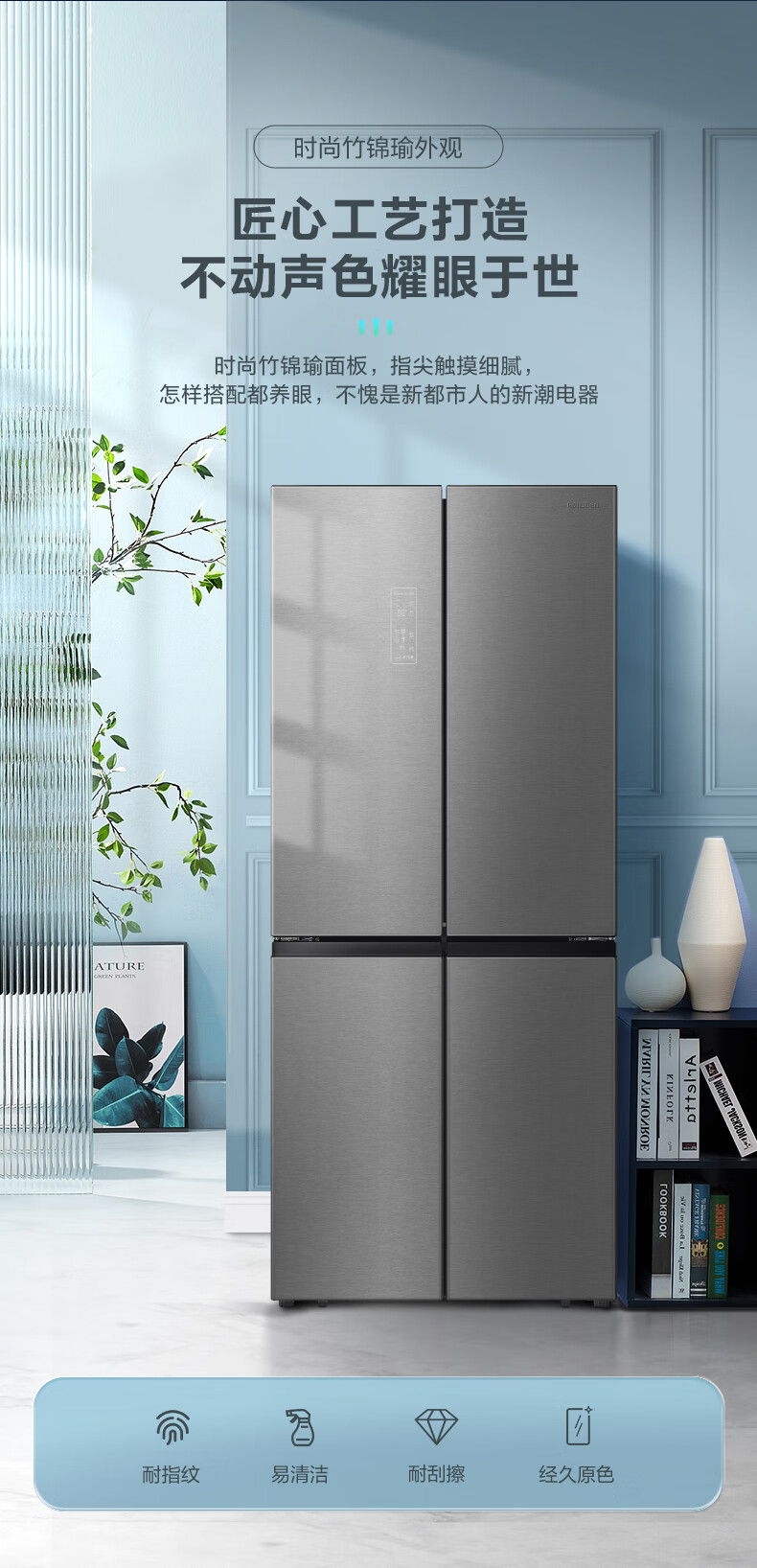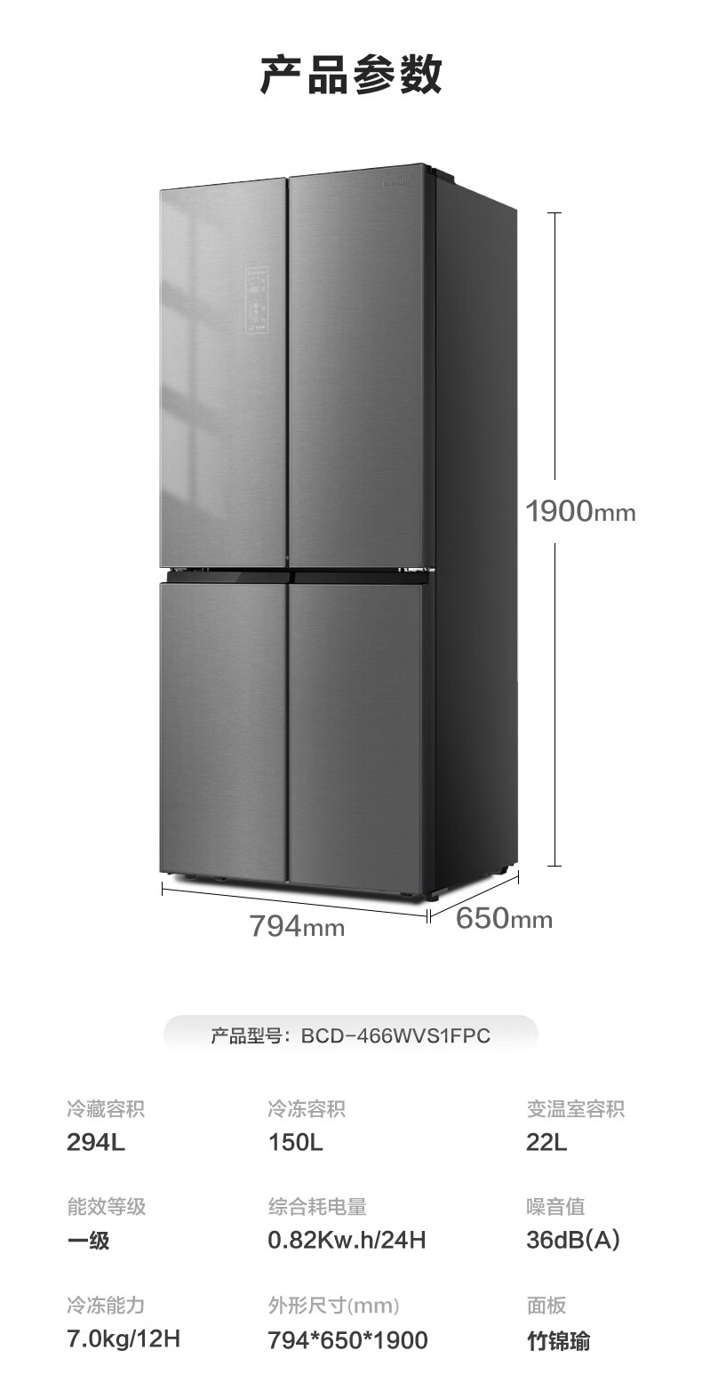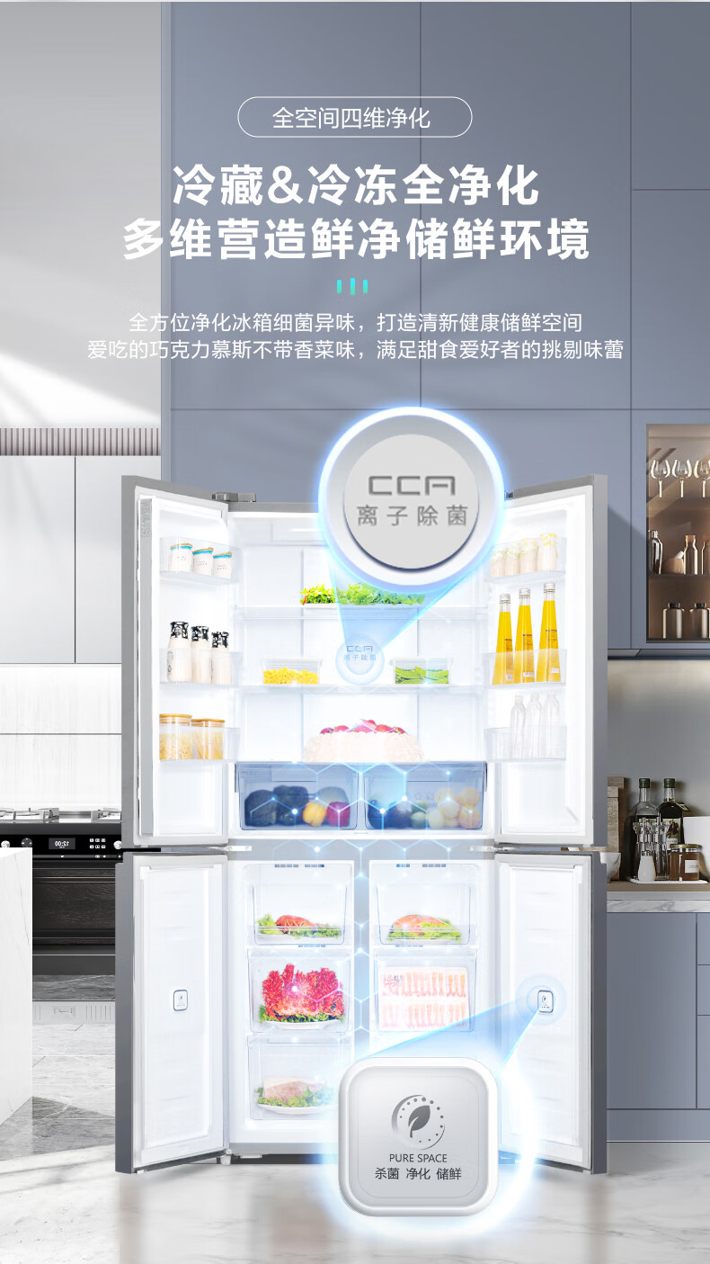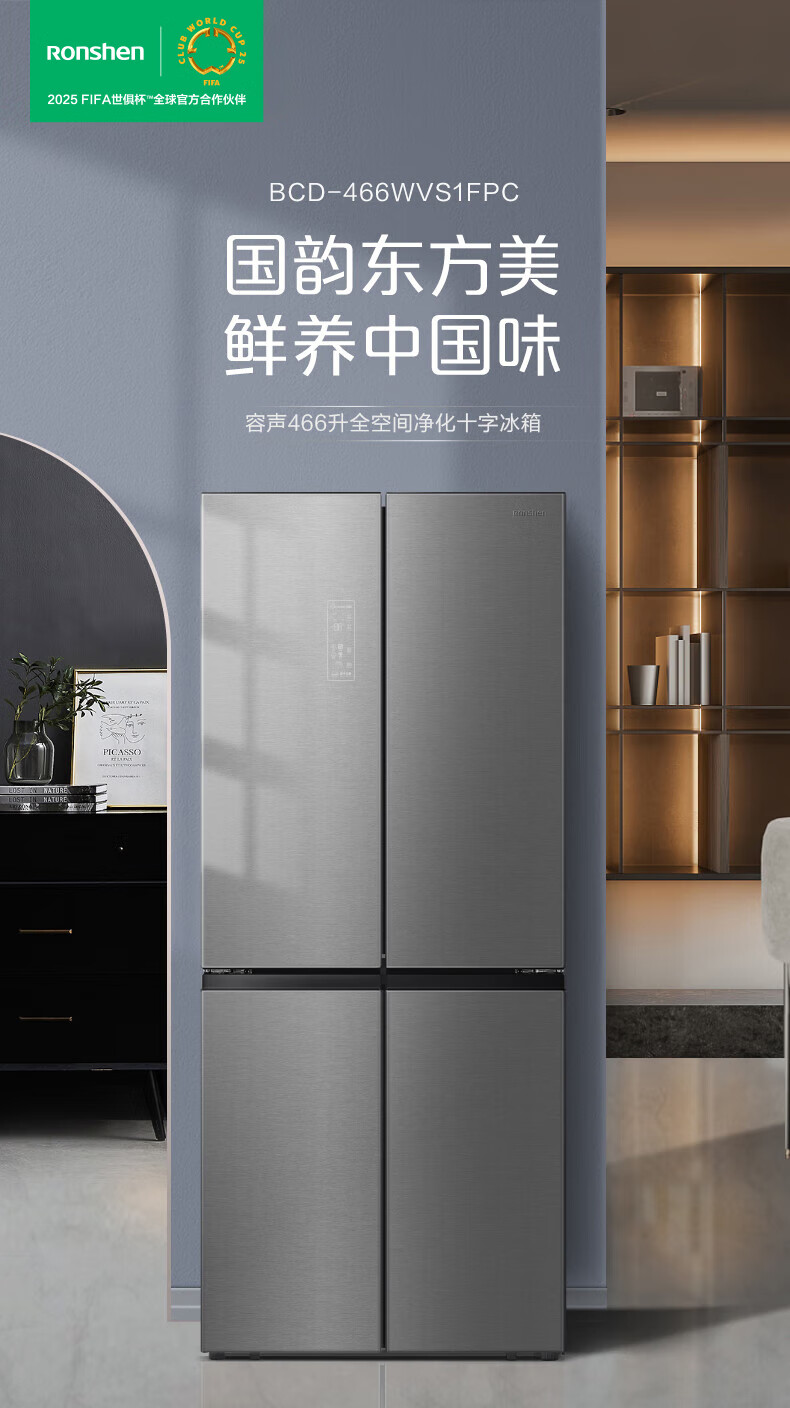 容声(Ronshen)466升 十字四开门冰箱 变频一级能效 风冷无霜 冷藏冷冻全净化 三档变温 彩晶面板BCD-466WVS1FPC