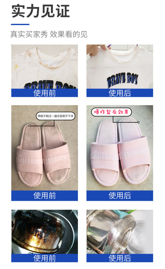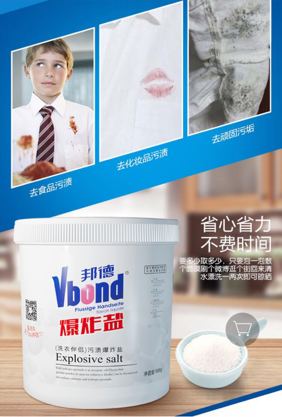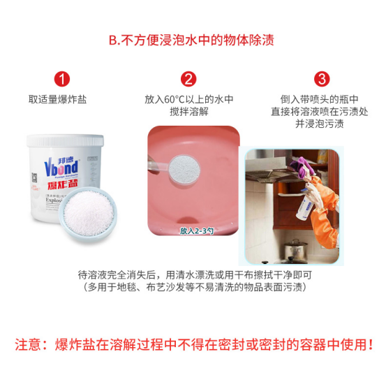 爆炸盐:丝绸、毛衣、皮革、翻皮不适用,染色,褪色,沾墨的衣服不得适用 强力清洗顽固物质,衣服泛黄,油渍轻松搞定~