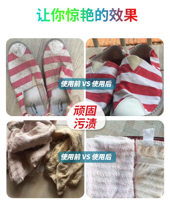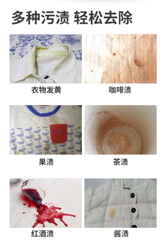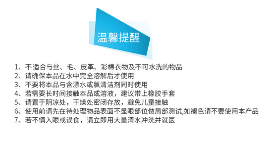 温馨提示:对于比较顽固污渍,睡觉前用60~80摄氏度的水将产品溶解,然后将脏衣物浸入一夜,第二天轻轻揉搓,清水冲洗干净就好啦