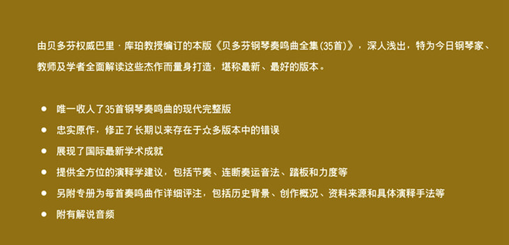 收入了35首钢琴奏鸣曲的现代完整版;忠实原作,修正了长期以来存在于众多版本中的错误;展现了国际最新学术成就;提供全方位的演释学建议,包括节奏、连断奏运音法、踏板和力度等;另附专册为每首奏鸣曲作详细评注,包括历史背景、创作概况、资料来源和具体演释手法等;