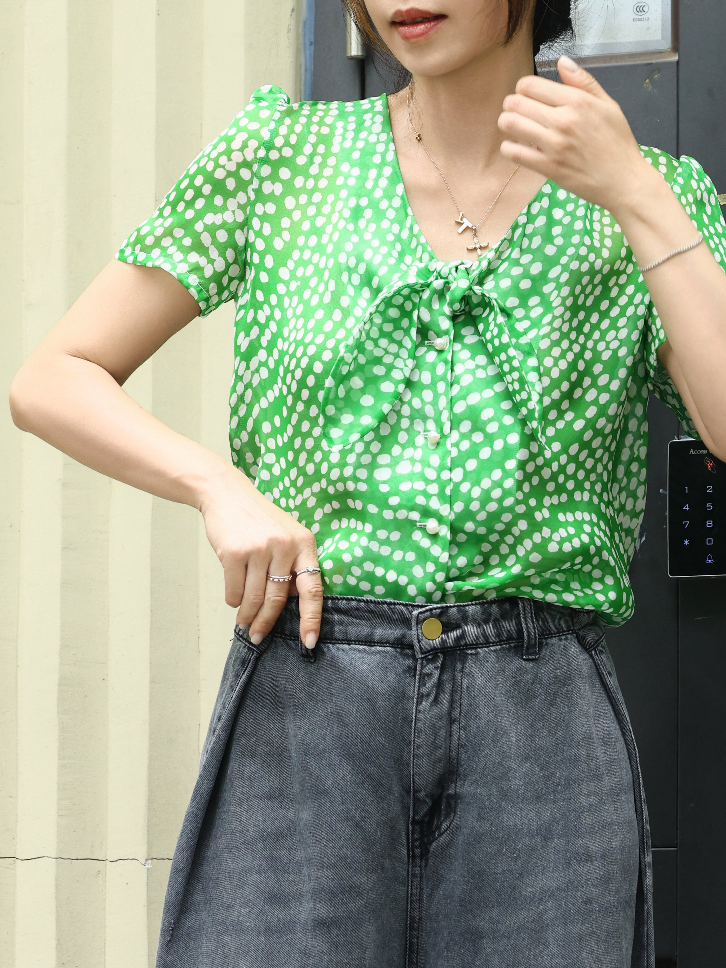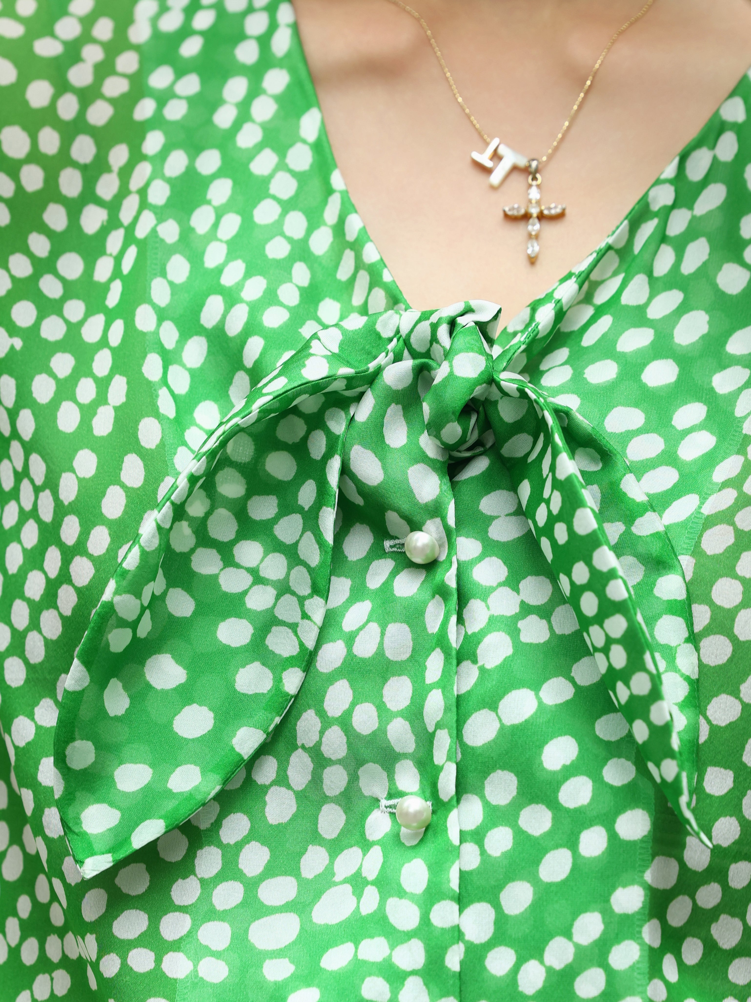 TYNVIE 系带透视短袖衬衫 - 绿色波点