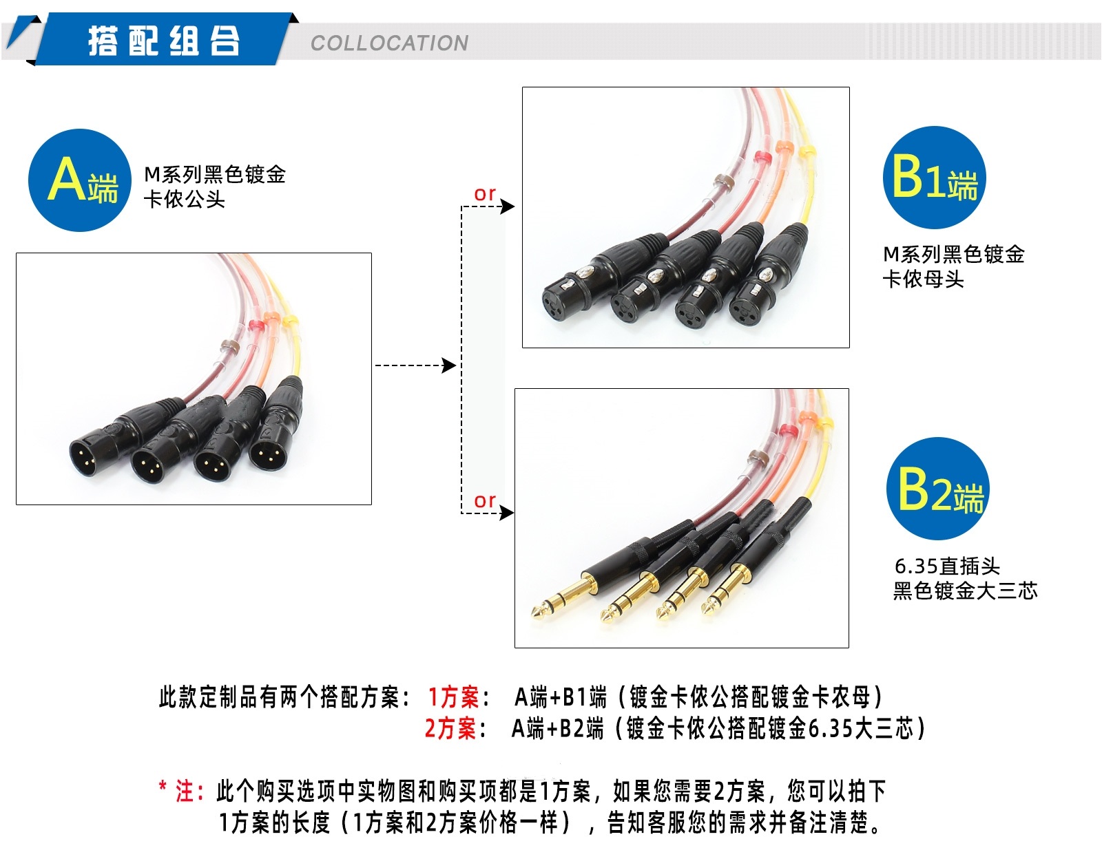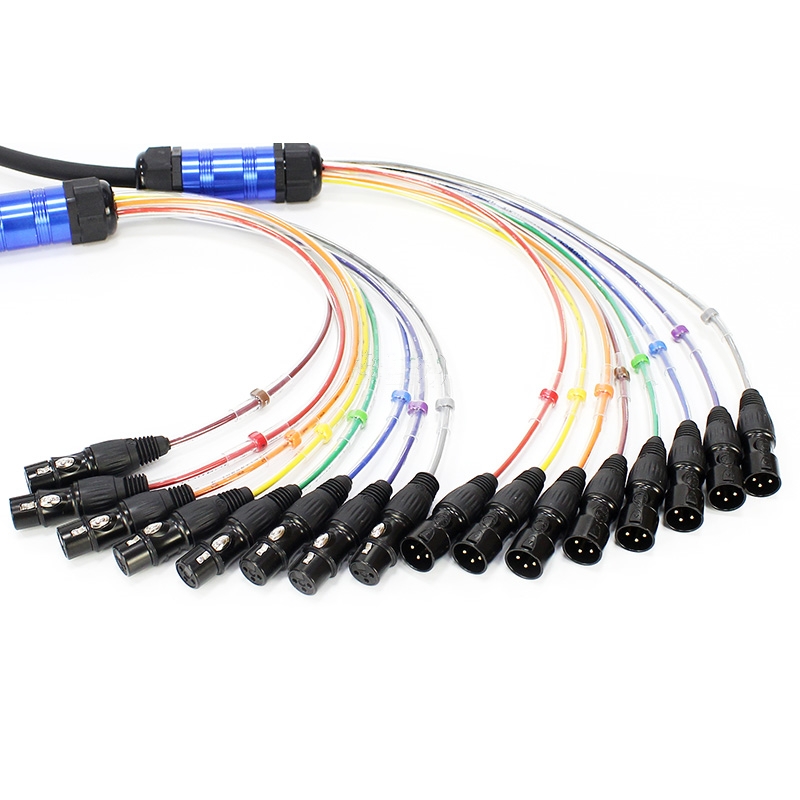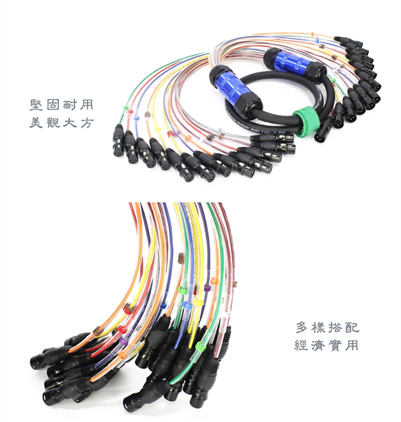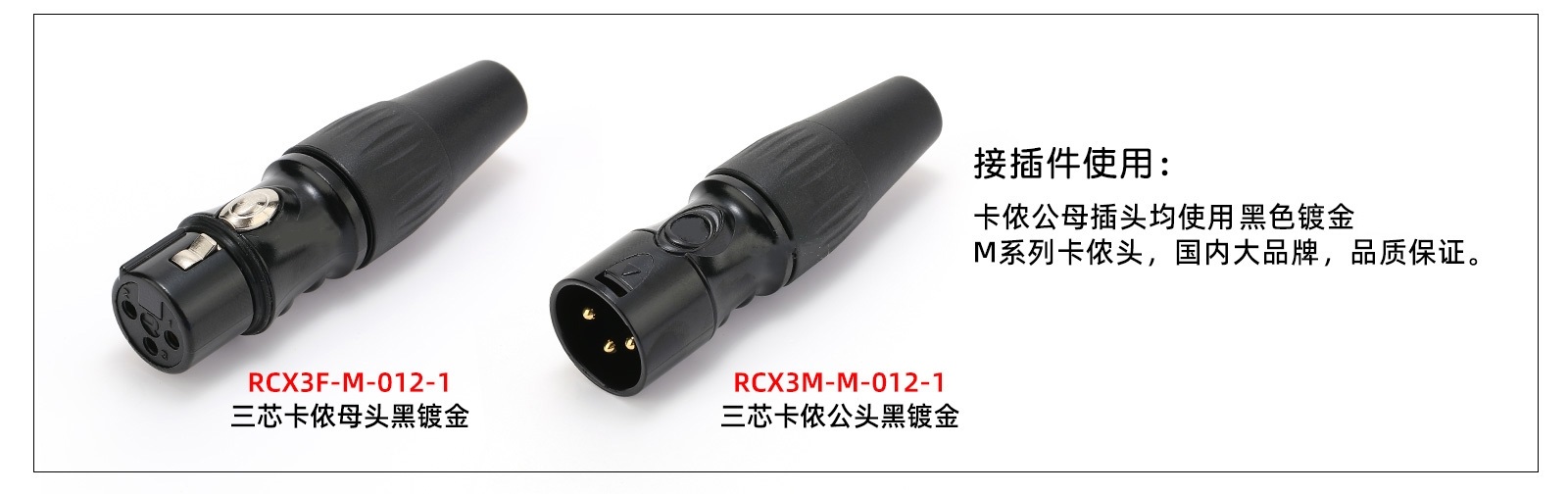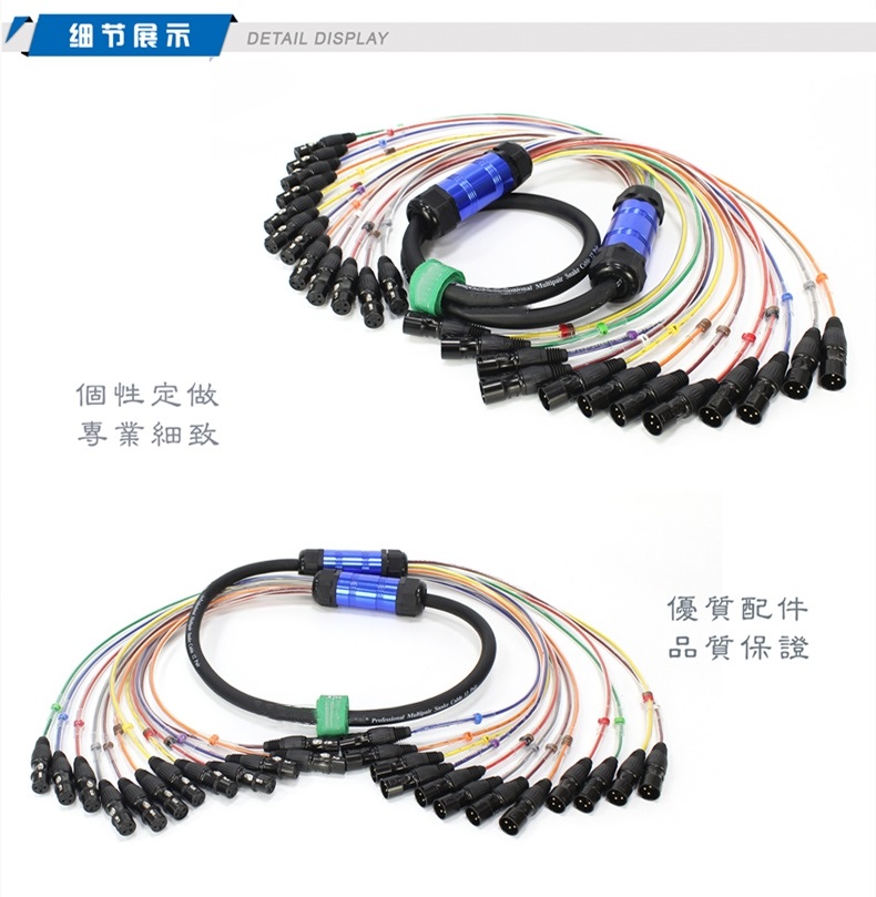 此线缆采用金皇瑞的2/4/8/12/16/24路彩虹音频线缆,搭配M系列黑色镀金公母卡农插头。