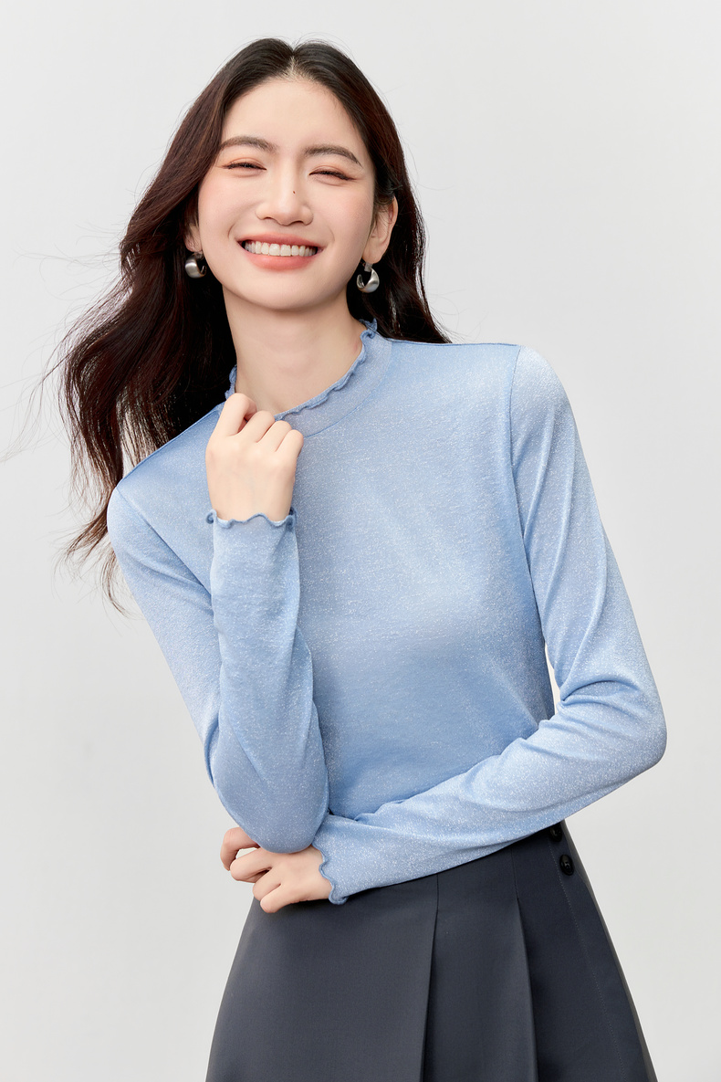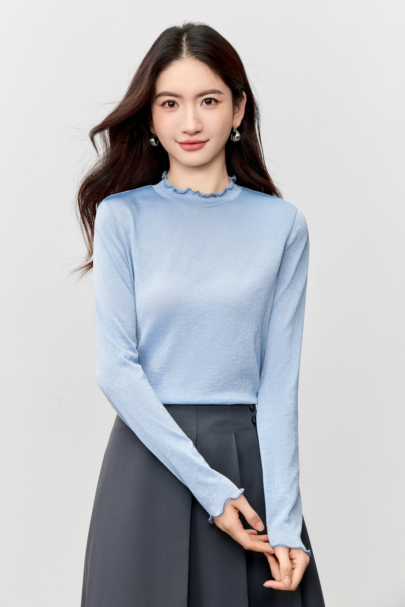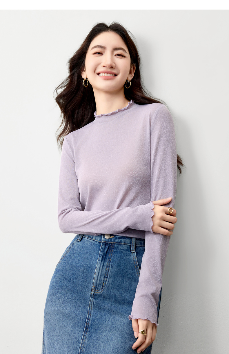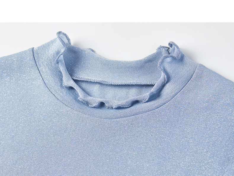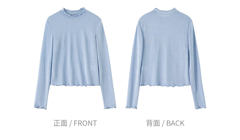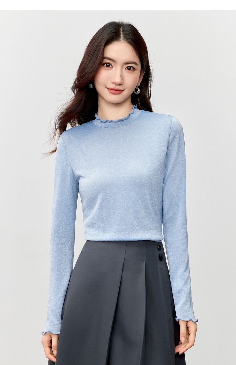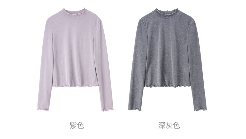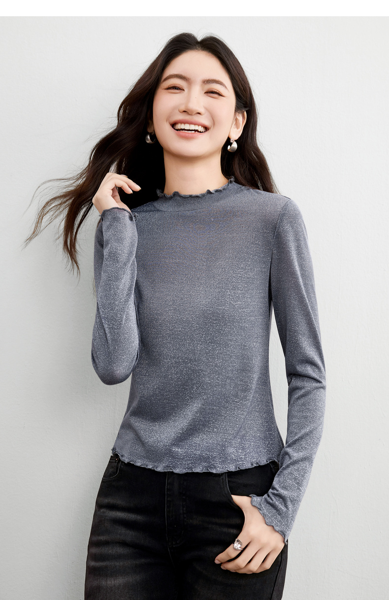 【内购】【通搭三季】优雅通勤波浪边半高领长袖修身银丝针织外穿内搭T恤-153TN2717