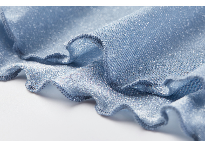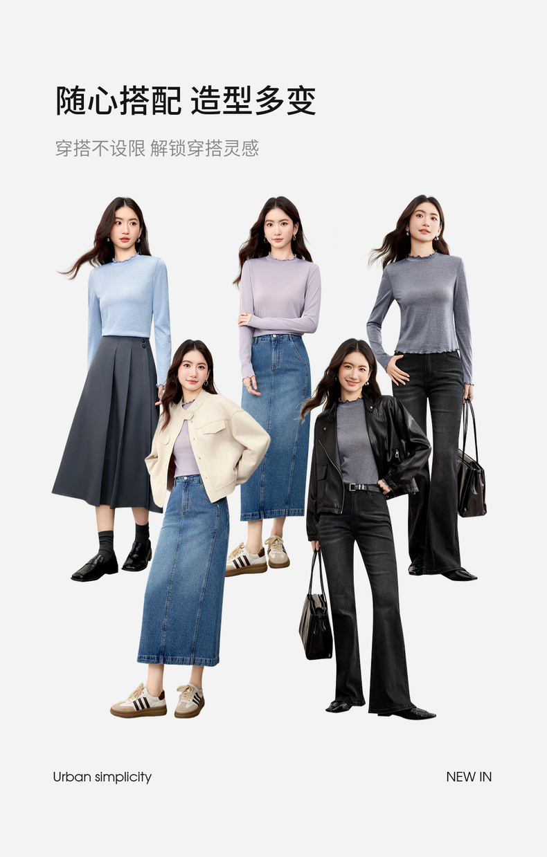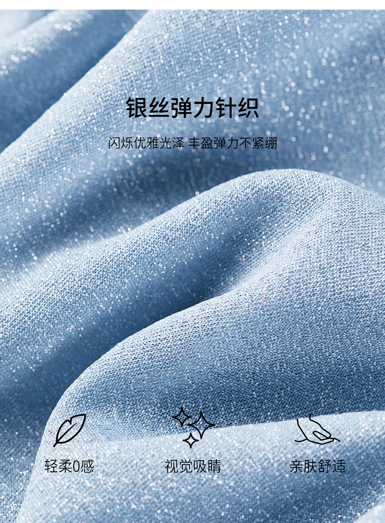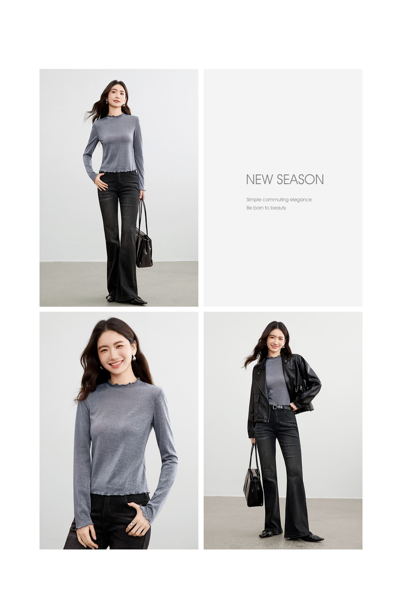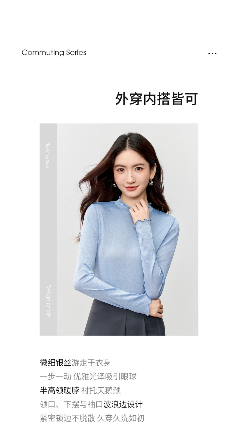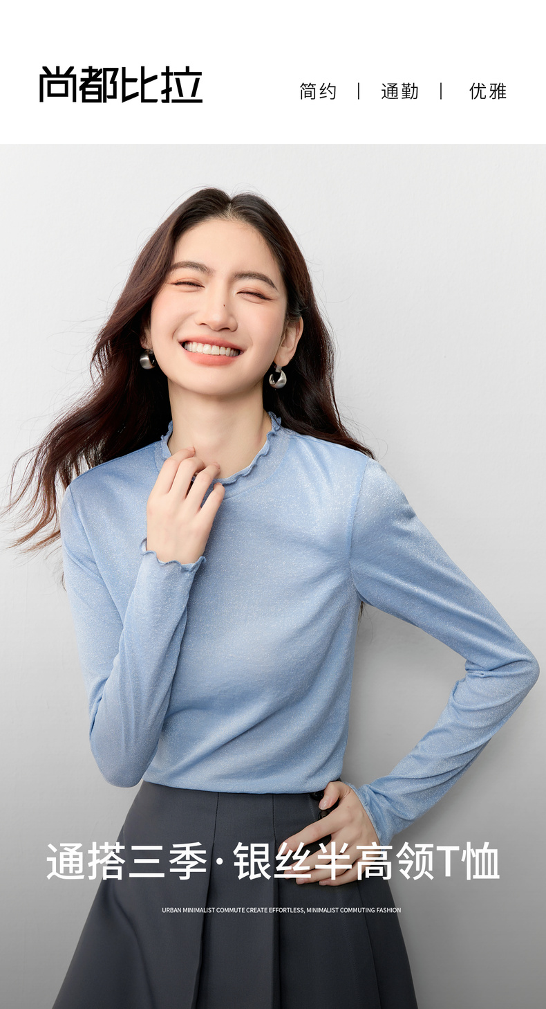 【内购】【通搭三季】优雅通勤波浪边半高领长袖修身银丝针织外穿内搭T恤-153TN2717