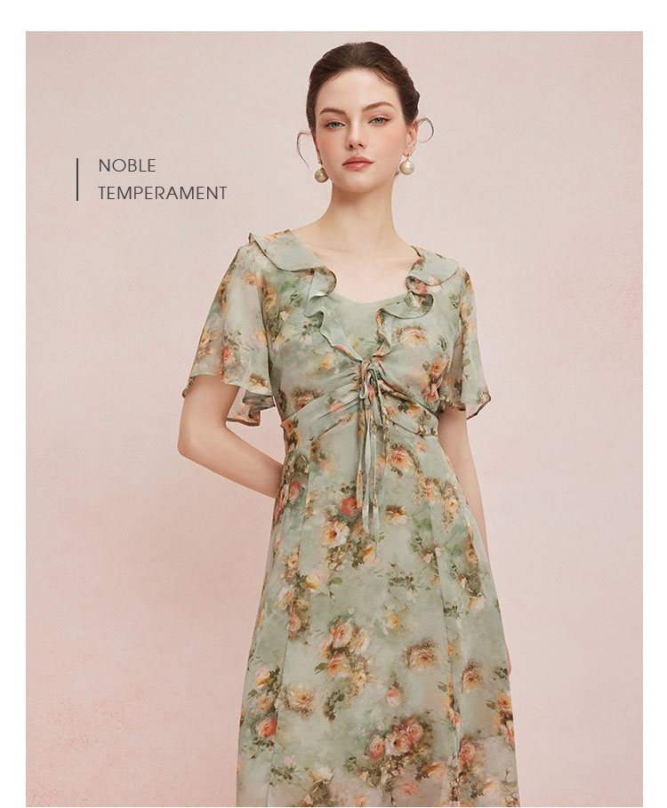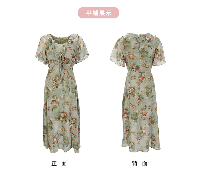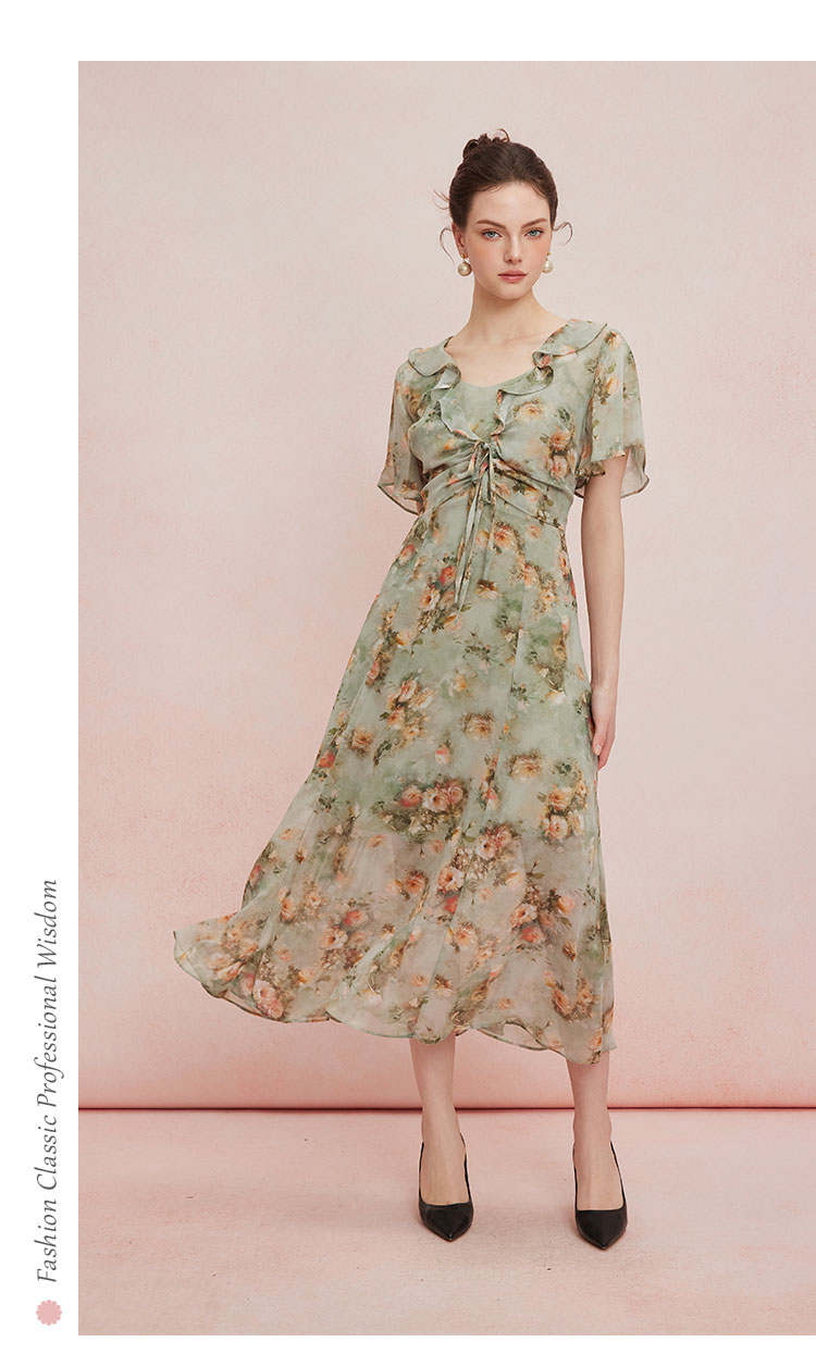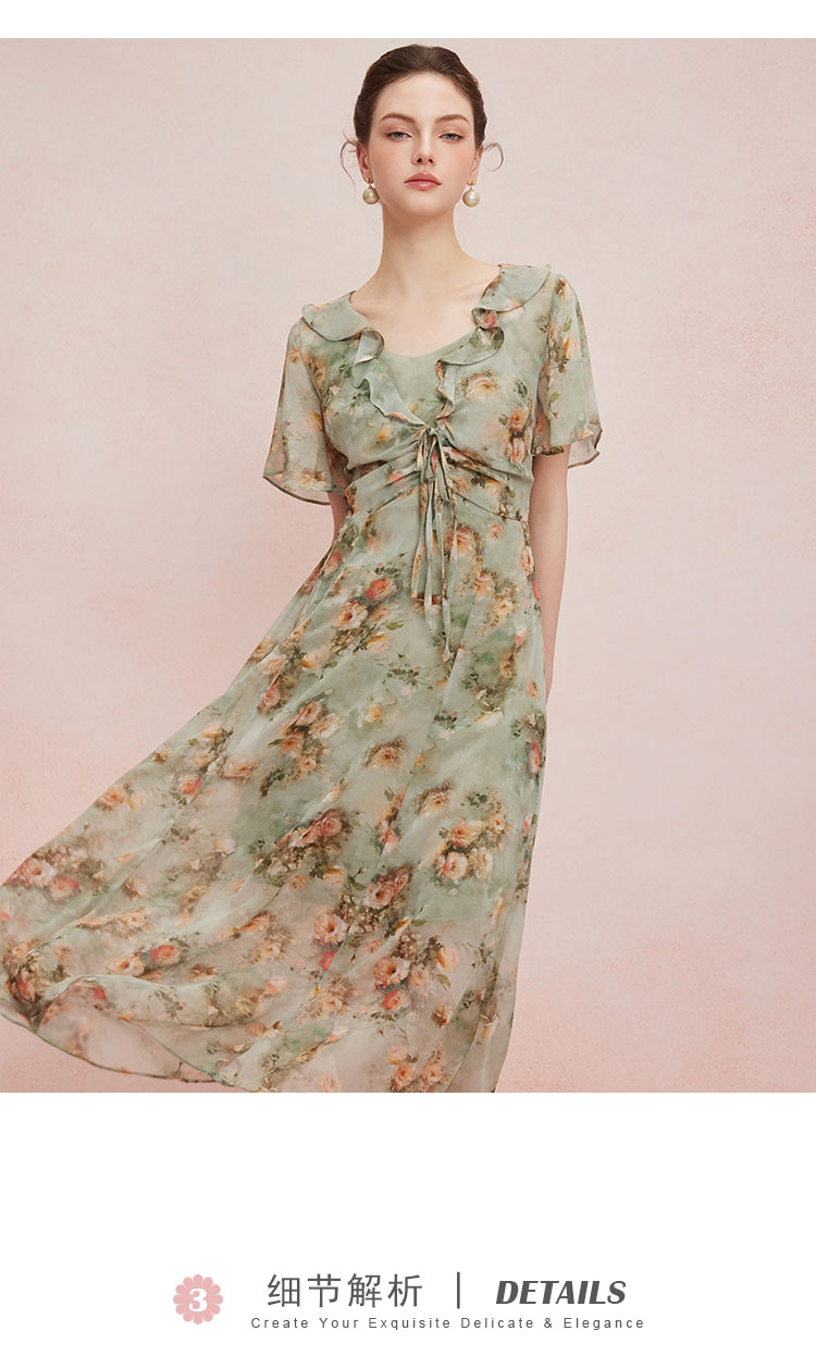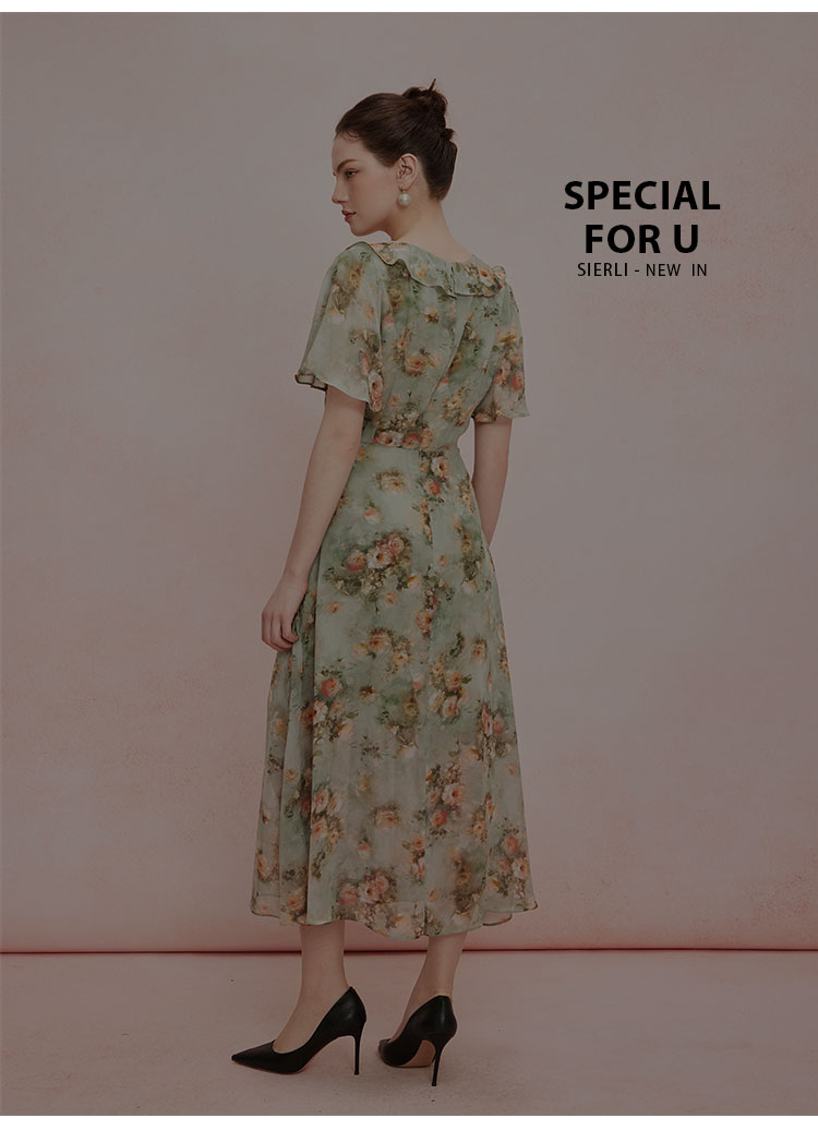 QF829斯尔丽25新款法式浪漫高腰节荷叶边女人味十足散大摆碎花连衣裙