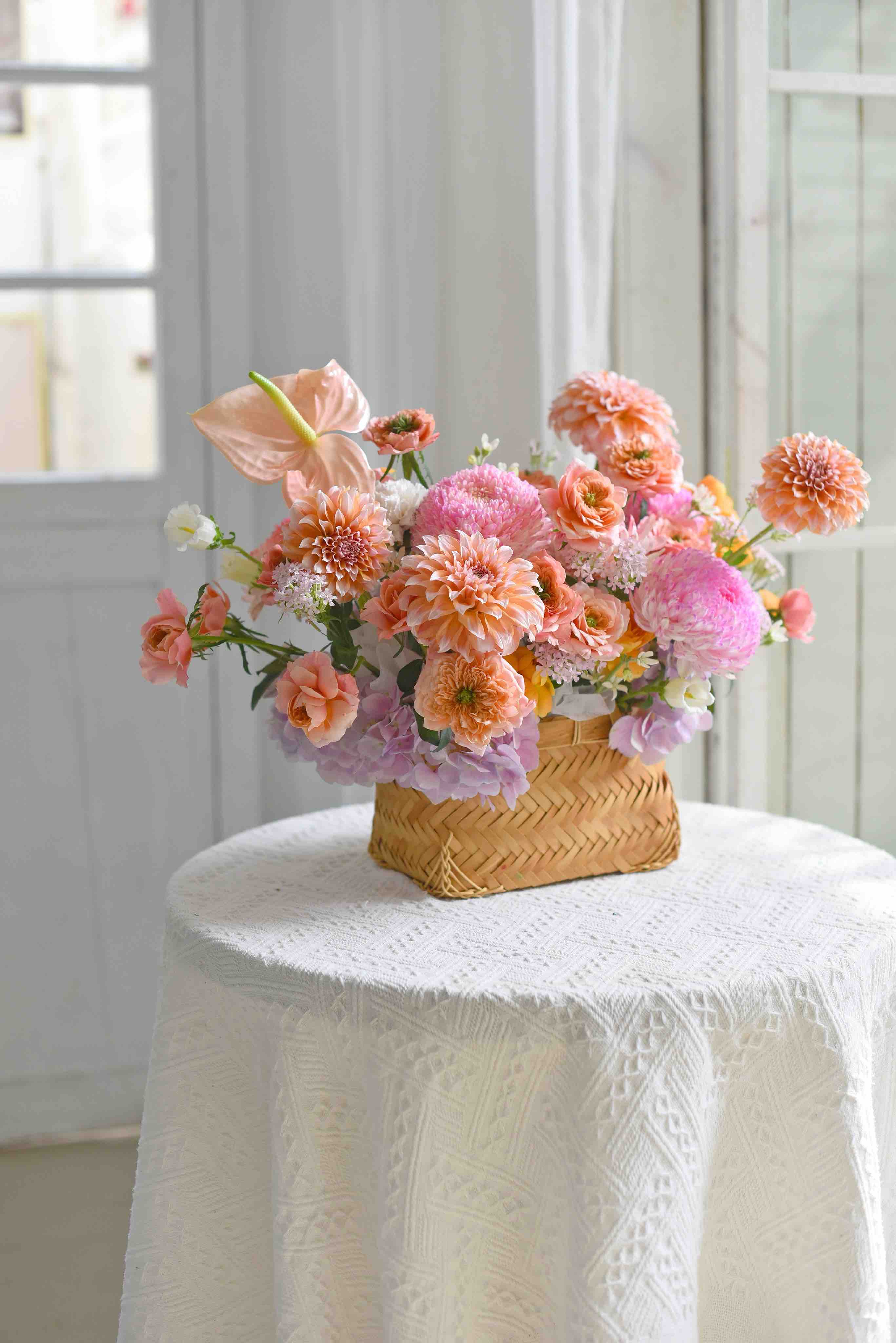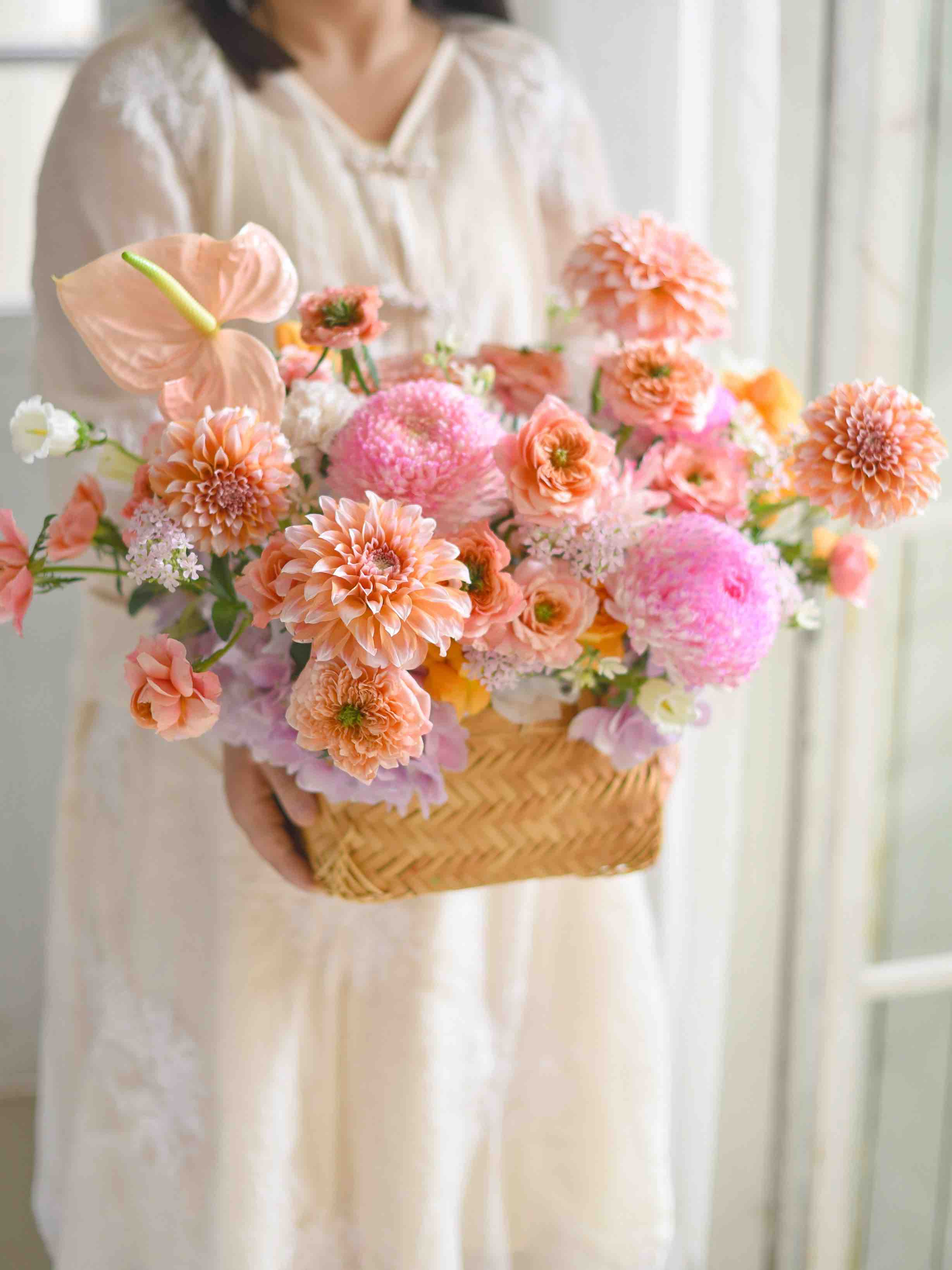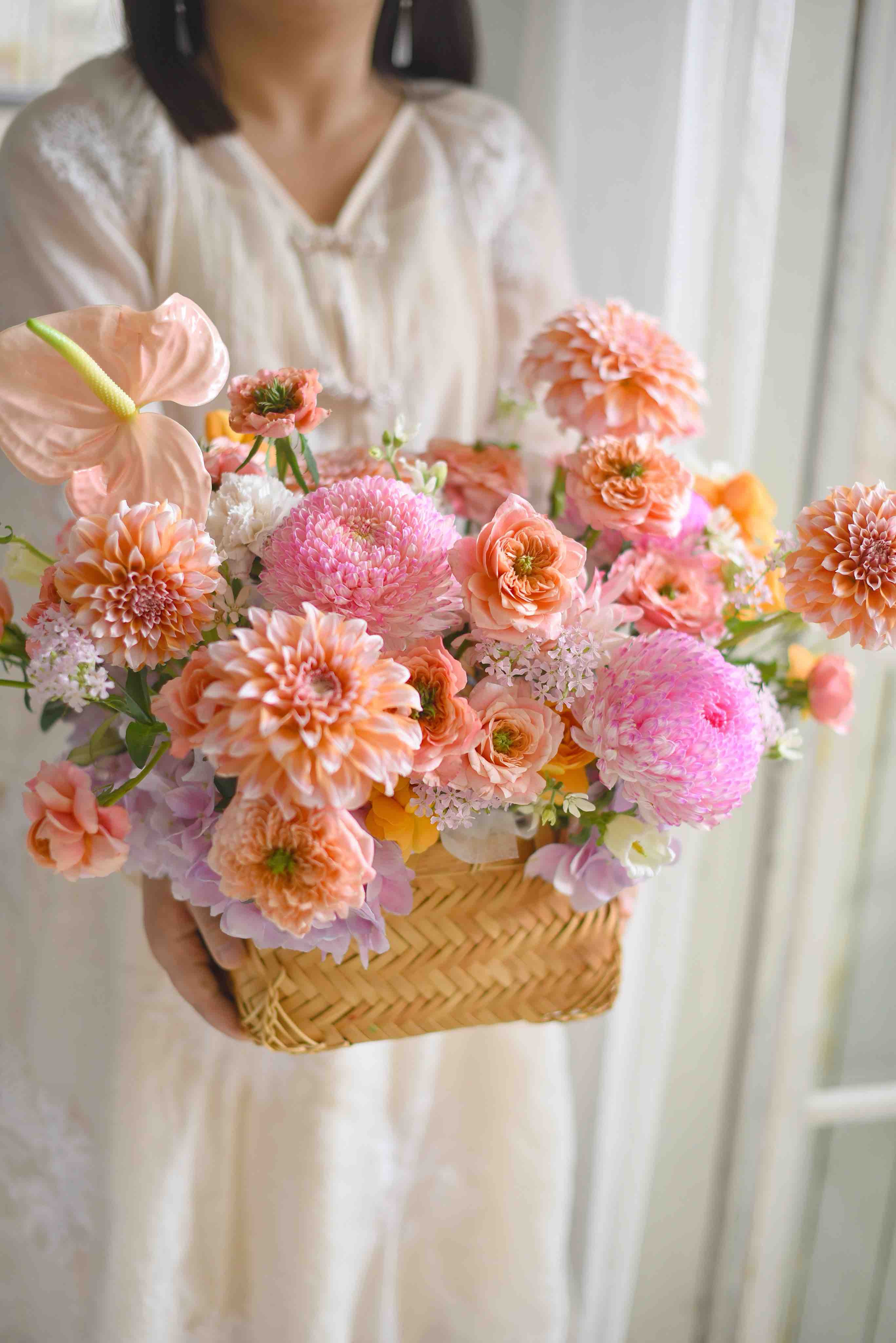 《藻雪漫游》奶油桃子牡丹菊手提花篮