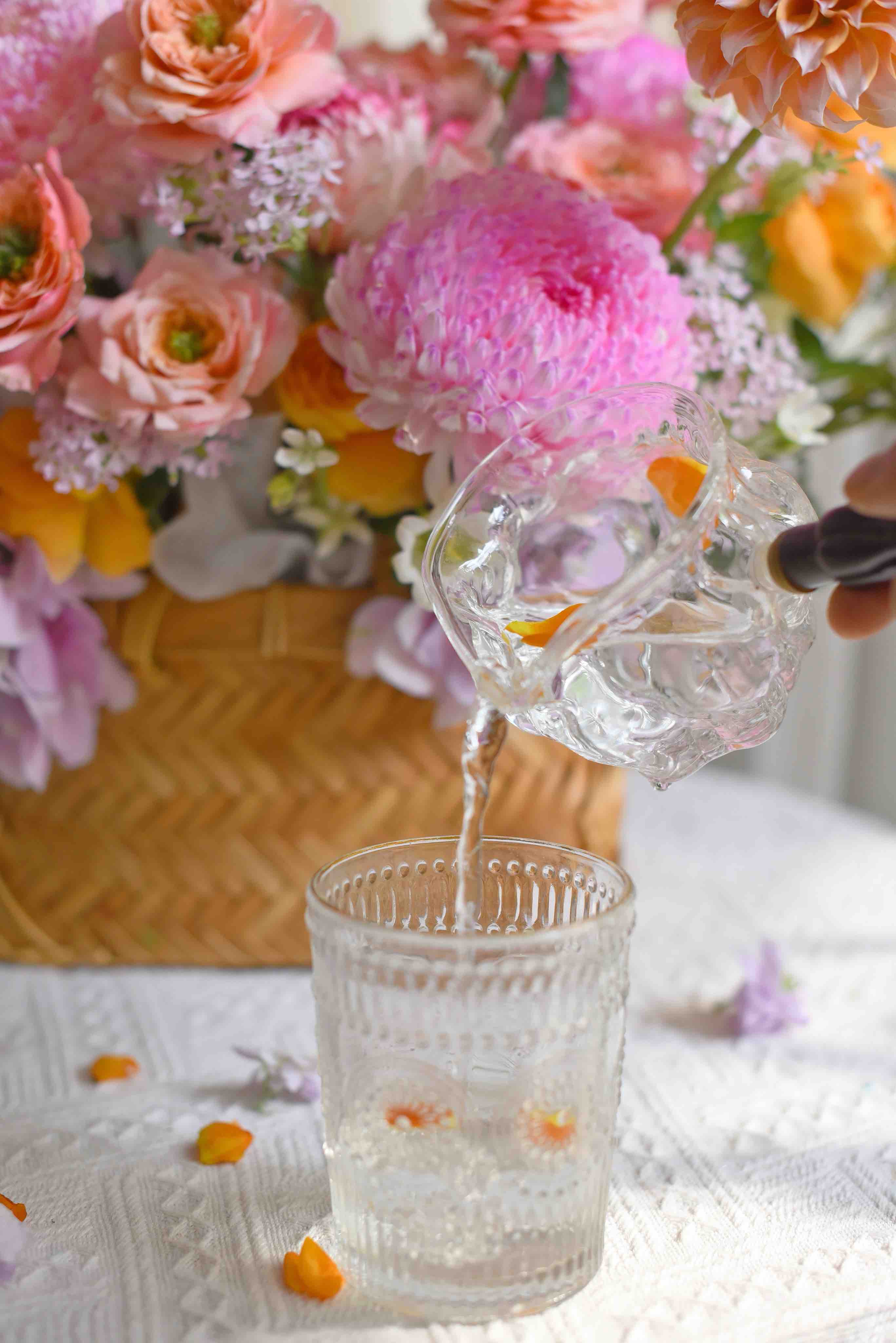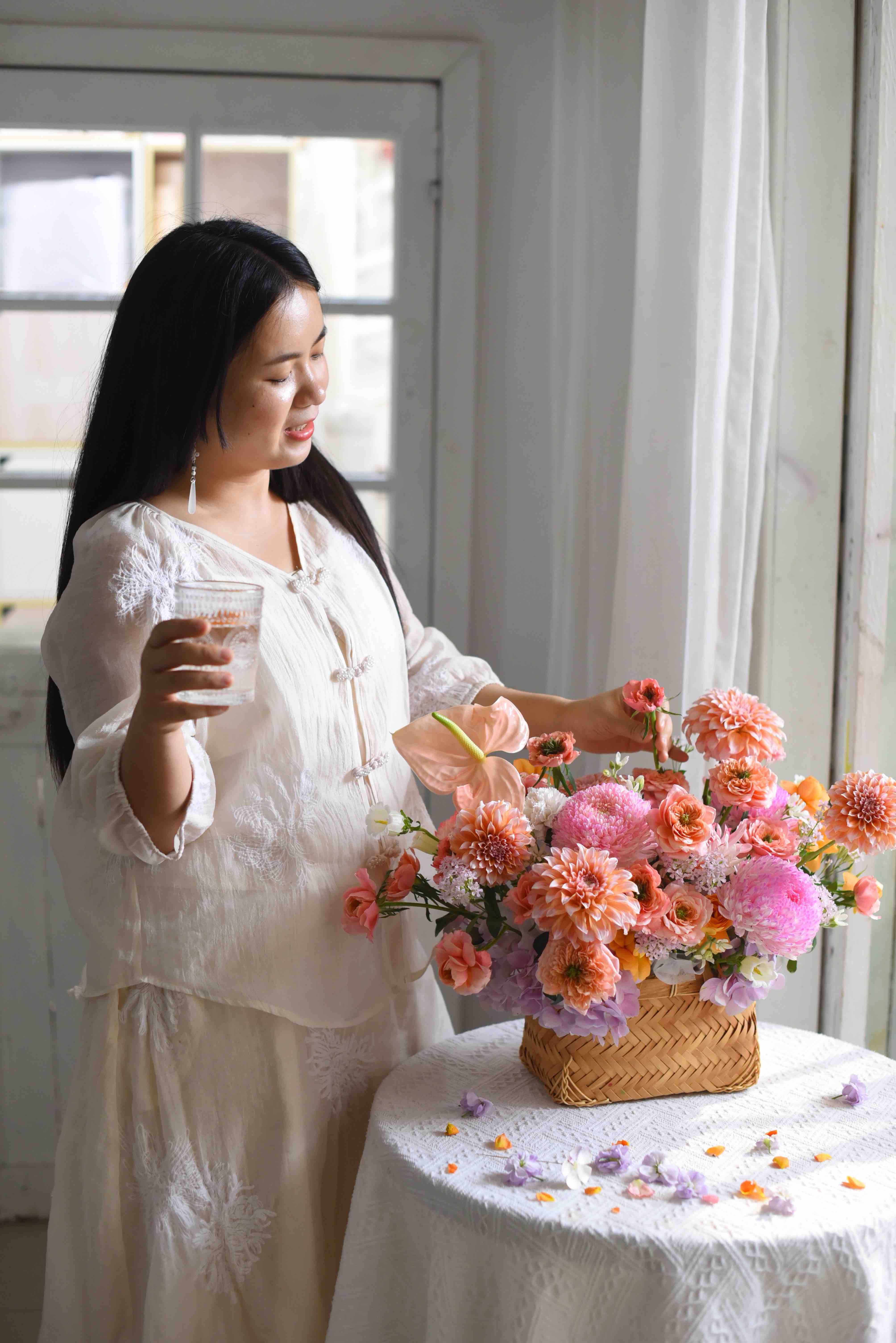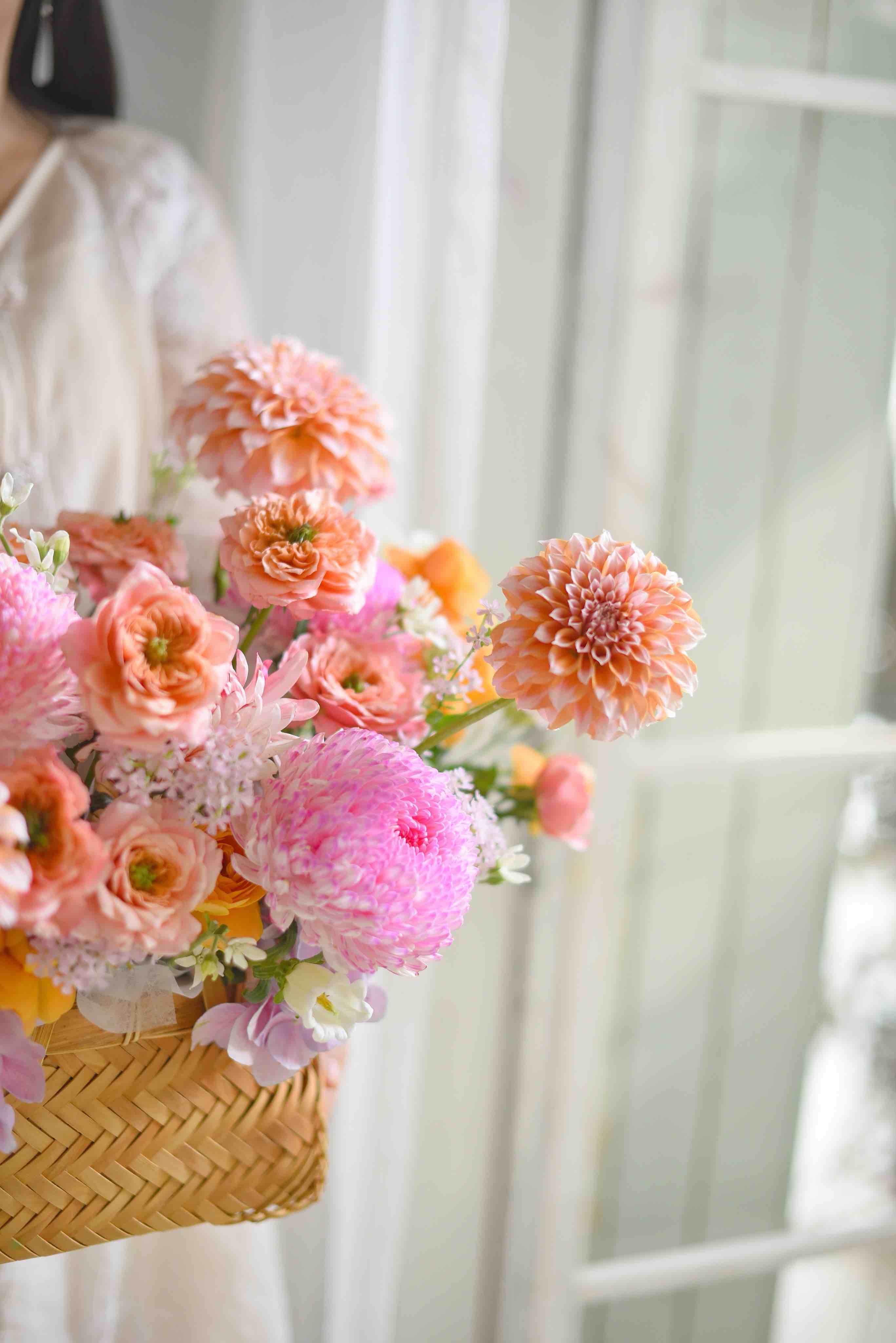 《藻雪漫游》奶油桃子牡丹菊手提花篮
