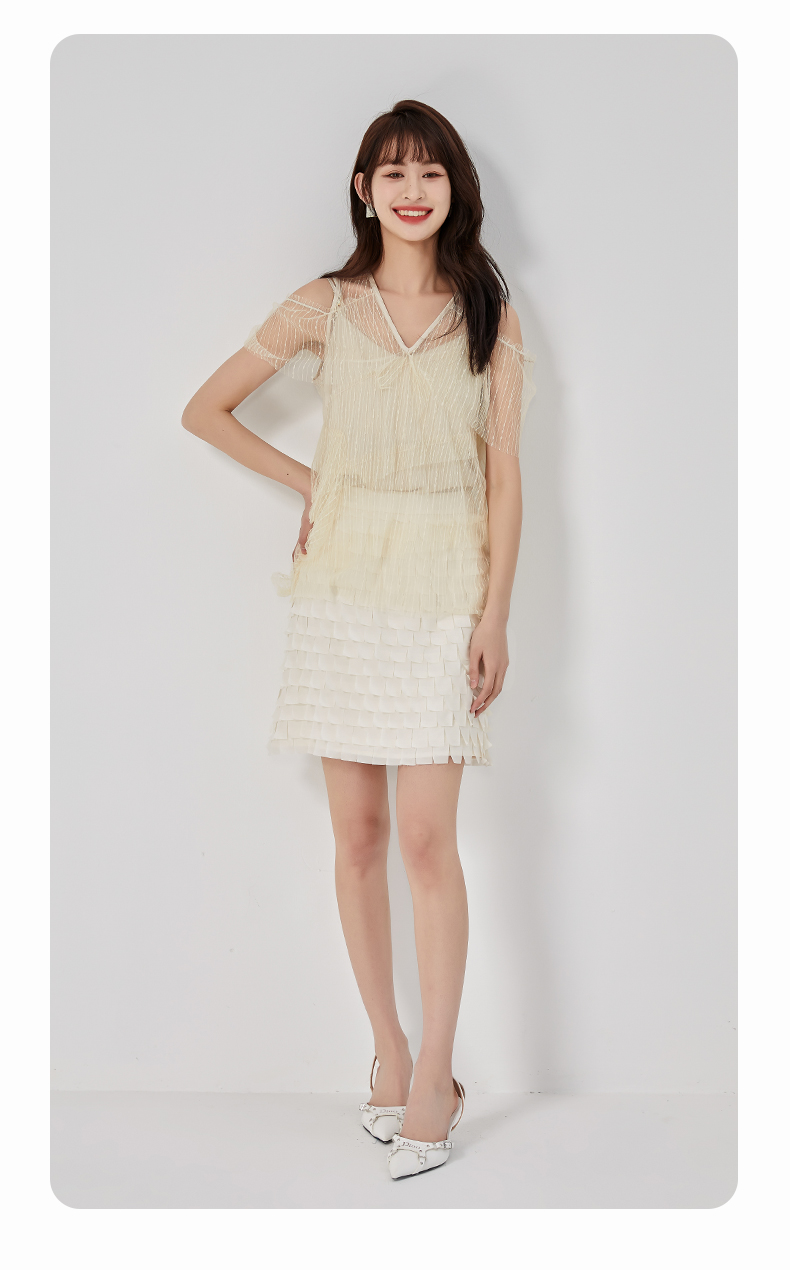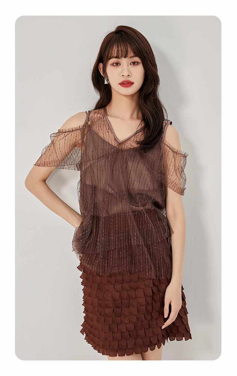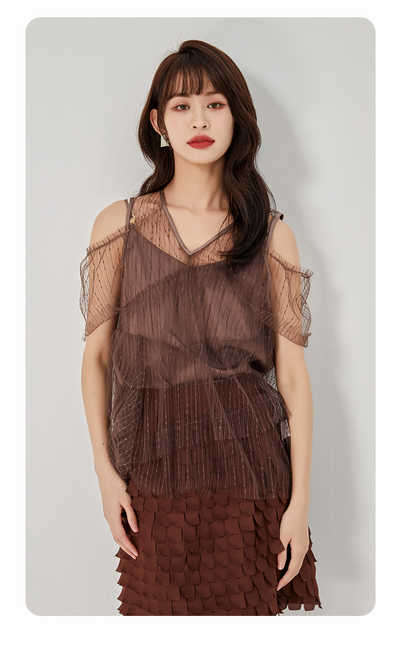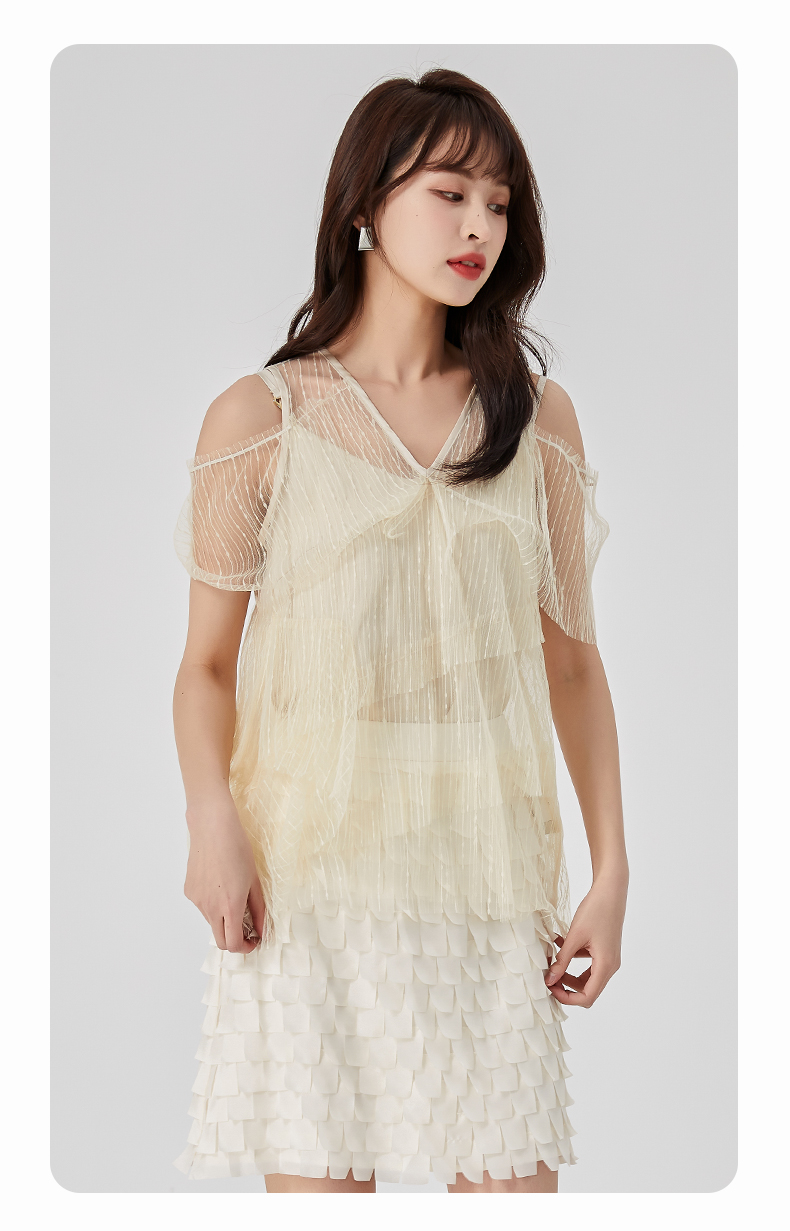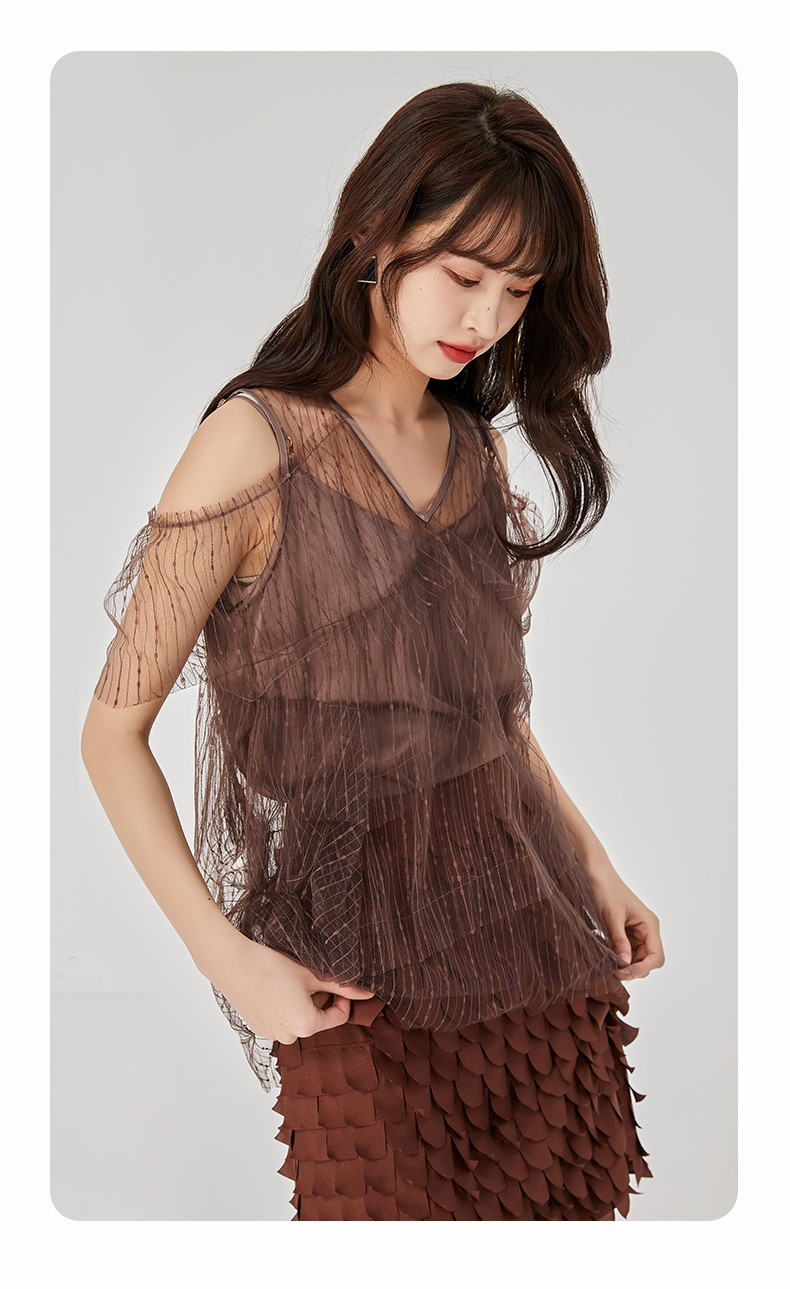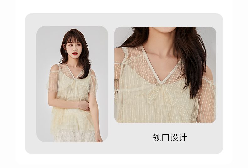 oldcolour夏新款设计感小众网纱V领套头衫两件套女O21011173