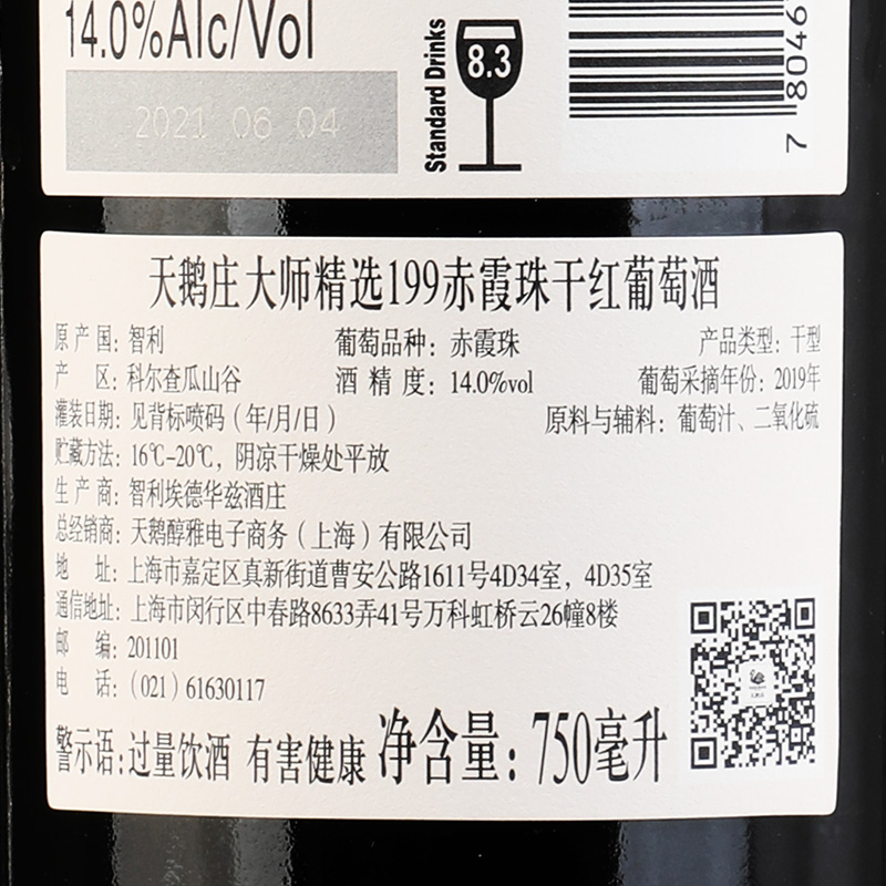 天鹅庄智利原瓶进口干红葡萄酒 750mL 大师精选199赤霞珠干红