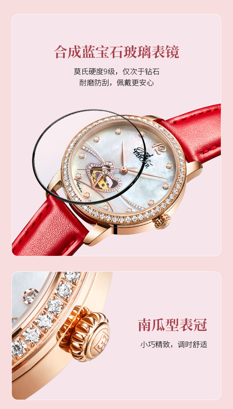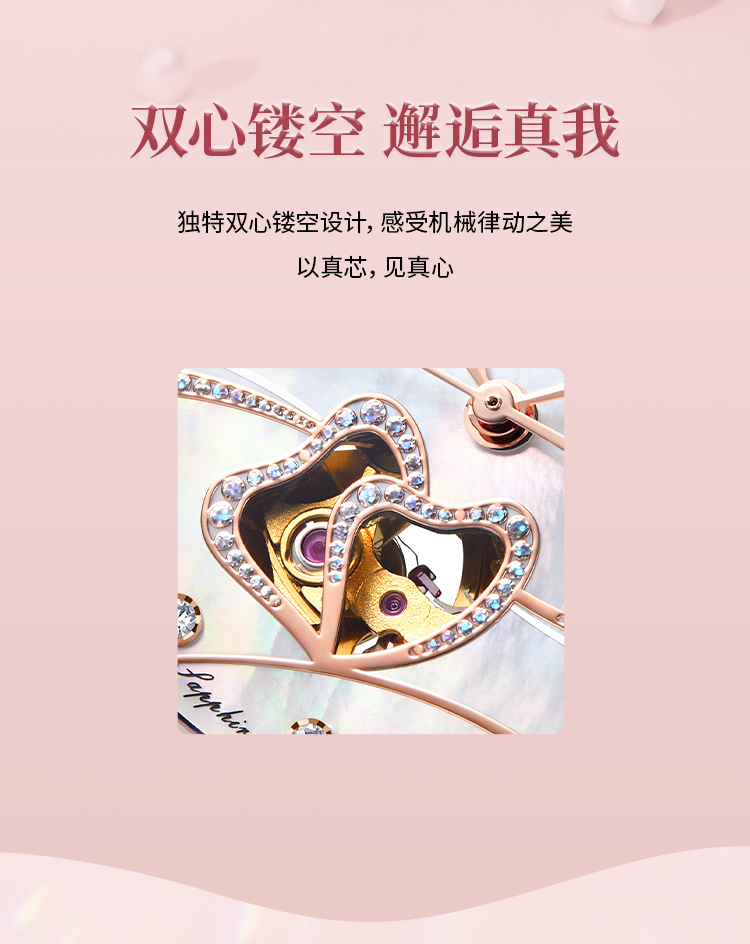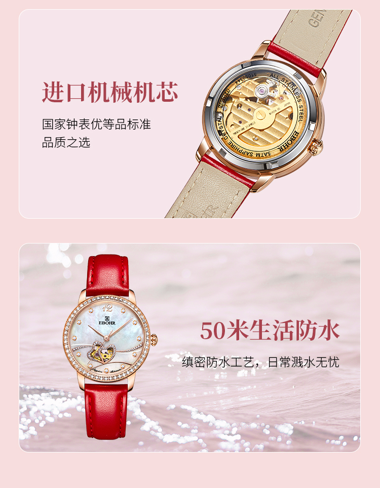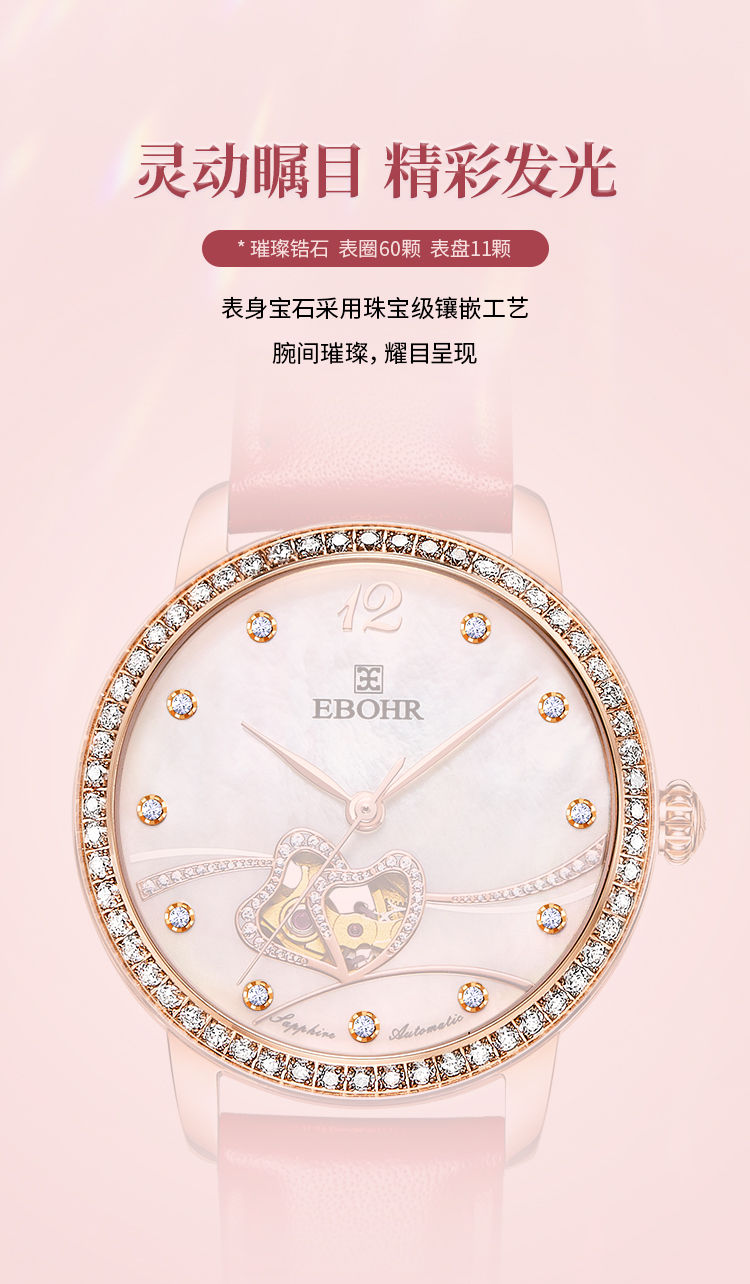 依波(EBOHR)手表七夕情人节简约女士气质生日情侣男款防水送老婆520礼物女友钢带镂空自动机械腕表 双心镂空机械女表 51050344