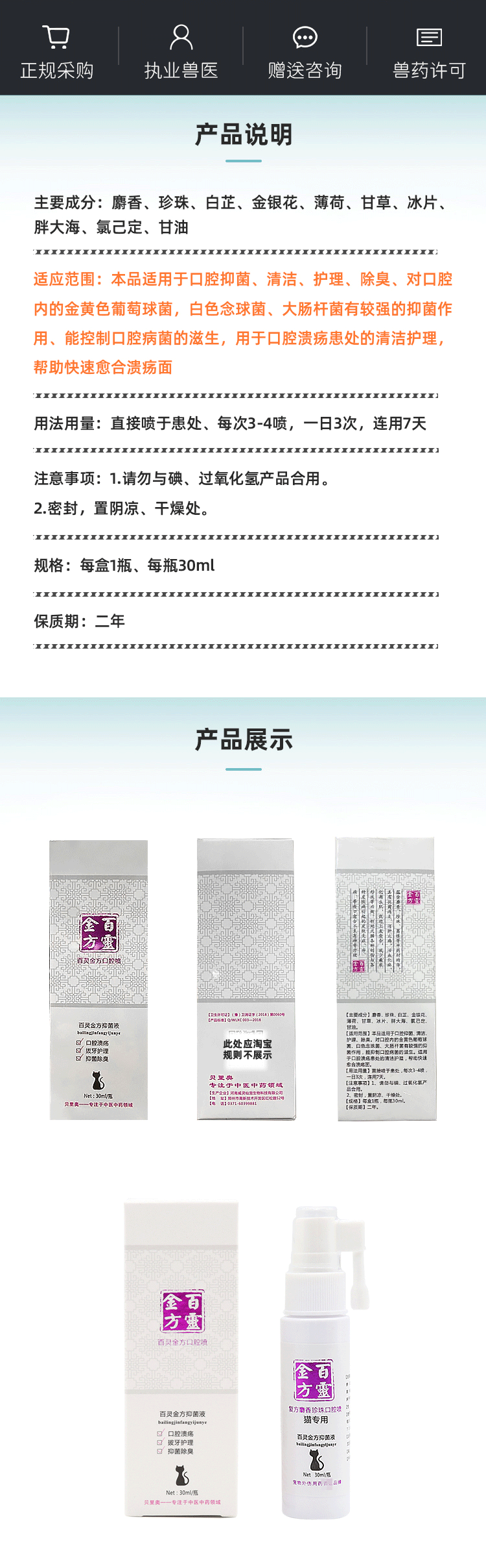 百灵金方 口腔喷剂 猫咪/狗狗 口炎 牙龈炎 口臭 抑菌除臭 口腔溃疡瓶装 30ml