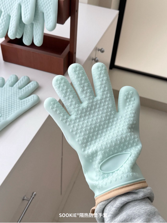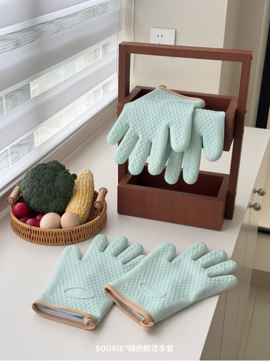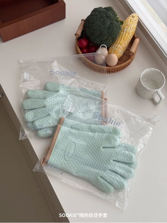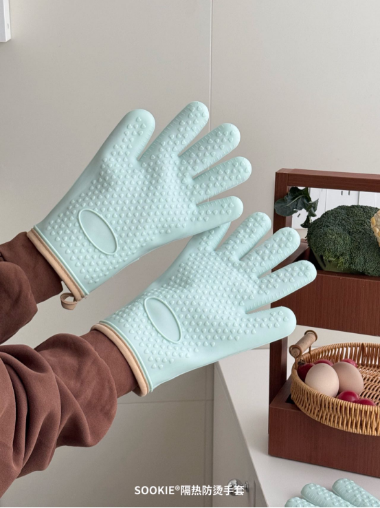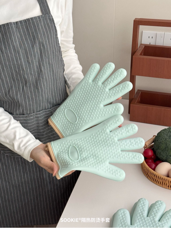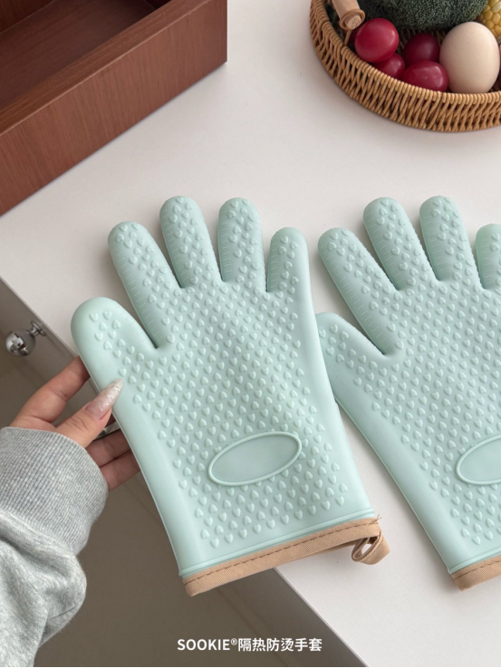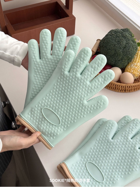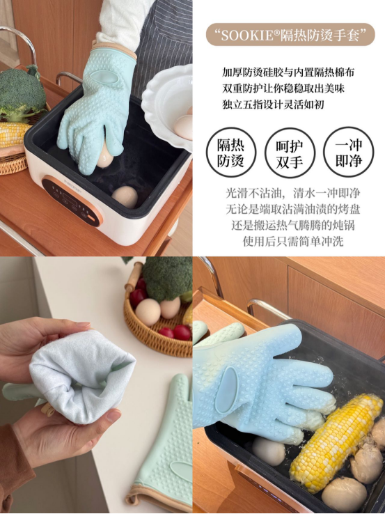 【为什么万千主厨都选SOOKIE®隔热手套?】 同样是隔热手套,我们用心更多一点! SOOKIE®不仅采用加厚防烫硅胶与内置隔热棉布打造双重防护,更在细节处见真章:独立五指设计让抓握灵活自如,防滑纹理确保取物稳如泰山,食品级材质遇油污一冲即净。 与传统手套相比,我们既避免了布艺易吸油难清洁的尴尬,又解决了普通硅胶手套易滑落的隐患。 经实验室测试,可抵御350℃高温,让您从容应对烤箱、蒸锅、空气炸锅等多种烹饪场景。 选择SOOKIE®,选择的不仅是一双手部护具,更是安心下厨的智慧之选!