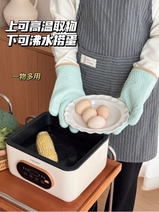 独立五指设计在双层防护下依然灵活自如 端取滚烫锅具稳如泰山 从烤箱到蒸锅,从灶台到餐桌 每一处可能烫伤的瞬间都有SOOKIE®贴心守护 让热腾腾的美食安全上桌,把烫手风险彻底隔绝在外。